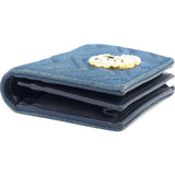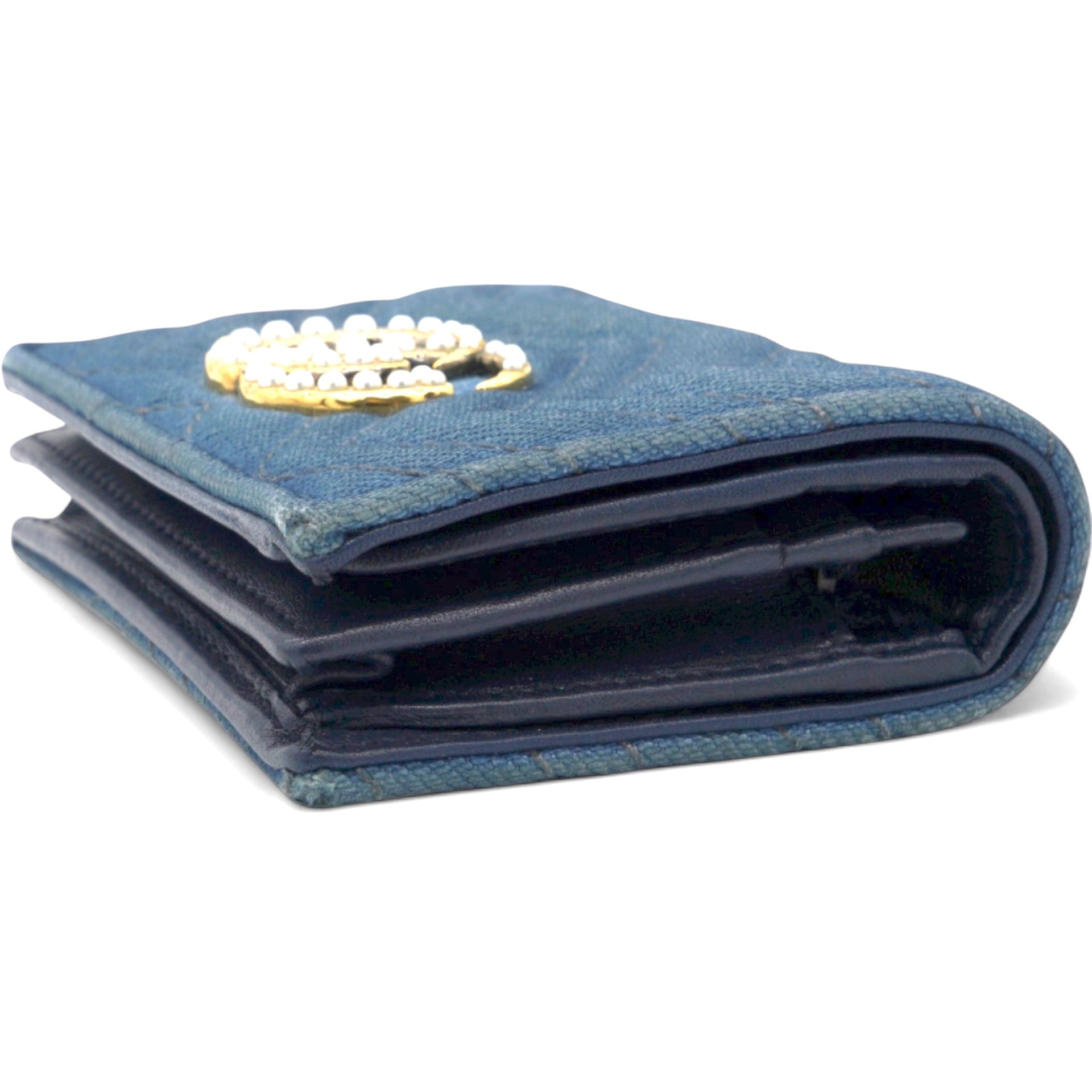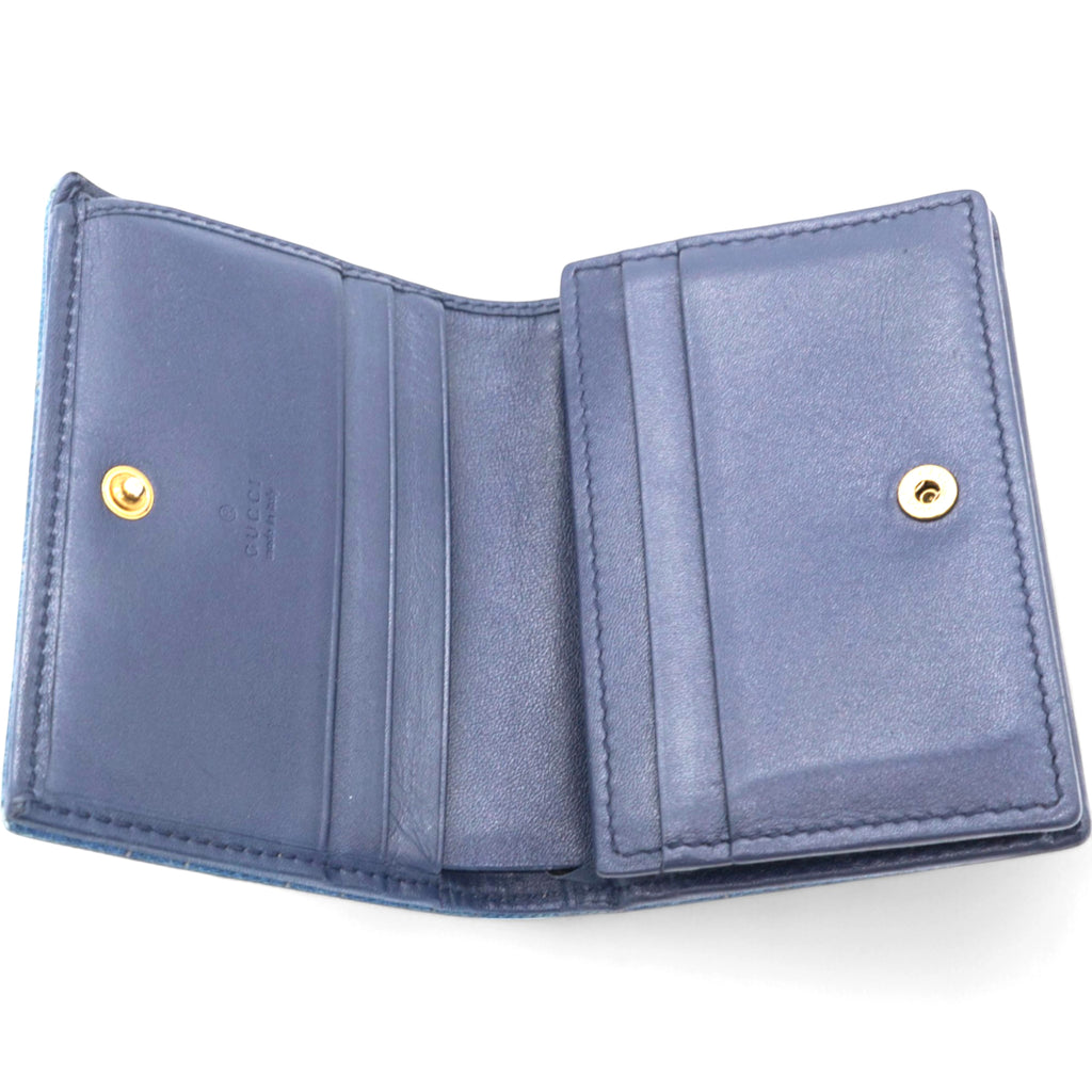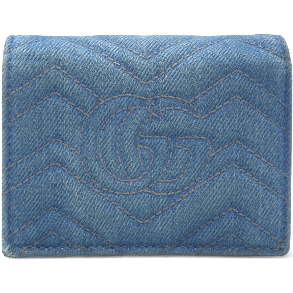 | This stylish wallet is crafted of soft chevron quilted blue denim and features an aged gold and faux pearl GG monogram on the front. The flap opens to a blue leather interior with one bill compartment, card slots, and a zip pocket. |
