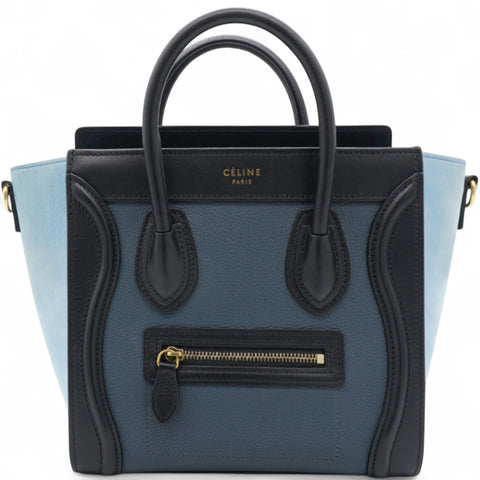 | This stylish bag is crafted of leather in blue. This bag features lighter blue nubuck sides, black leather trim, rolled leather top handles, an optional shoulder strap, and brass hardware. The top zipper opens to a black leather interior with a patch pocket. Enjoy this versatile bag with the distinctive style of Celine! |