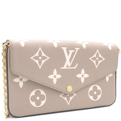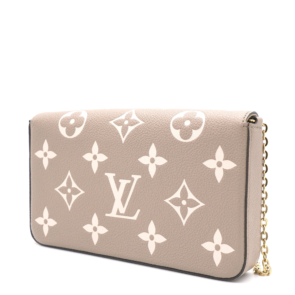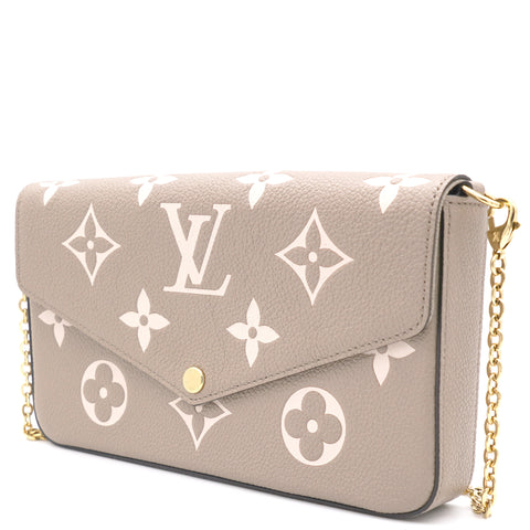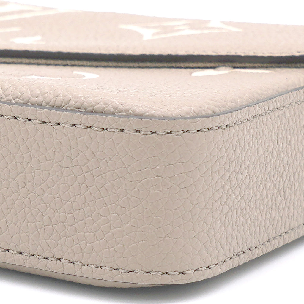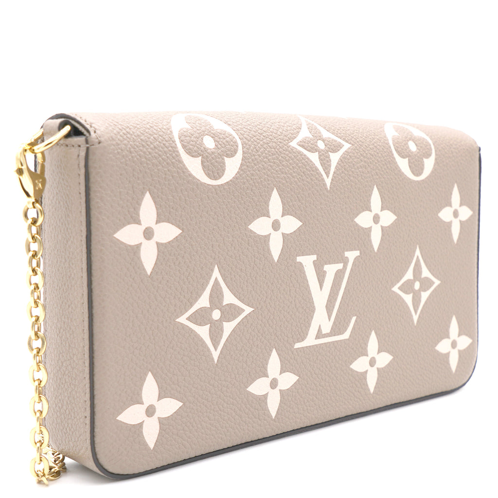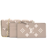 | This stylish wallet is crafted of Louis Vuitton monogram empreinte leather in beige and creme. This stylish shoulder bag features an optional brass chain-link shoulder strap and an envelope style facing flap. This opens to a matching fabric interior with a zipper insert and a card holder insert. |