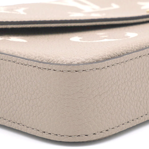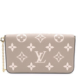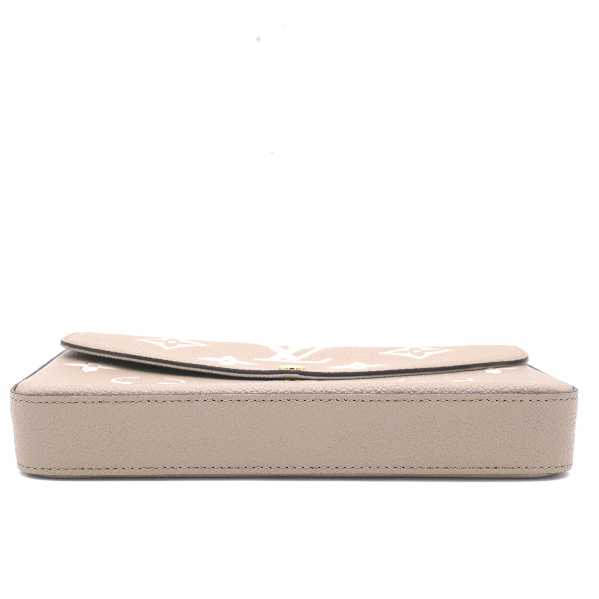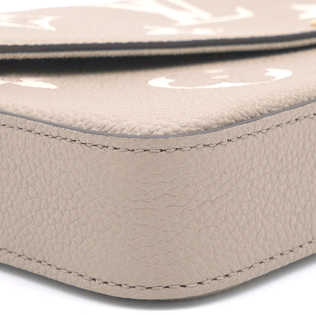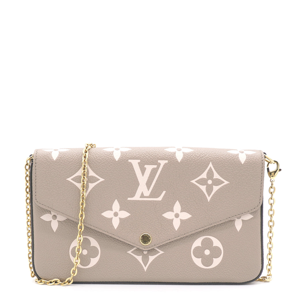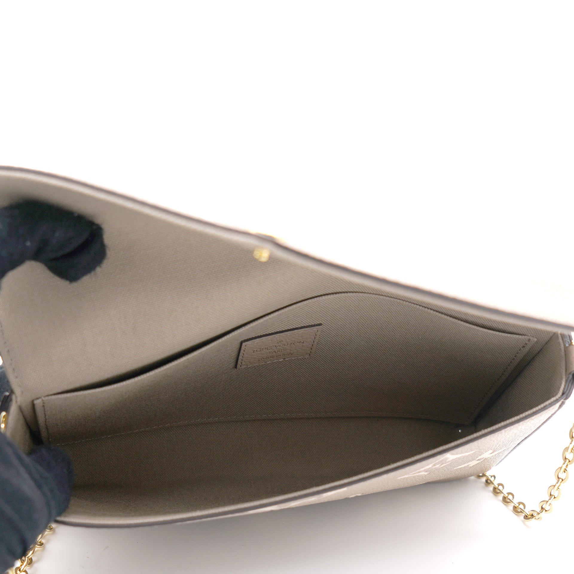| This stylish wallet is crafted of Louis Vuitton monogram empreinte leather in beige and creme. This stylish shoulder bag features an optional brass chain-link shoulder strap and an envelope style facing flap. This opens to a matching fabric interior with a zipper insert and a card holder insert. |