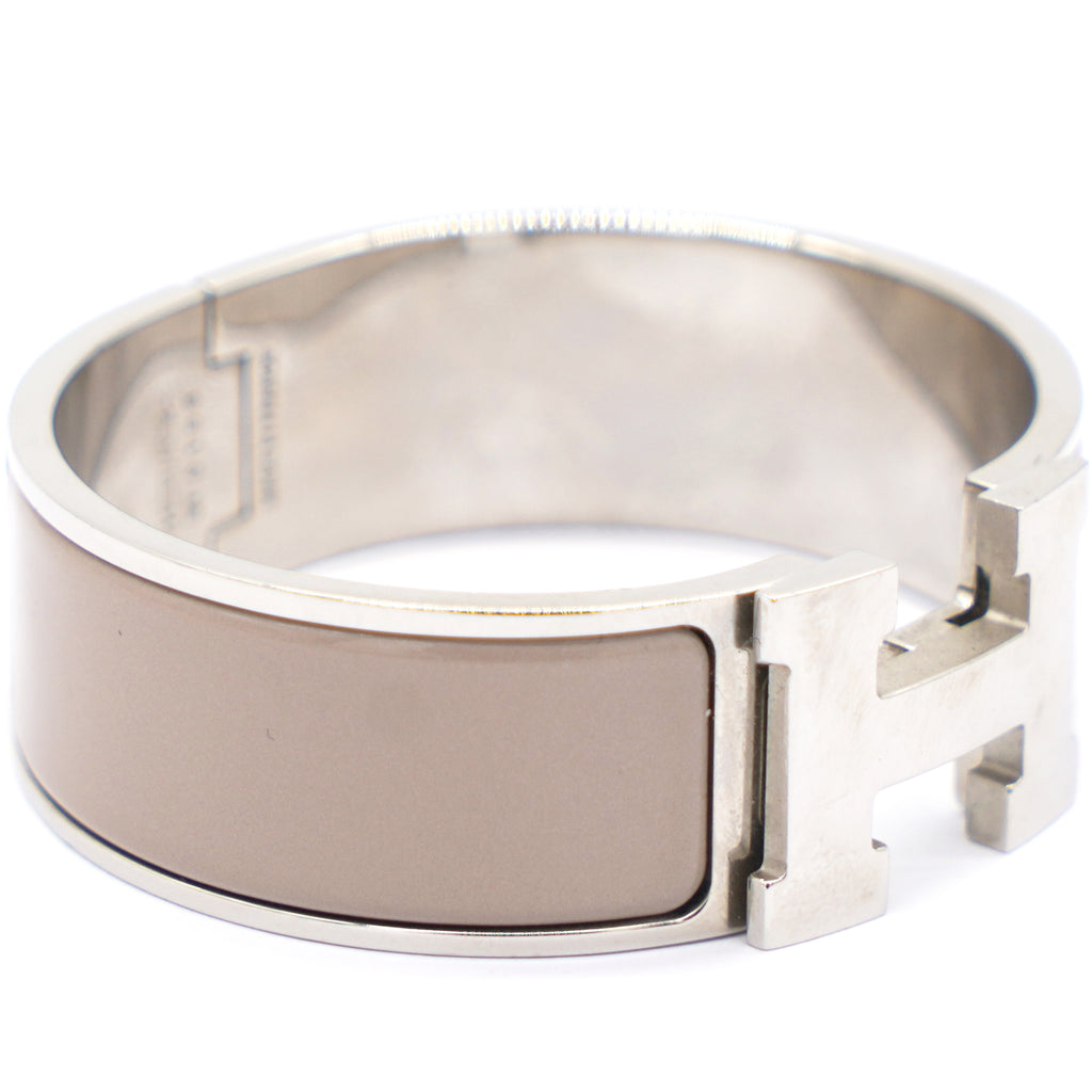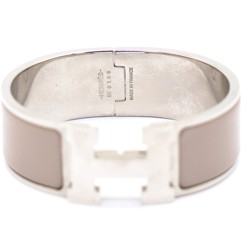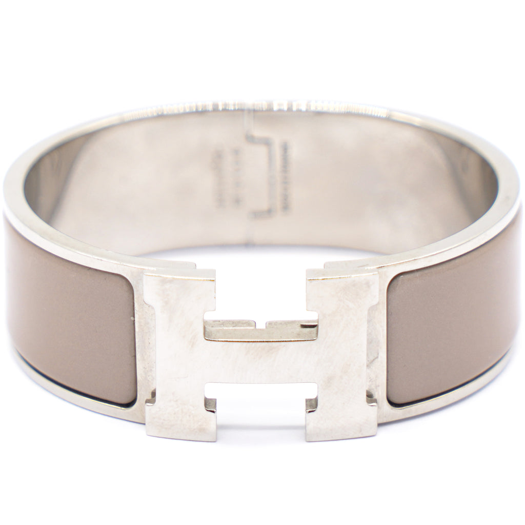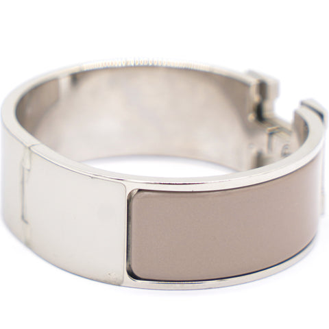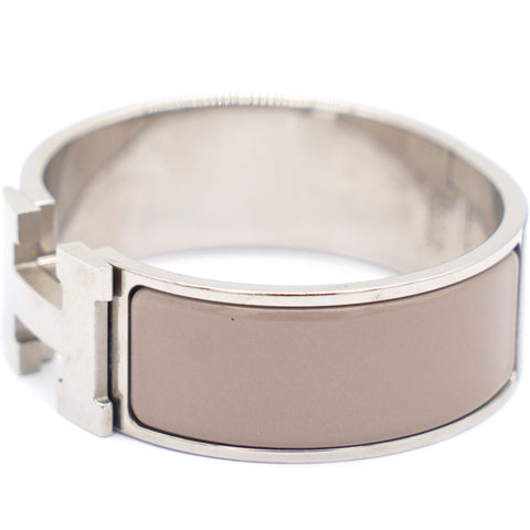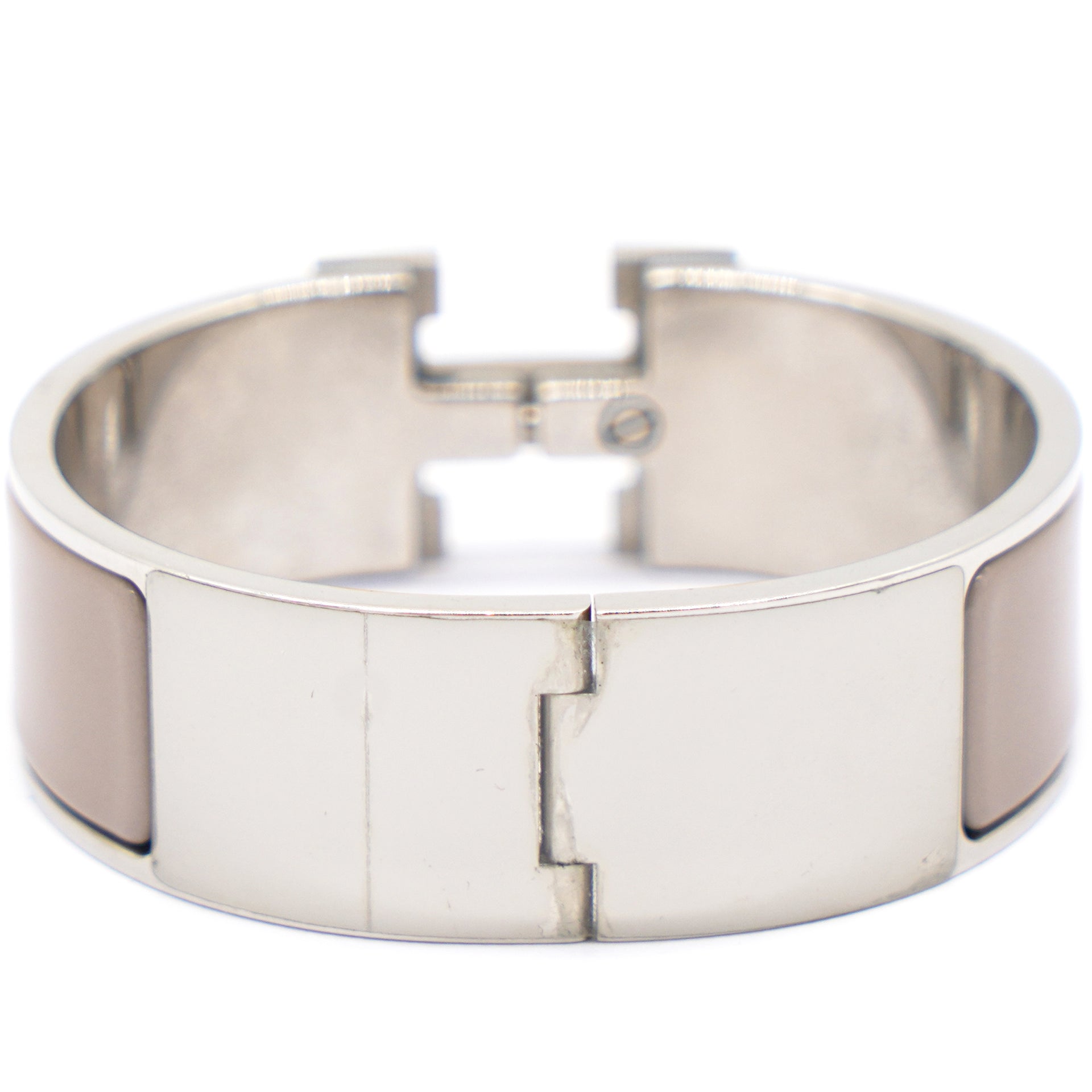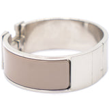 | This is a chic bracelet from Hermes that is classic yet very modern. It is a palladium band with a hinge on one side that opens with a swivel Hermes "H" on the prominent side. Around the band is a strip of grey beige enamel. |