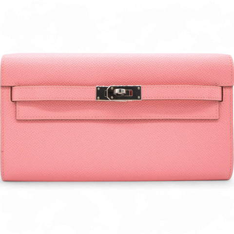 | This chic wallet is crafted of fine Epsom calfskin leather in light pink. The wallet features a front flap, strap, and signature Kelly palladium plated turn-lock. This opens to a partitioned leather interior with card slots, patch pockets, a detachable strap, and a pocket. . |