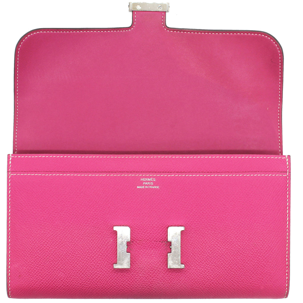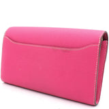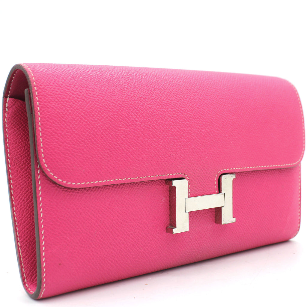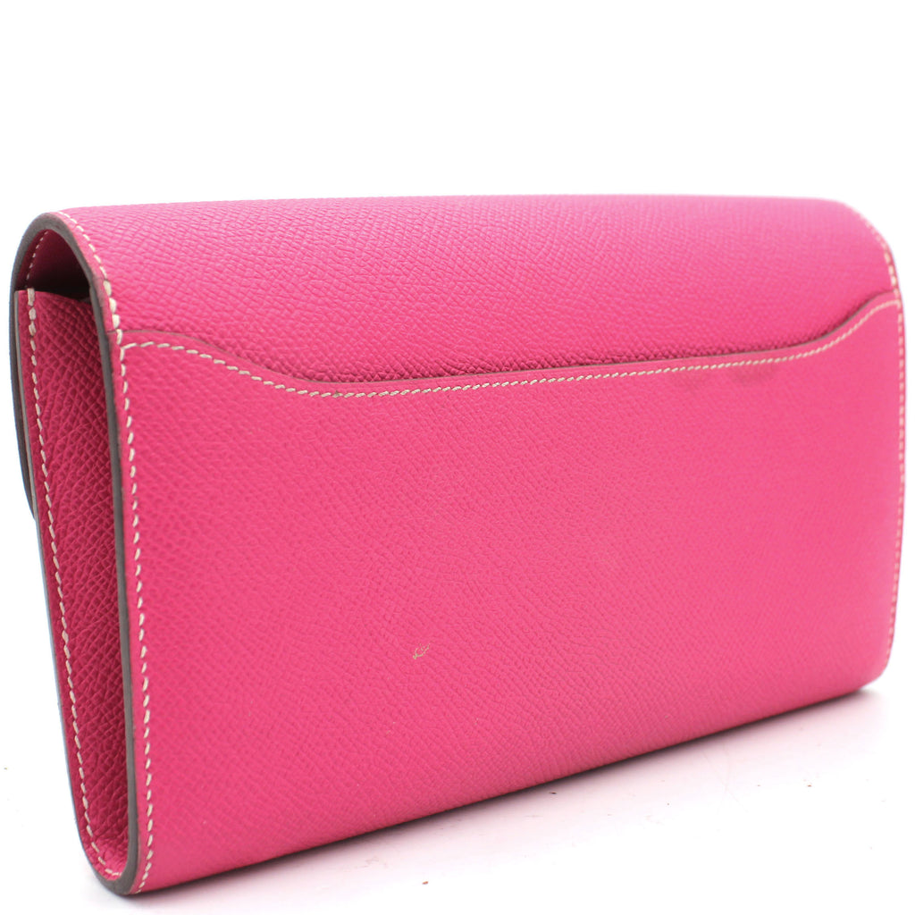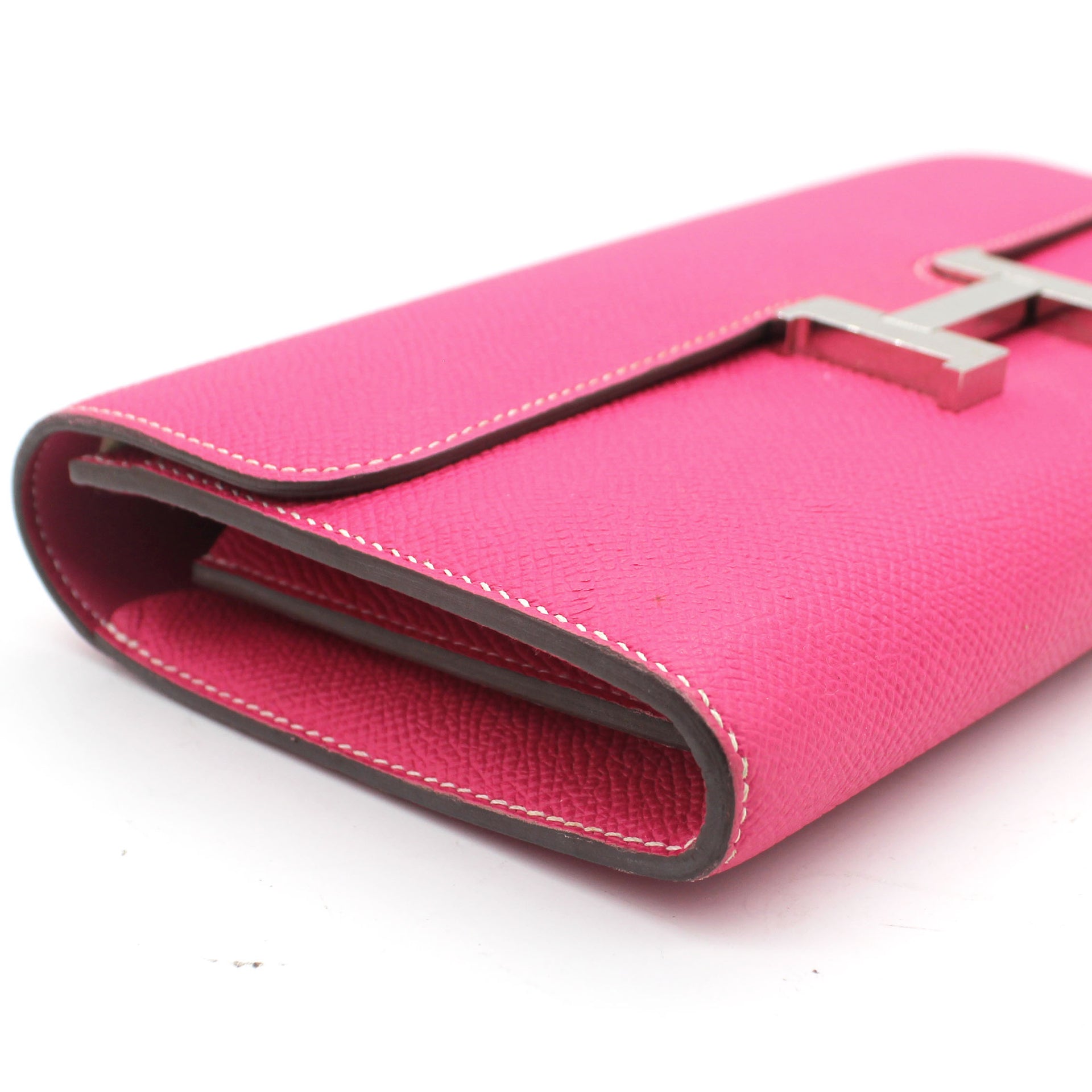 | This wallet is finely crafted of epsom leather in pink. The front flap opens with a palladium plated Hermes "H" clasp to a partitioned leather interior with a card slot panel on either side and a zipper compartment in the center. |