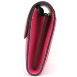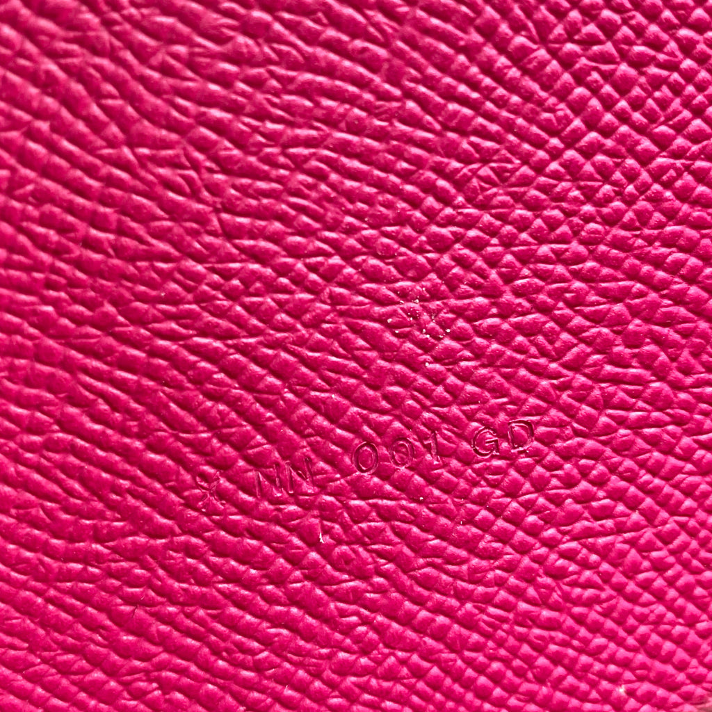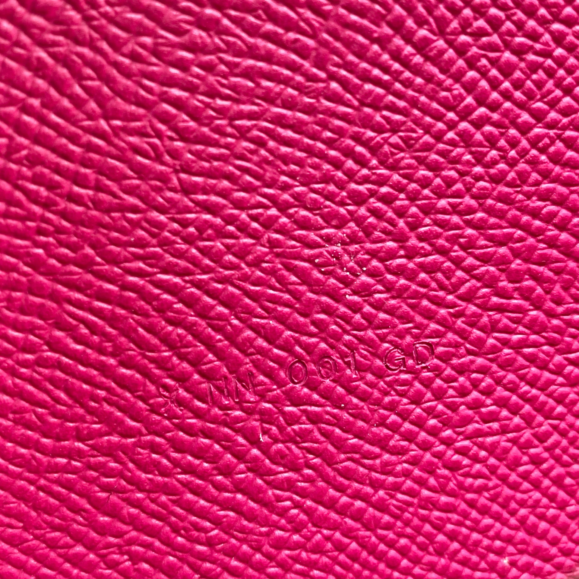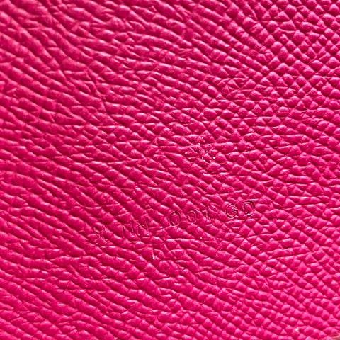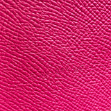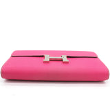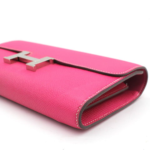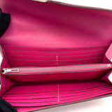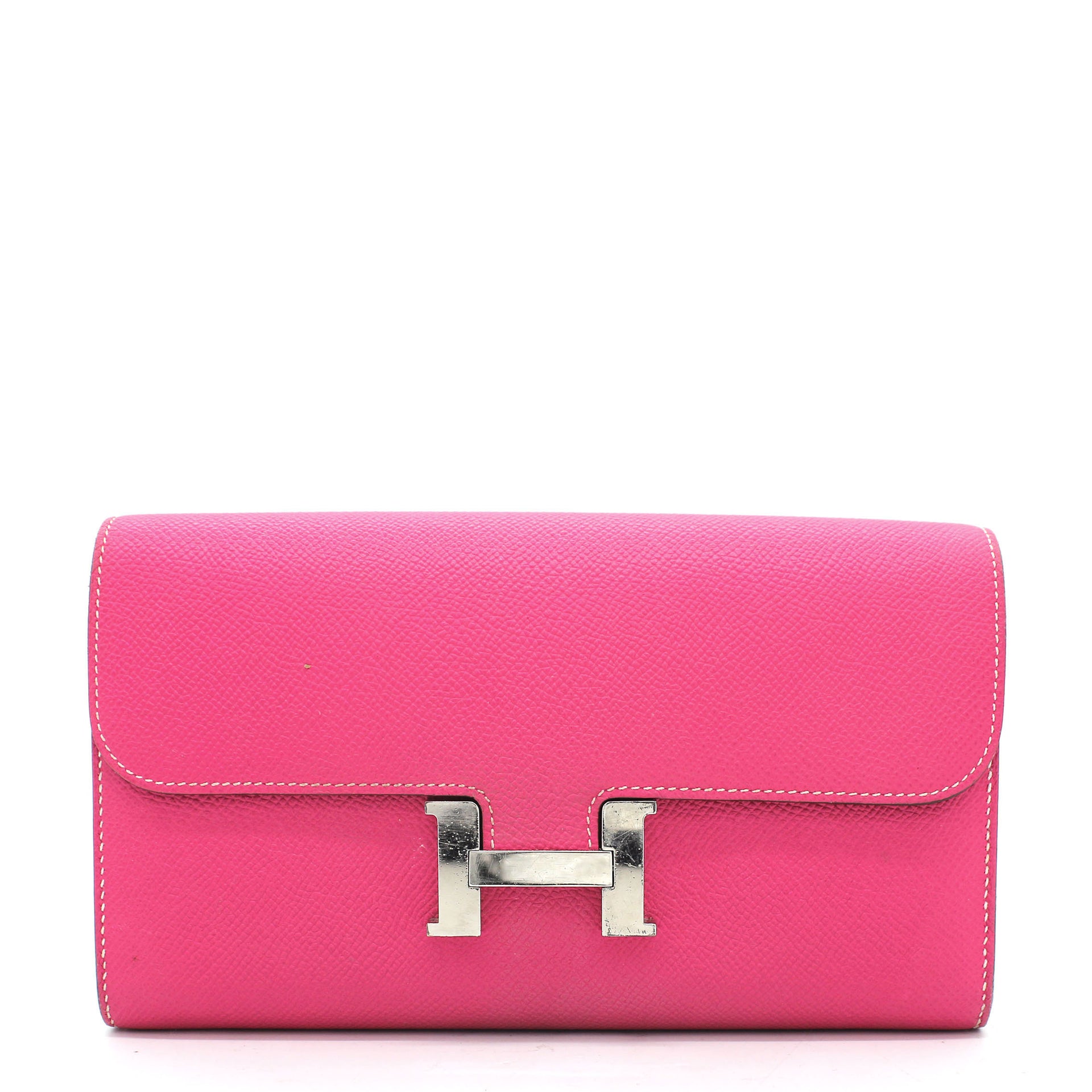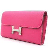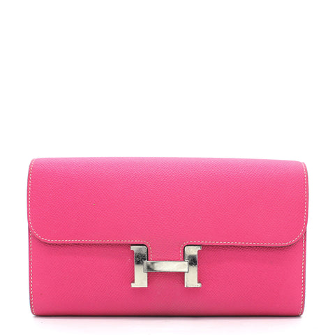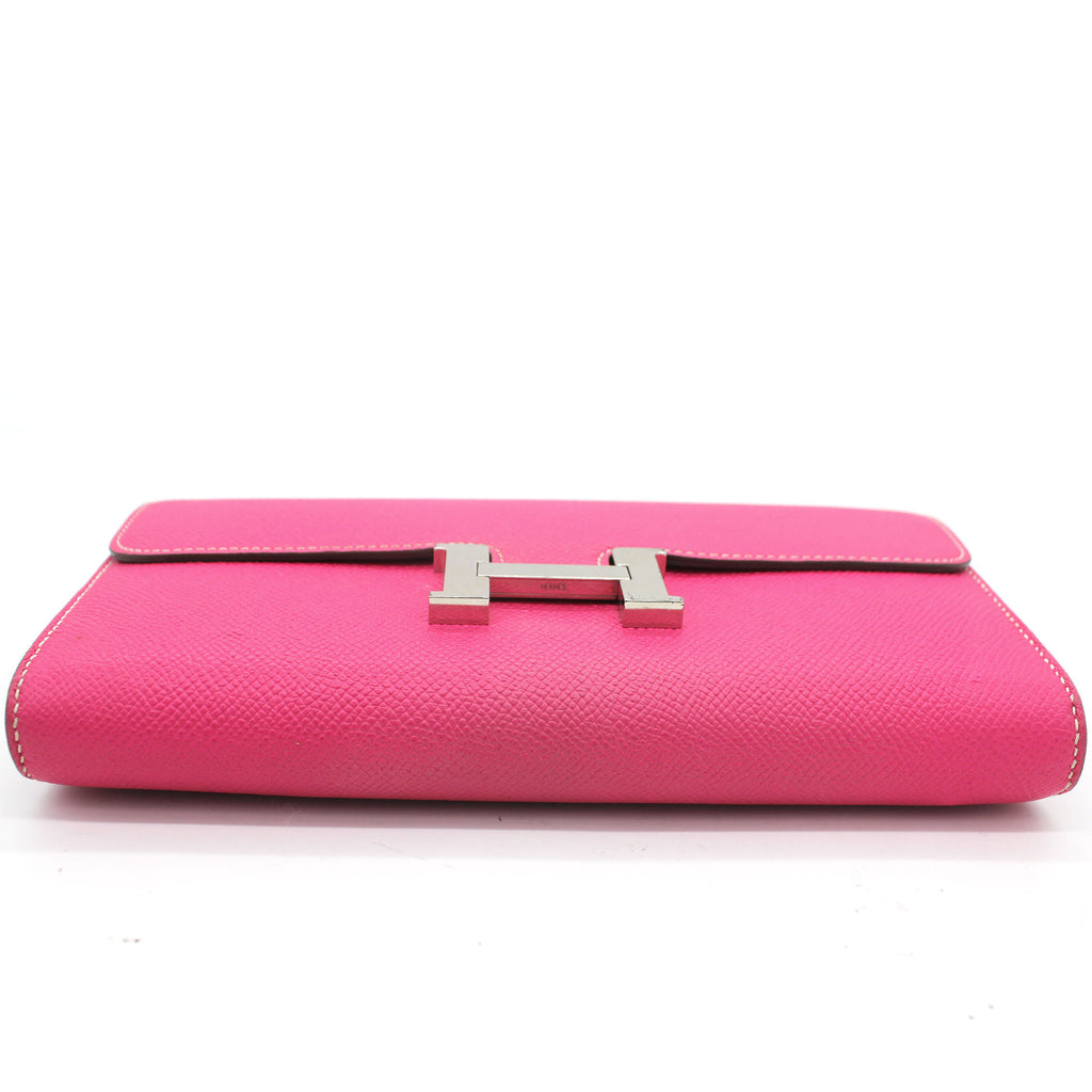 | This wallet is finely crafted of epsom leather in pink. The front flap opens with a palladium plated Hermes "H" clasp to a partitioned leather interior with a card slot panel on either side and a zipper compartment in the center. |
