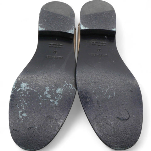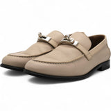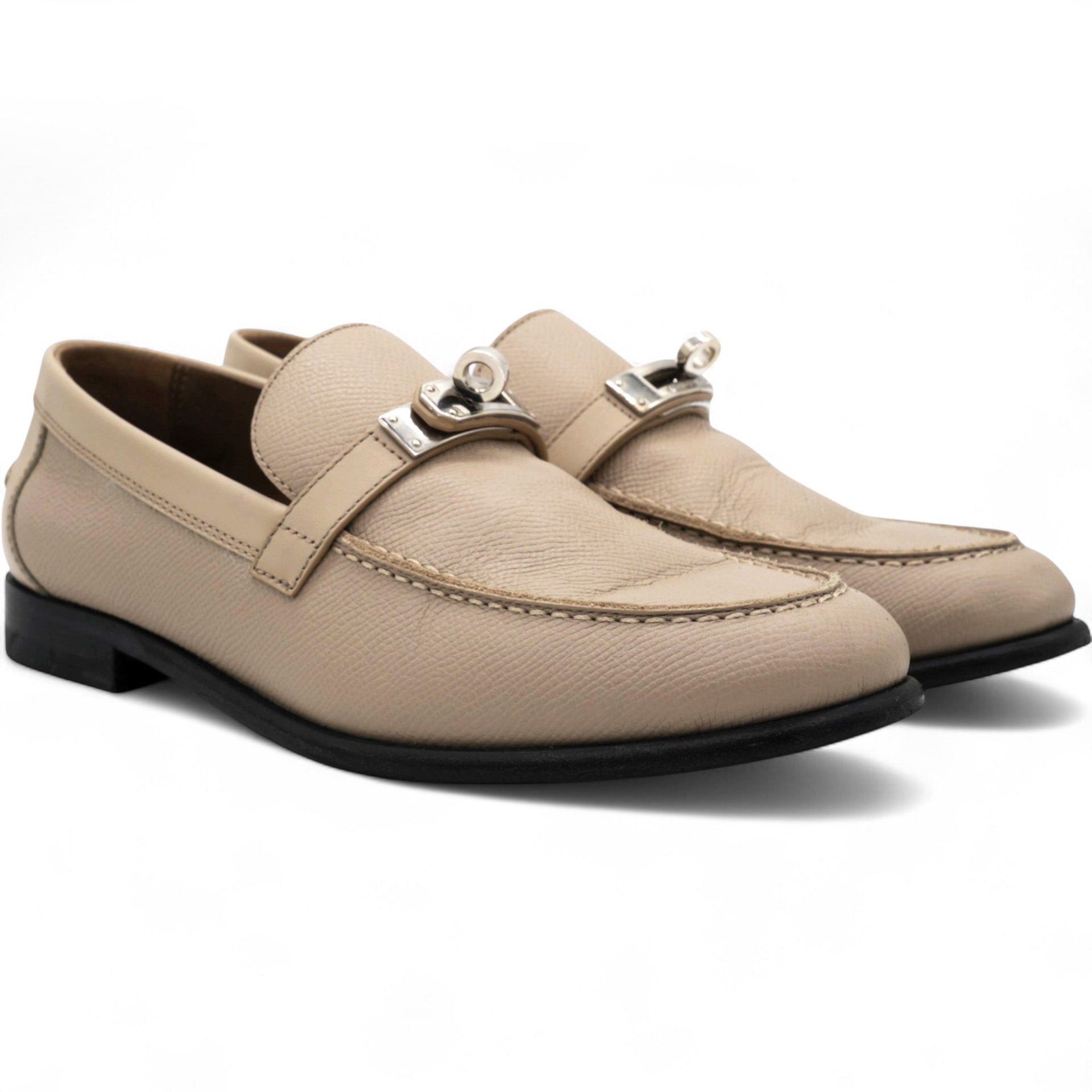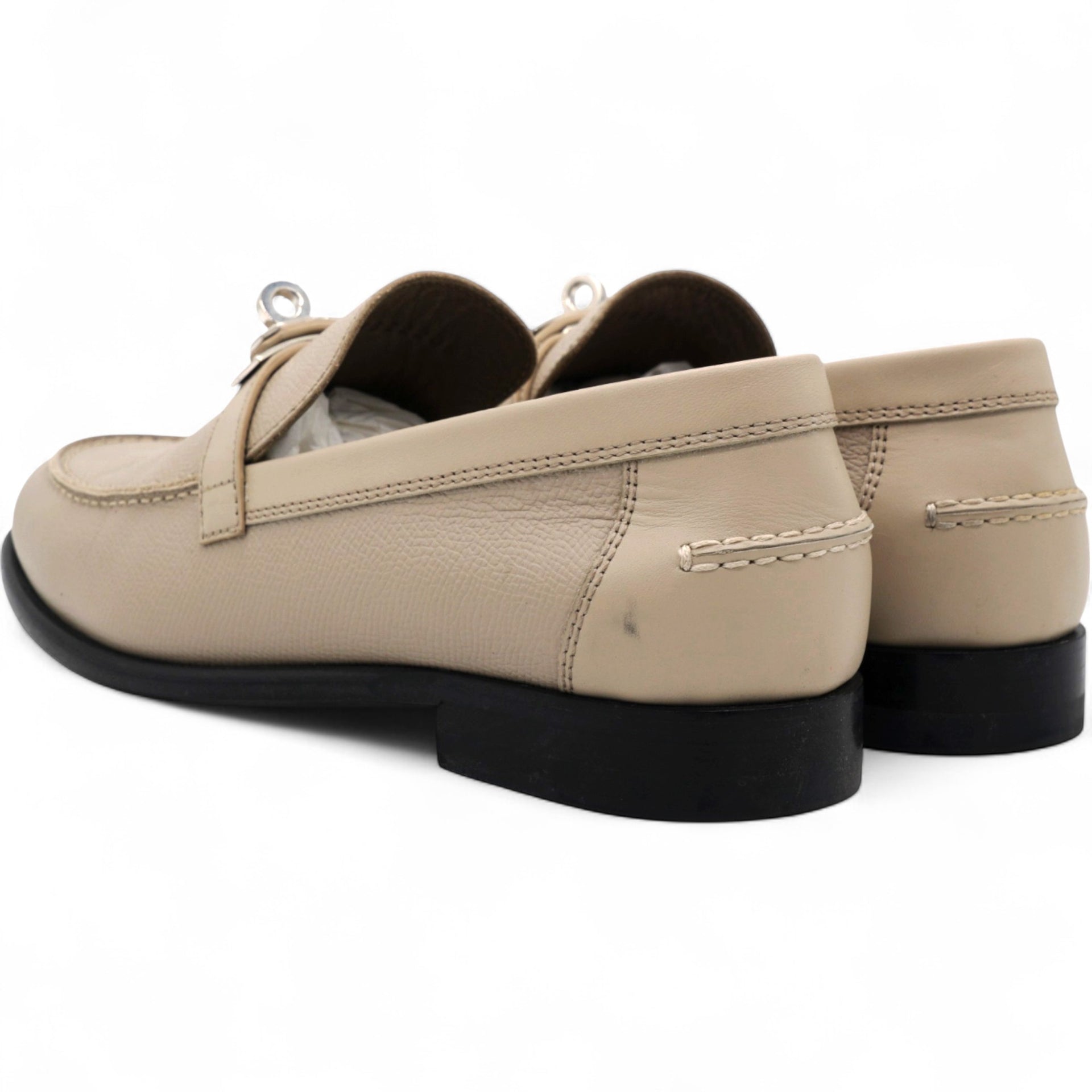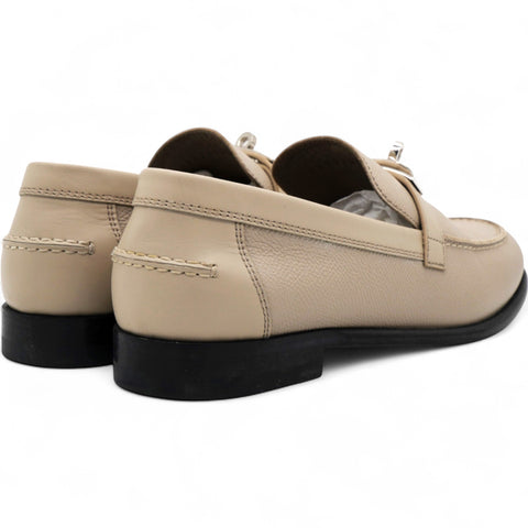 | These stylish loafers are crafted of grained taupe leather with palladium hardware and a 0.75-inch heel. |