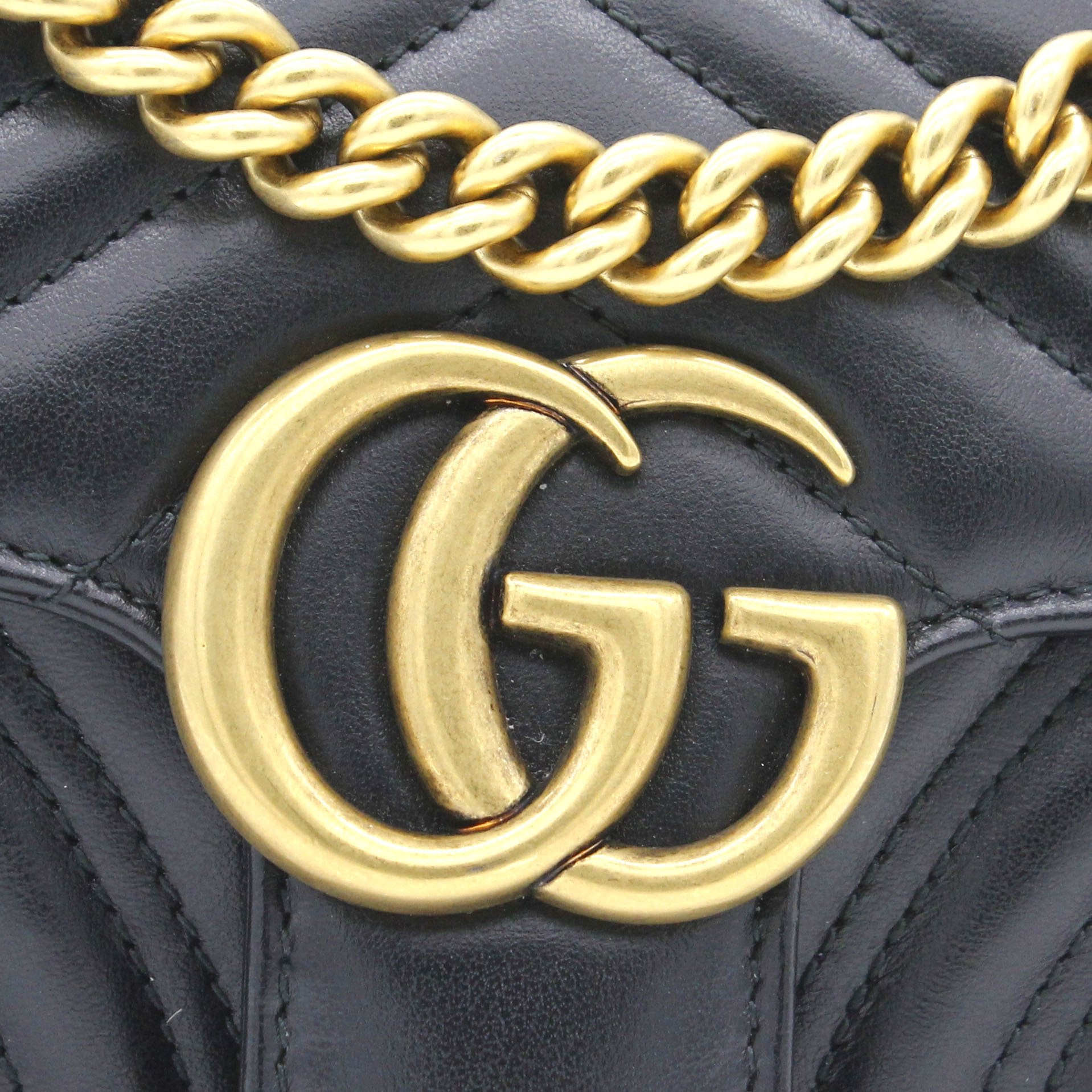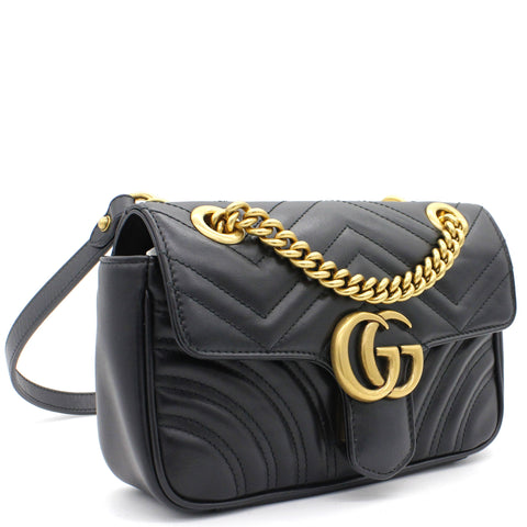 | The small GG Marmont flap bag has a softly structured shape and an flap closure with Double G hardware. The sliding chain strap can be worn multiple ways, changing between a shoulder and a top handle bag. Made in matelassé chevron leather with a heart on the back. |