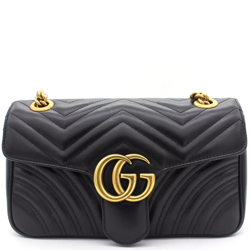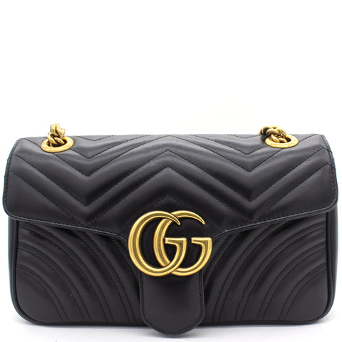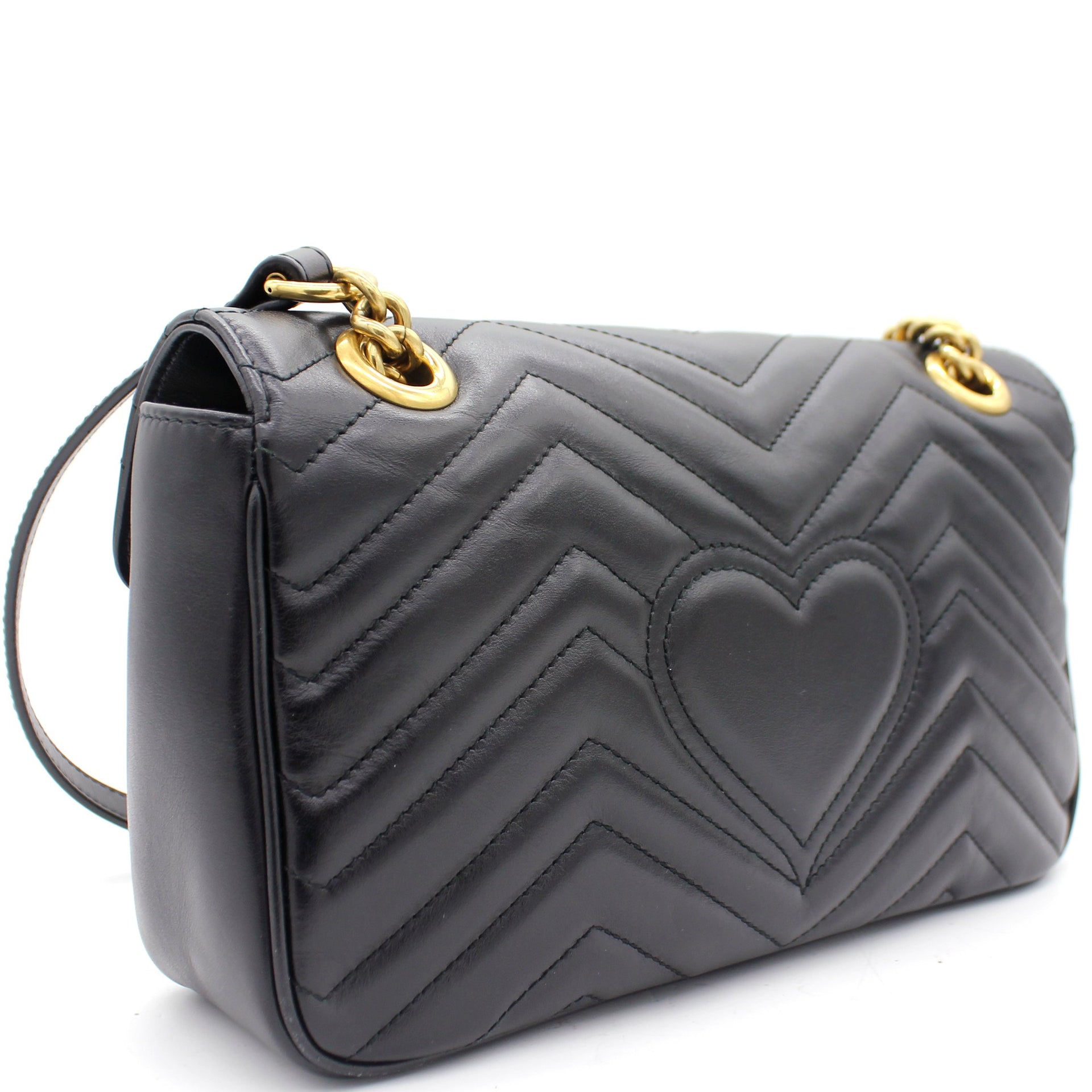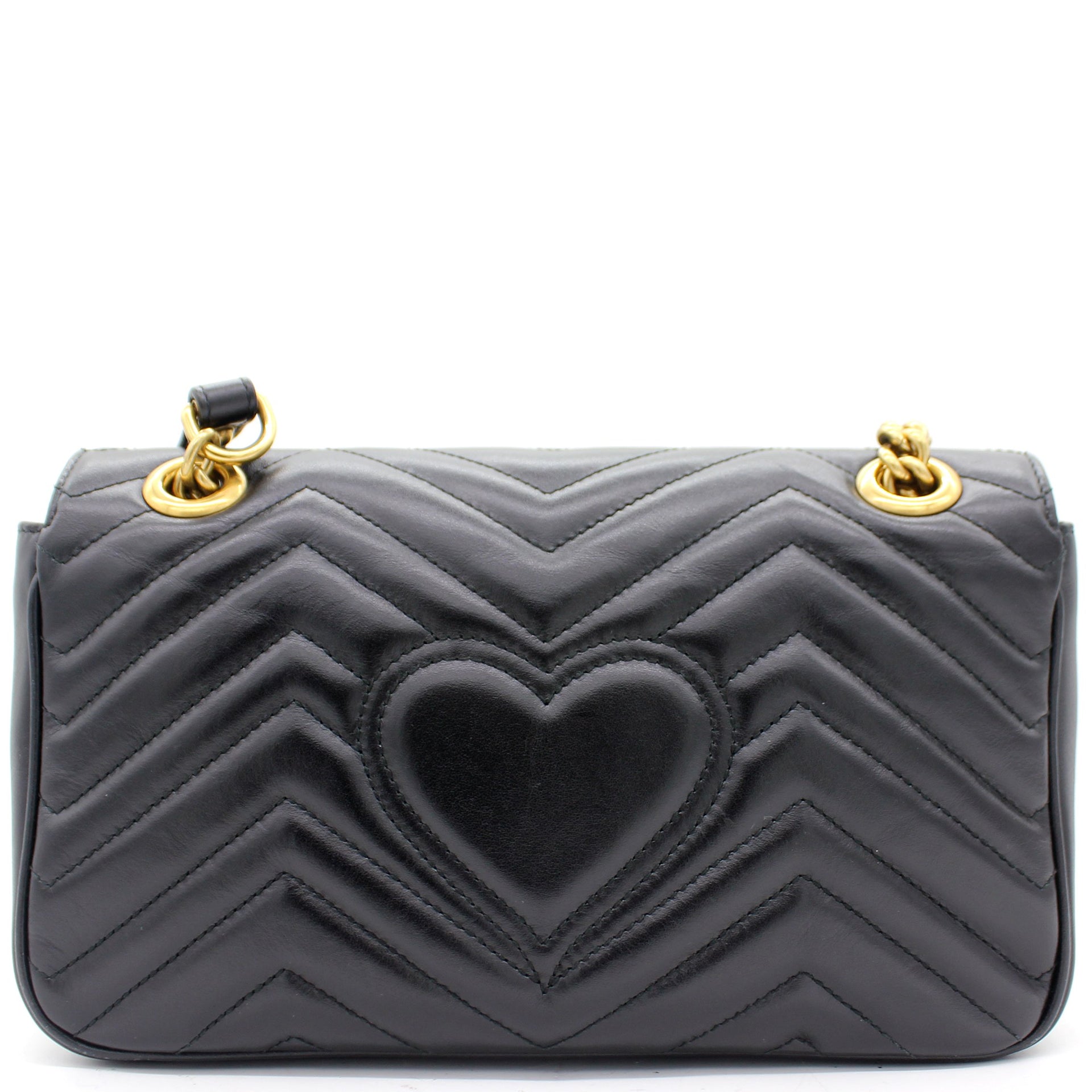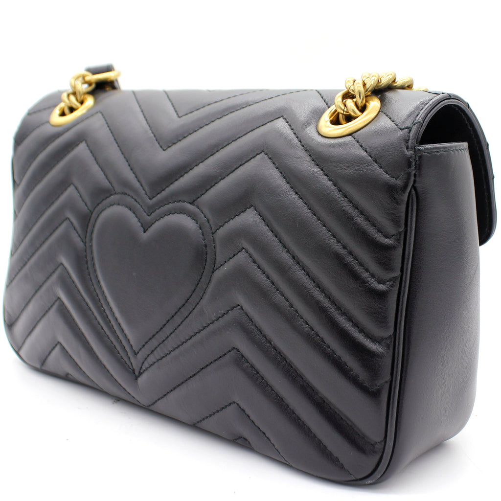 The small GG Marmont chain shoulder bag has a softly structured shape and an oversized flap closure with Double G hardware. The sliding chain strap can be worn multiple ways, changing between a shoulder and a top handle bag. Made in matelassé chevron leather with a heart on the back.