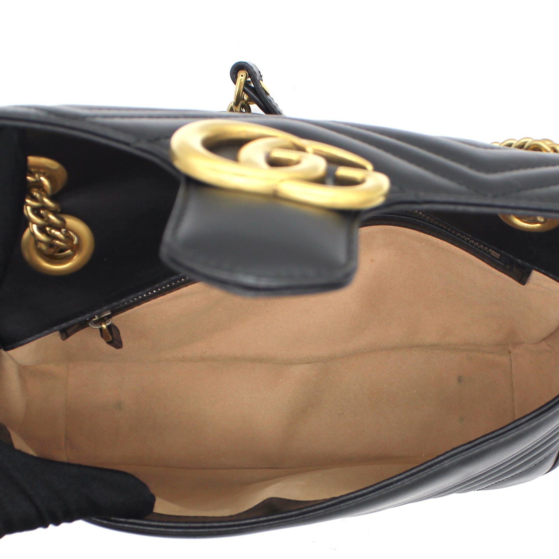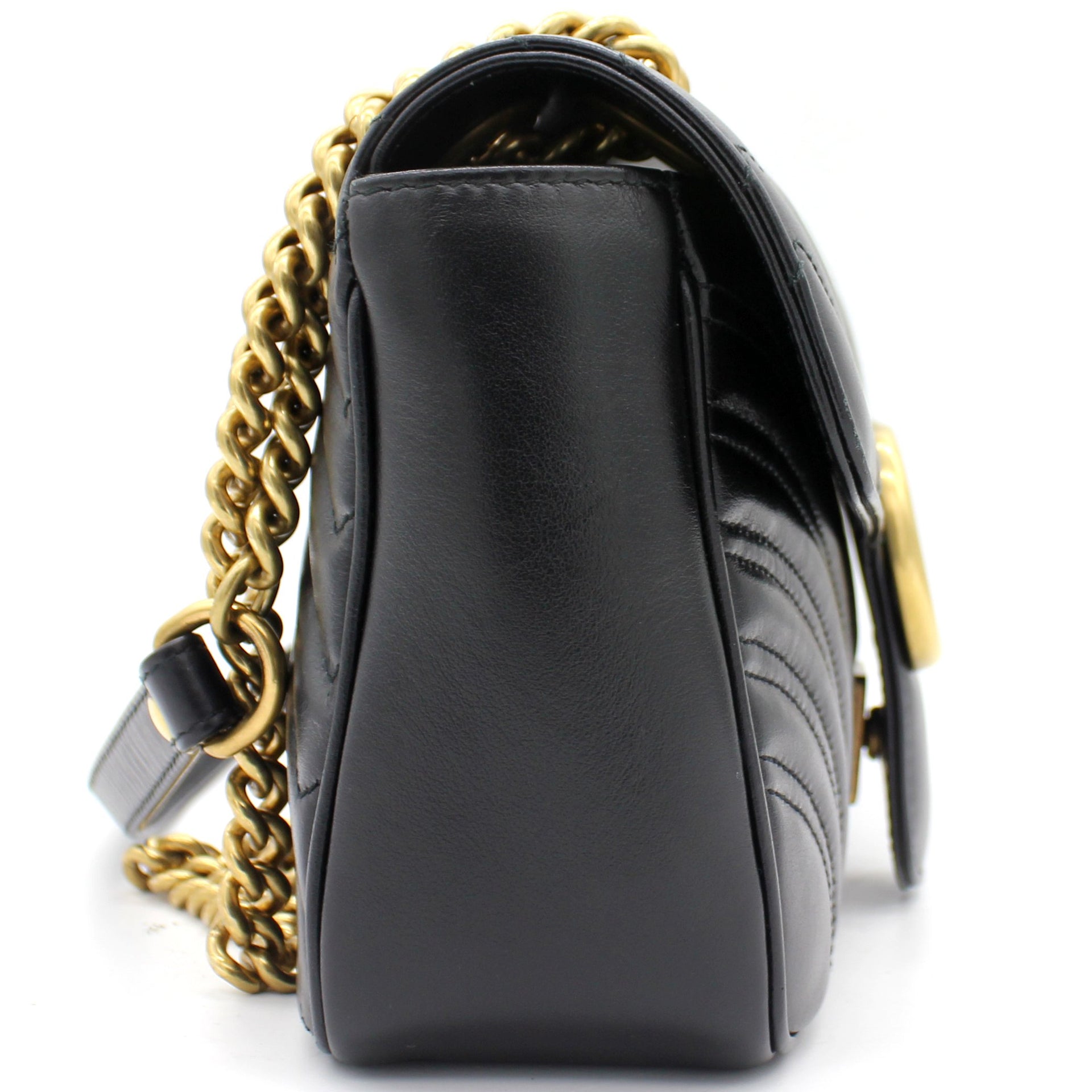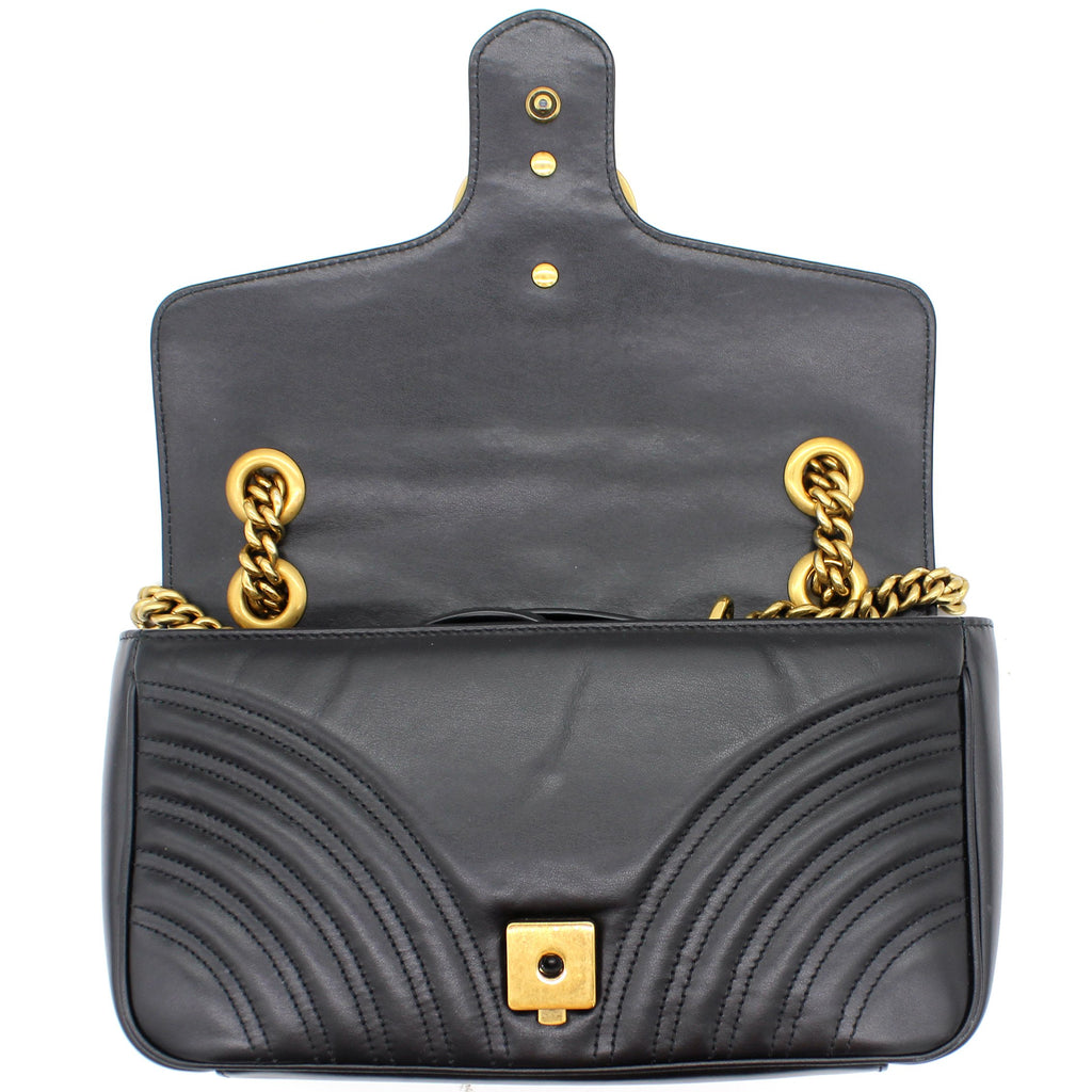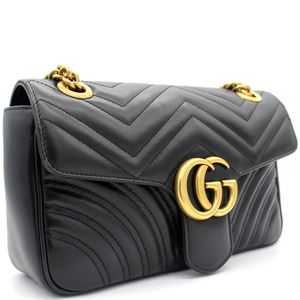 The small GG Marmont chain shoulder bag has a softly structured shape and an oversized flap closure with Double G hardware. The sliding chain strap can be worn multiple ways, changing between a shoulder and a top handle bag. Made in matelassé chevron leather with a heart on the back.