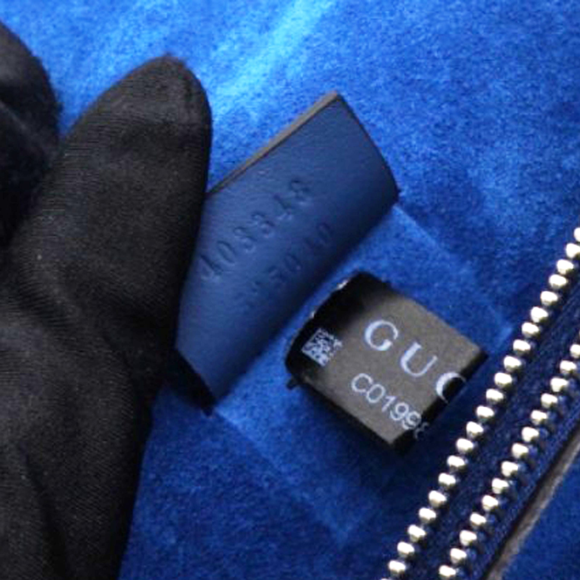 | This stylish bag is crafted of Gucci GG monogram coated canvas accented with blue suede leather trim. This bag features a silver chain shoulder strap and a textured horseshoe closure with tiger heads at the end. This opens to a blue suede and coated canvas interior with a central zipper pocket. |