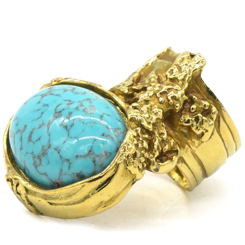 | This luxurious ring features an gold tone metal setting with a polished smooth turquoise stone. This is an excellent ring for everyday use with the classic chic style from Yves Saint Laurent! |