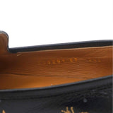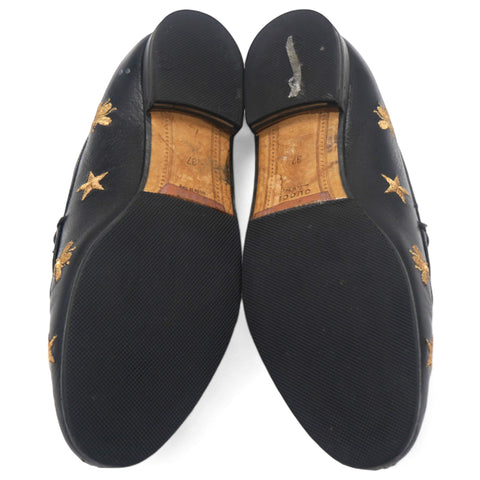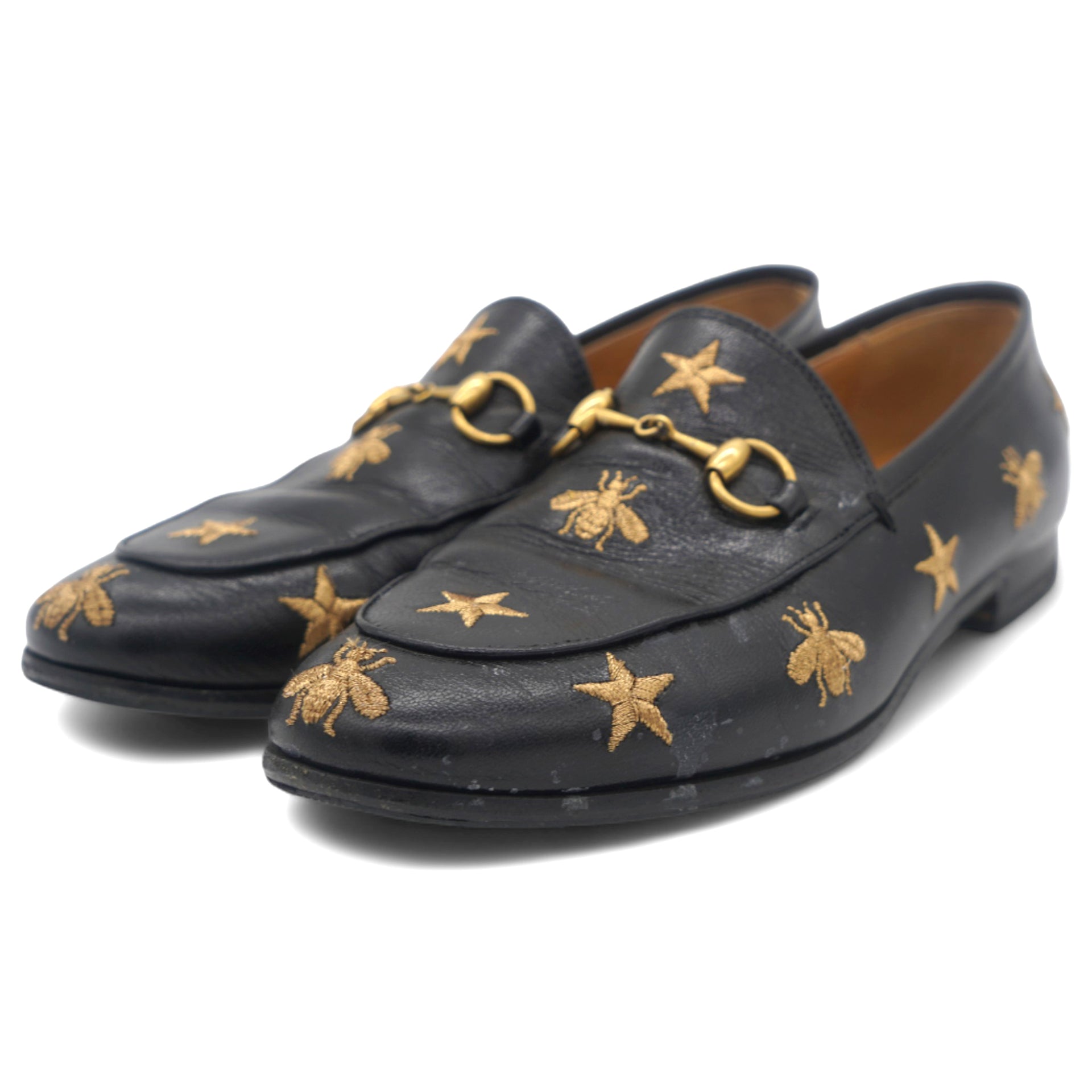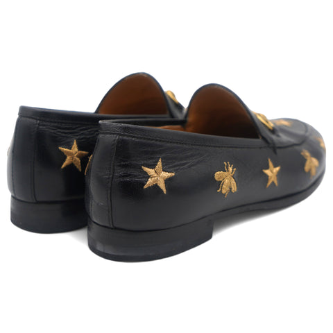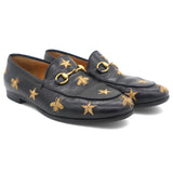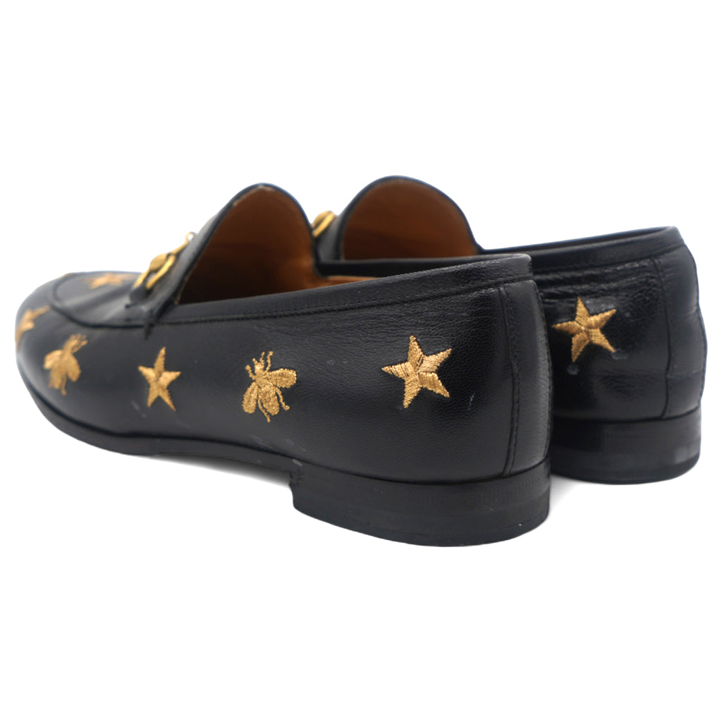 | These chic loafers are crafted of smooth black goatskin leather with stars and bees embroidered all throughout, an aged gold horse-bit embellishment, a rounded toe, and a 0.5 inch stacked heel. |