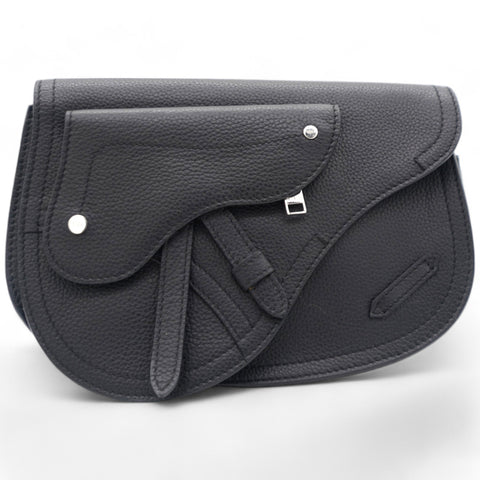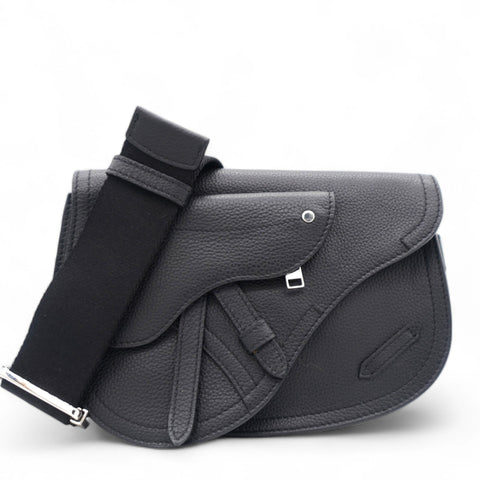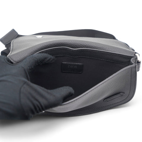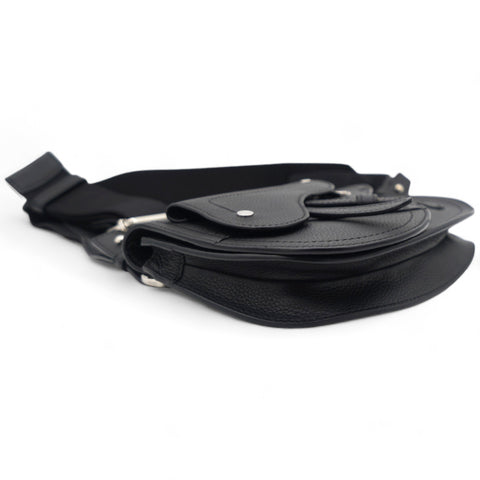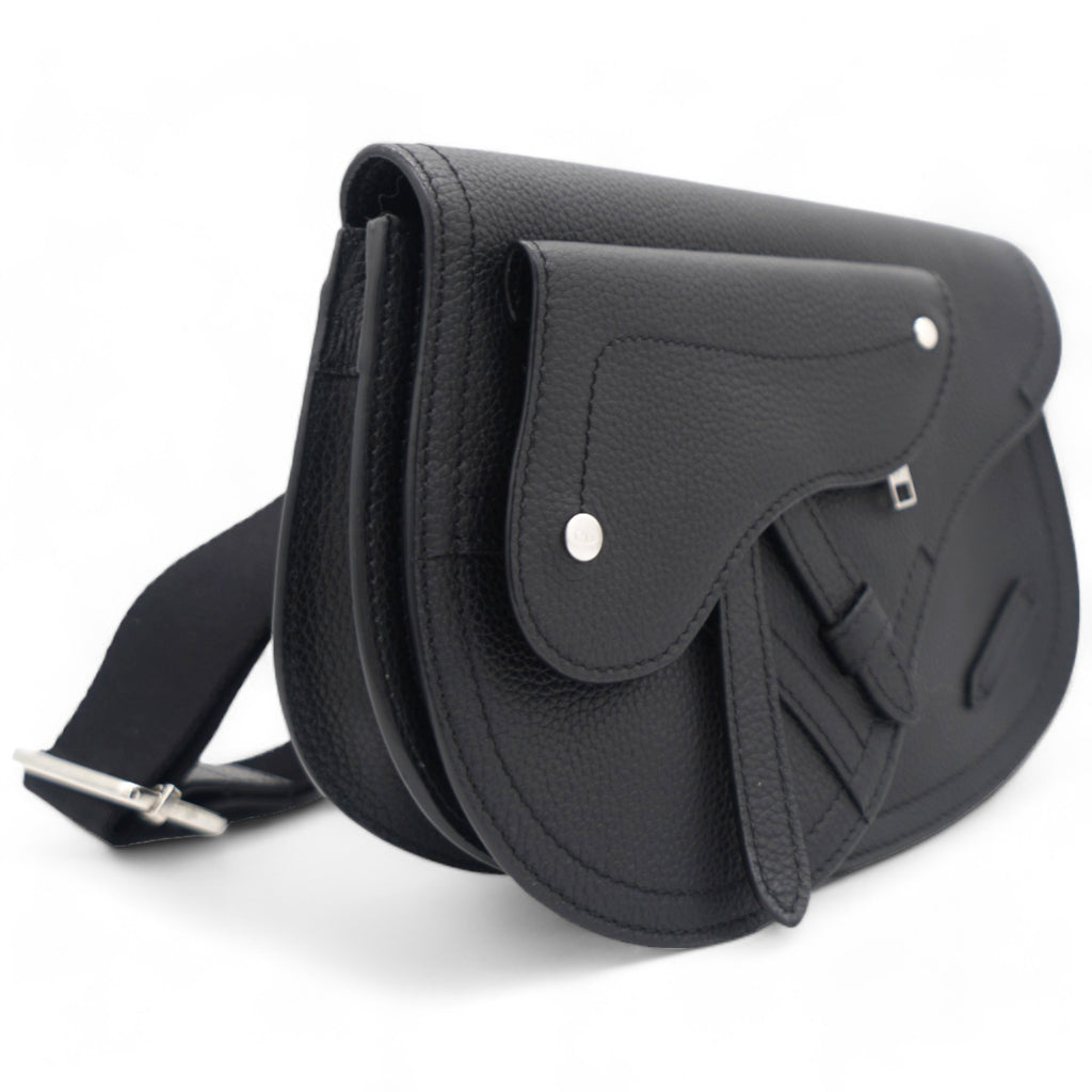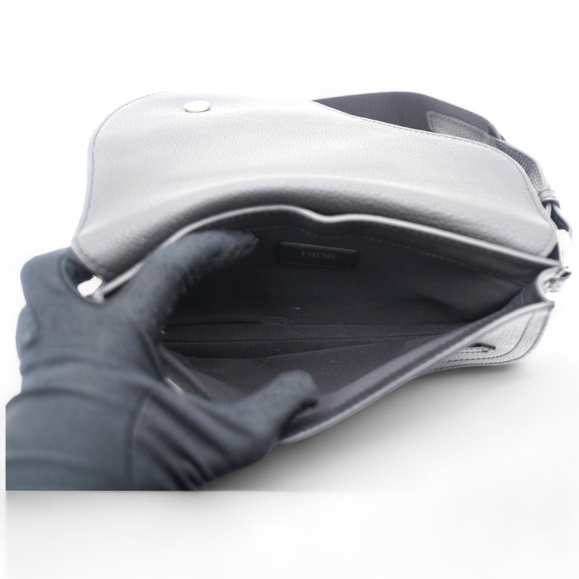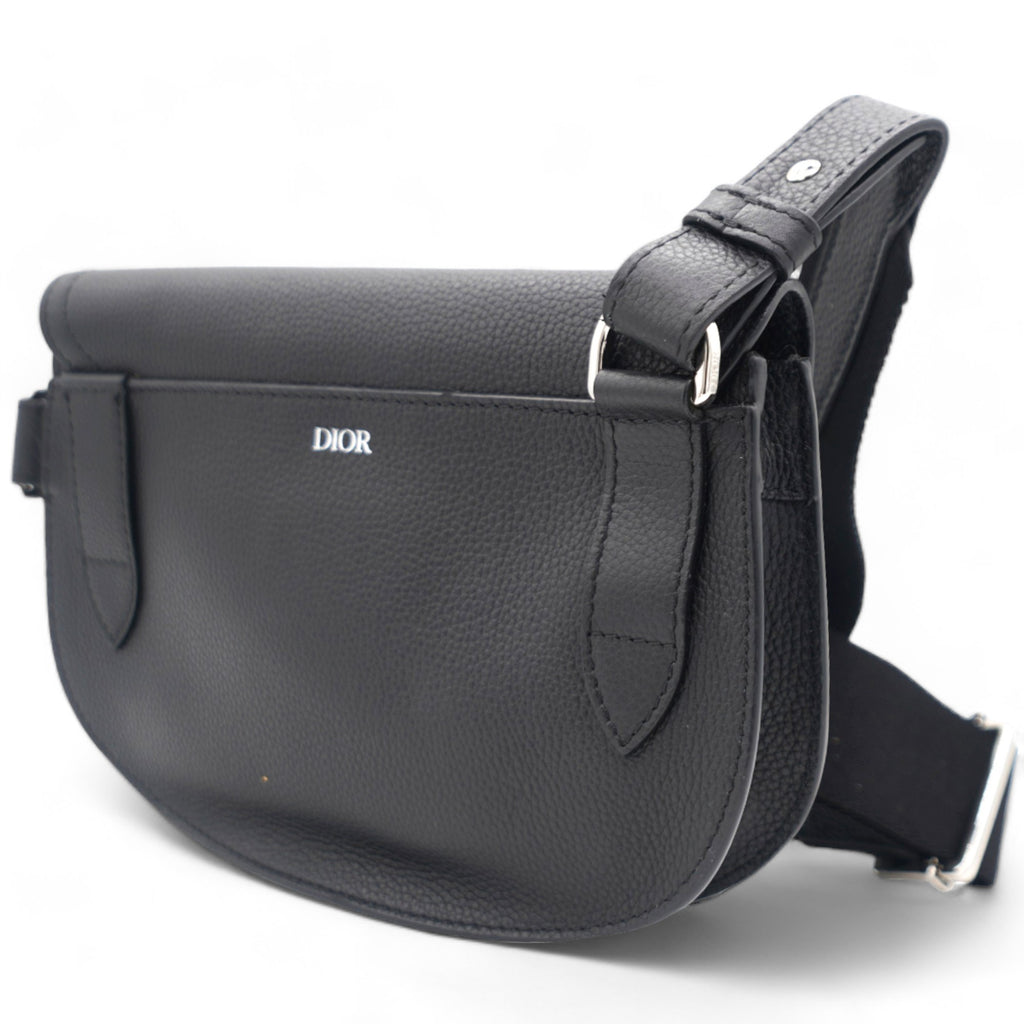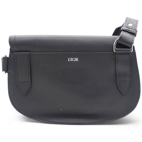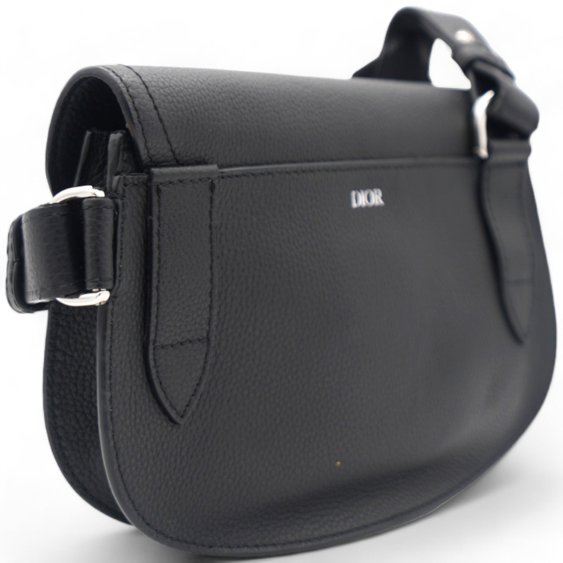 | This is a distinctive Dior messenger bag crafted of black-grained calfskin leather. This saddle-shaped shoulder bag features an adjustable strap and silver hardware. The bag opens to a compact black fabric interior. |