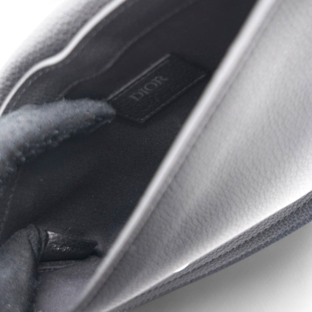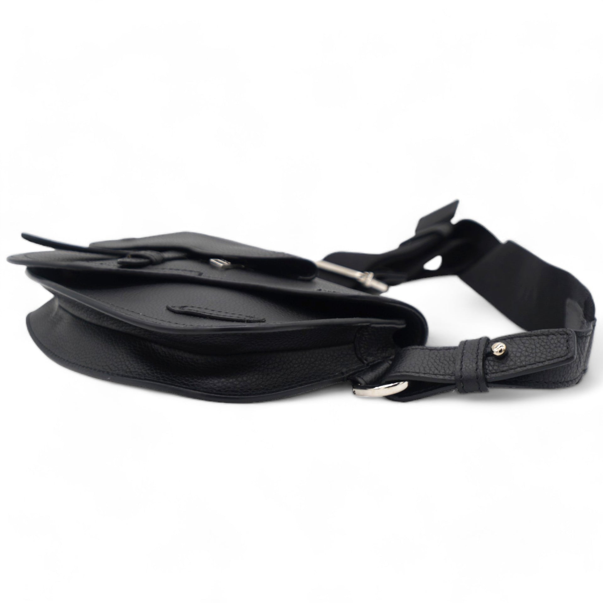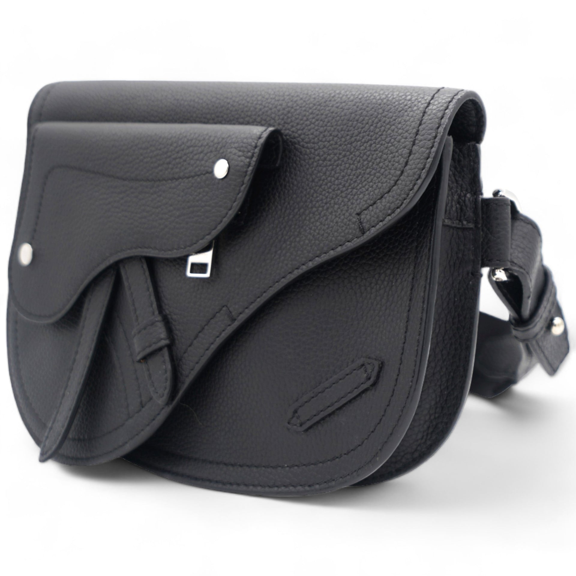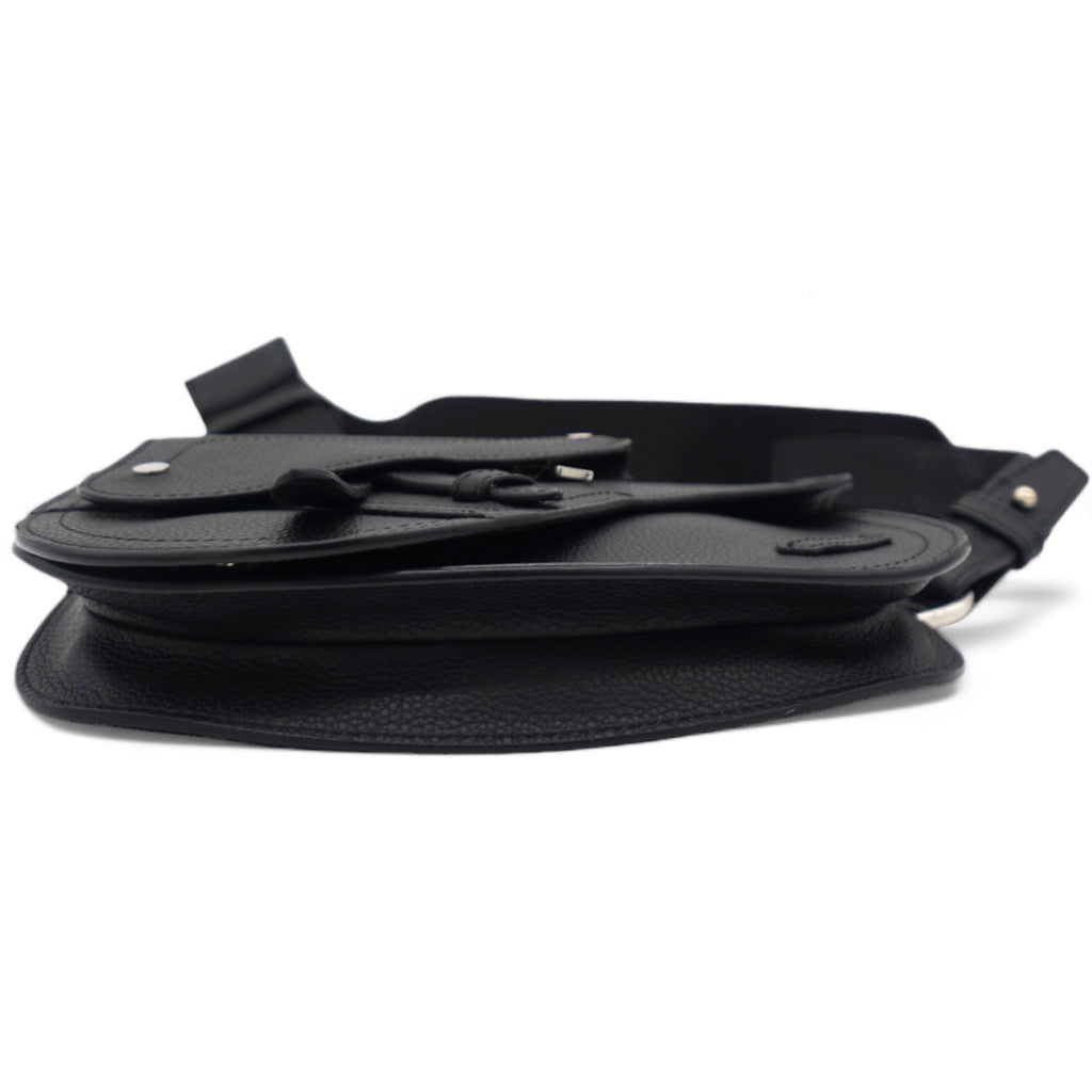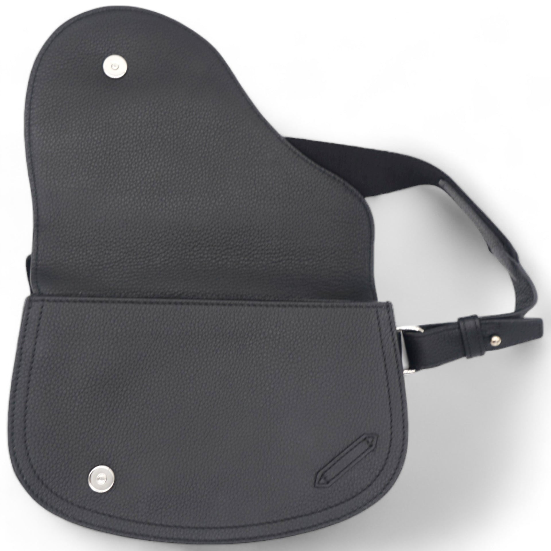 | This is a distinctive Dior messenger bag crafted of black-grained calfskin leather. This saddle-shaped shoulder bag features an adjustable strap and silver hardware. The bag opens to a compact black fabric interior. |