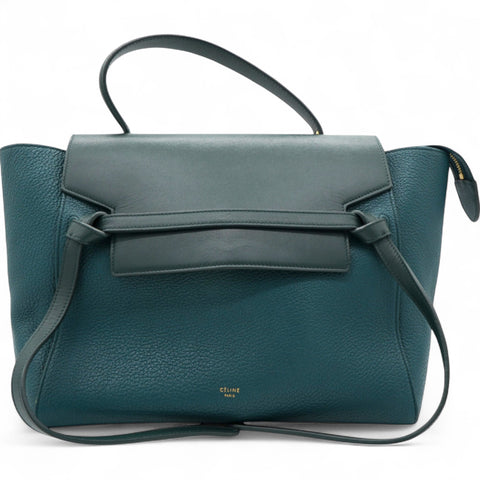 | This chic tote is crafted of leather with a structured and spacious silhouette in dark green. The bag features a leather strap top handle, an optional shoulder strap and a facing flap secured by a strap and button insert. This stunning handbag opens to a green suede leather interior with a hanging patch pocket. |