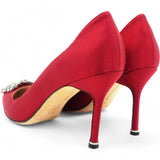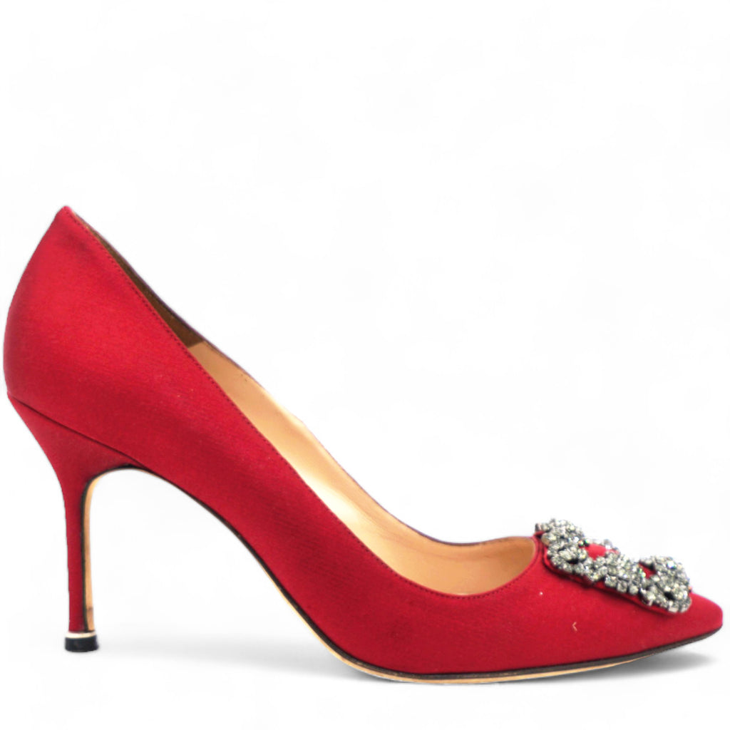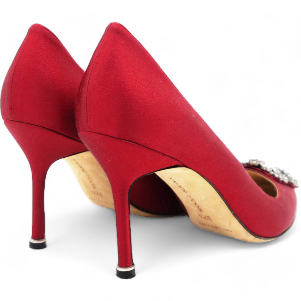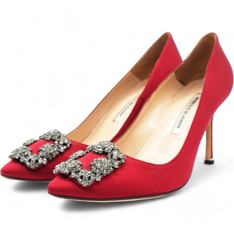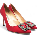 Keep the focus on your feet with these Hangisi satin pumps from Manolo Blahnik. Set on a high stiletto heel, this Italian-crafted pair is characterised by a crystal-embellished buckle, almond-toe silhouette and leather lining.