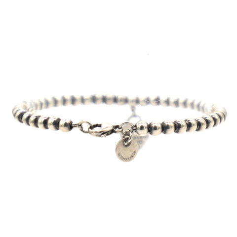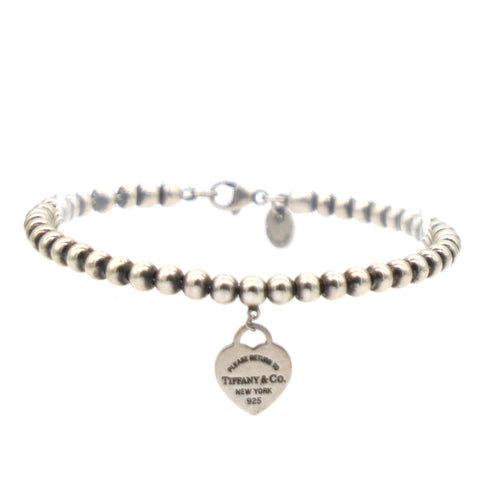 | This Tiffany & Co. bracelet is from the famous collection titled Return To Tiffany. Crafted from silver, the elegant piece carries beads, a heart tag detailed with enamel on one side and signature engravings on the other, and a lobster clasp that acts as the fastener. . |