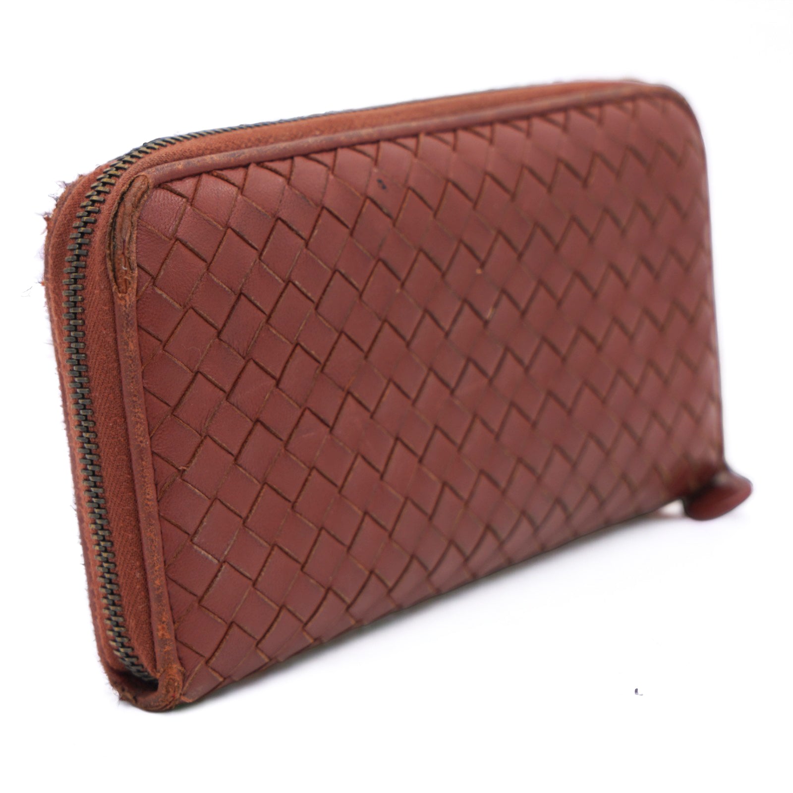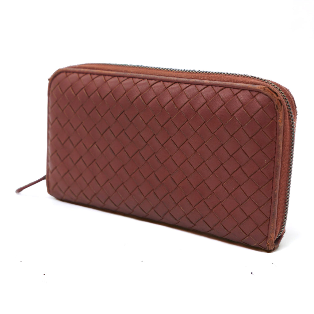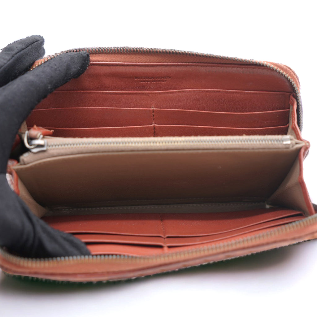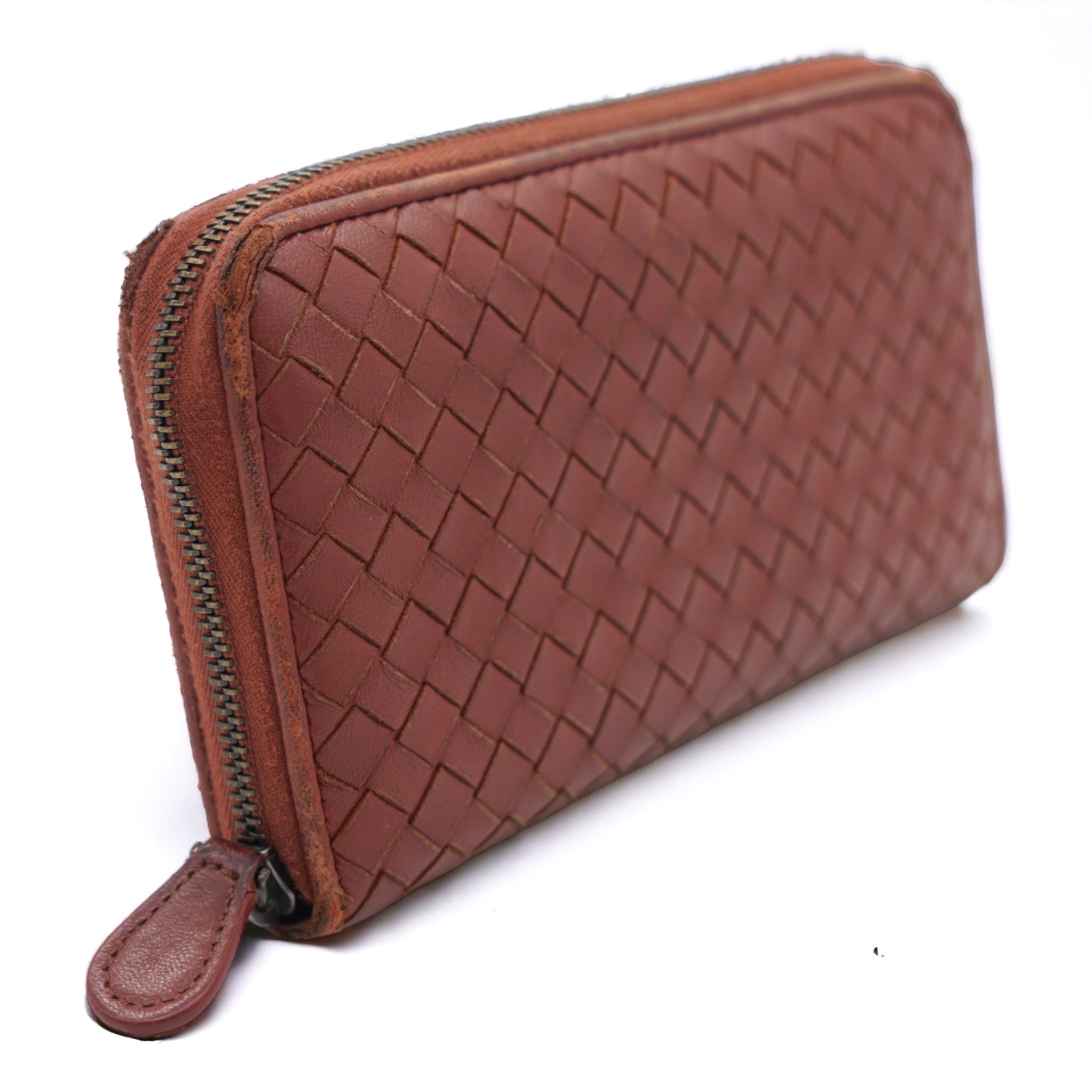 | Terracota Intrecciato leather Bottega Veneta Long wallet with gunmetal-tone hardware, two main compartment: one with zip around closure, open to brown leather and twill lining interior and one bill compartment, four card slots, two slip pockets; one with four card slots and one slip pocket. |