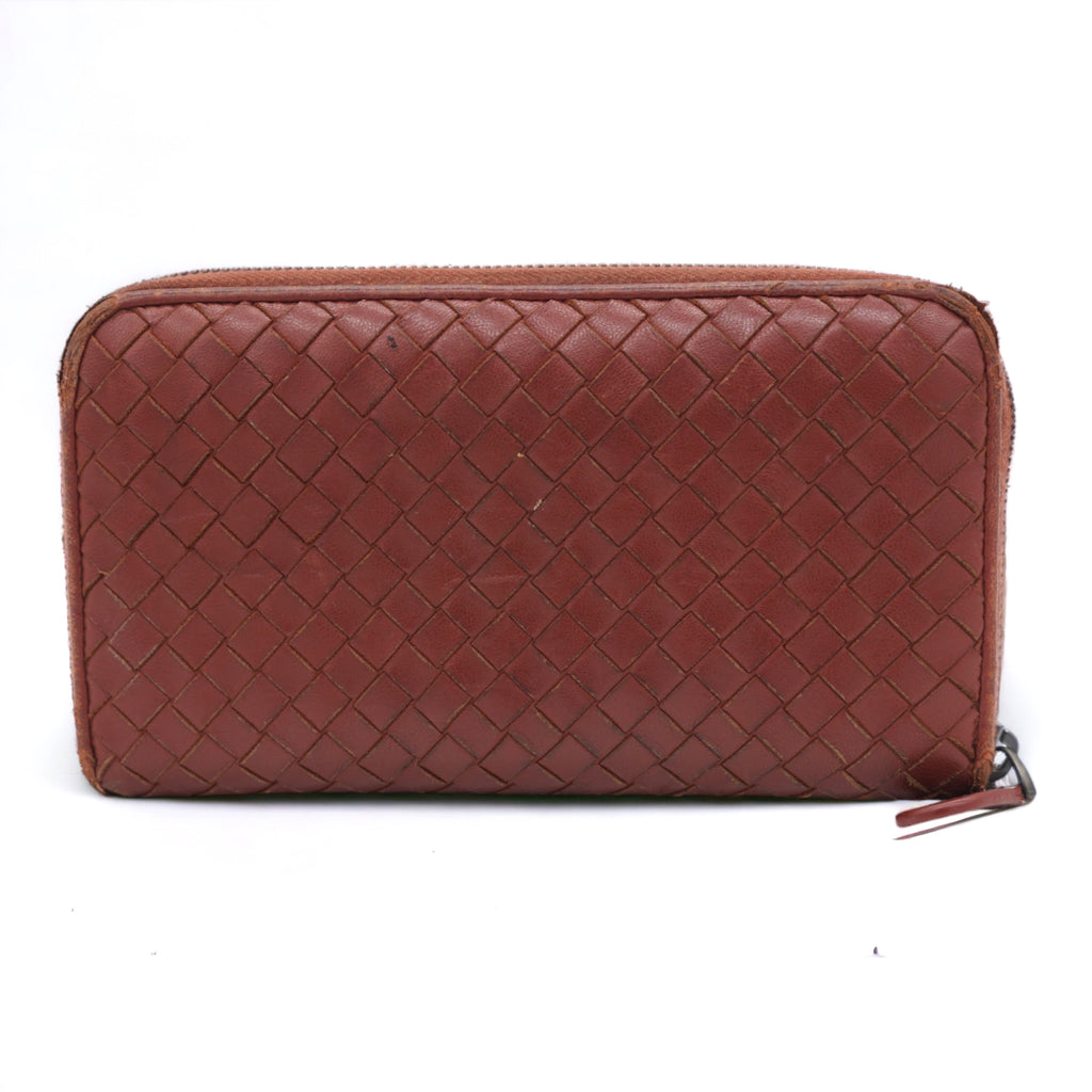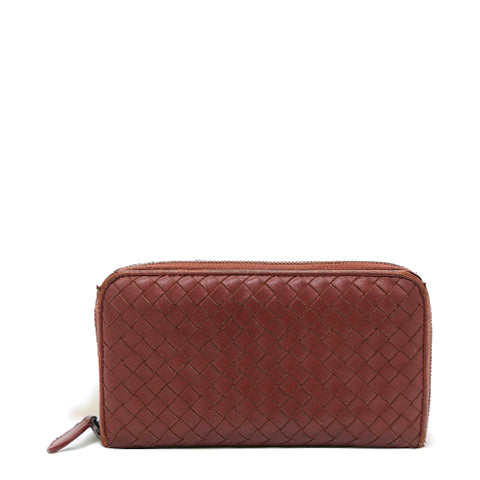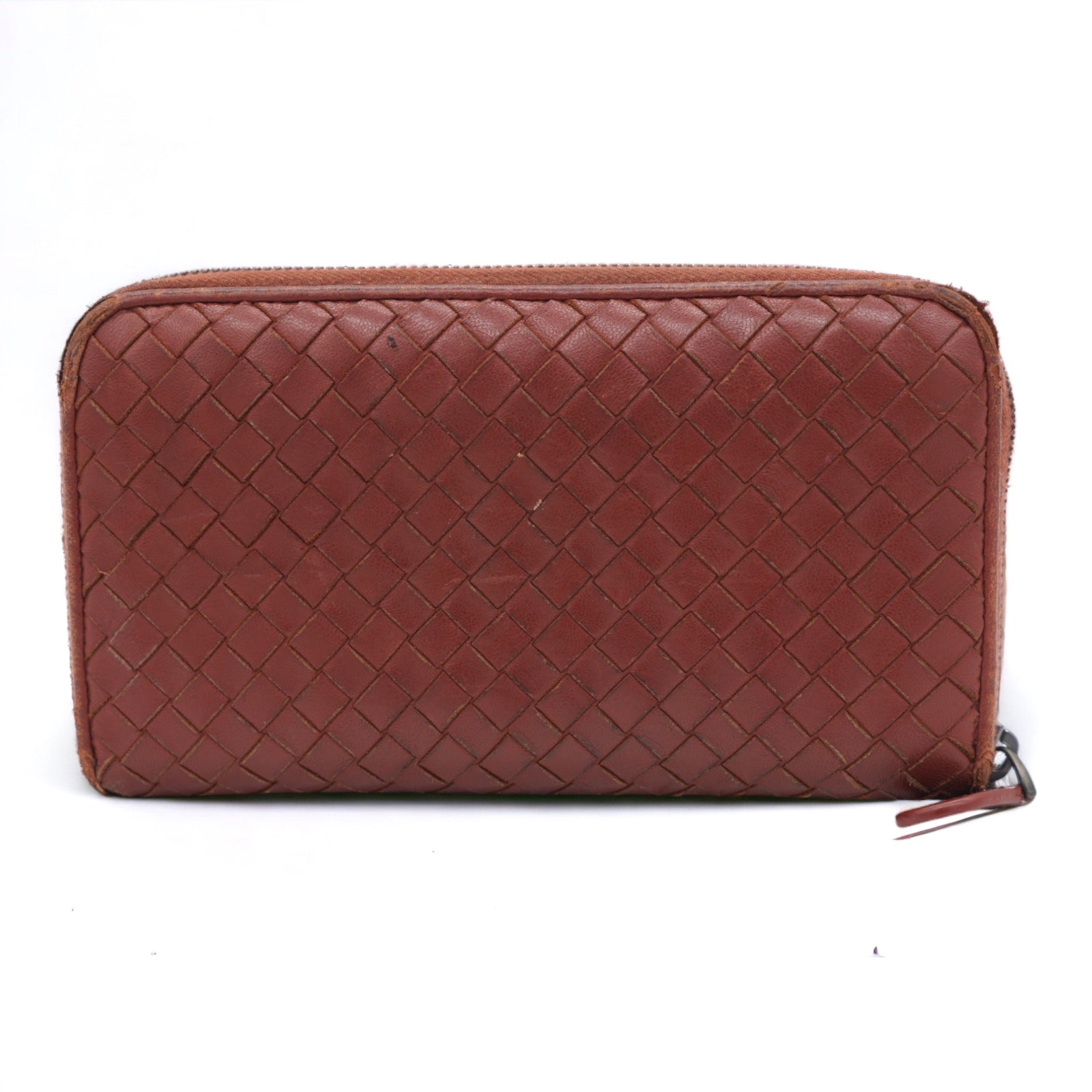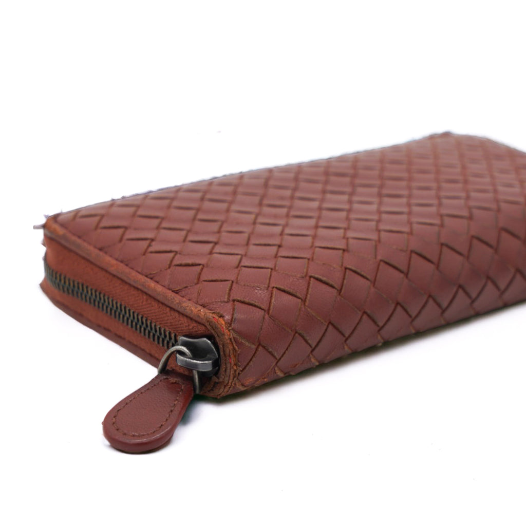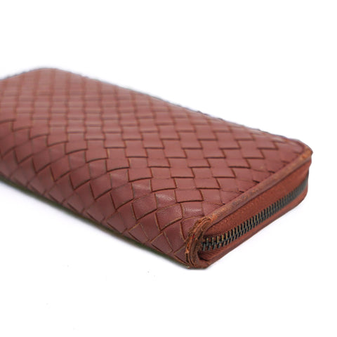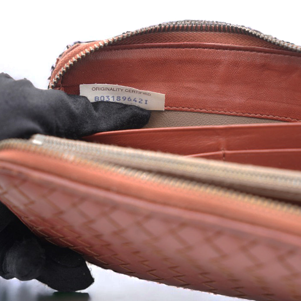 | Terracota Intrecciato leather Bottega Veneta Long wallet with gunmetal-tone hardware, two main compartment: one with zip around closure, open to brown leather and twill lining interior and one bill compartment, four card slots, two slip pockets; one with four card slots and one slip pocket. |