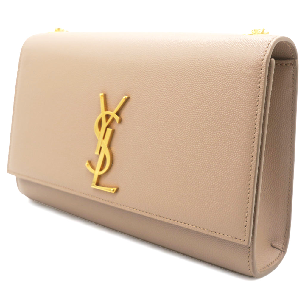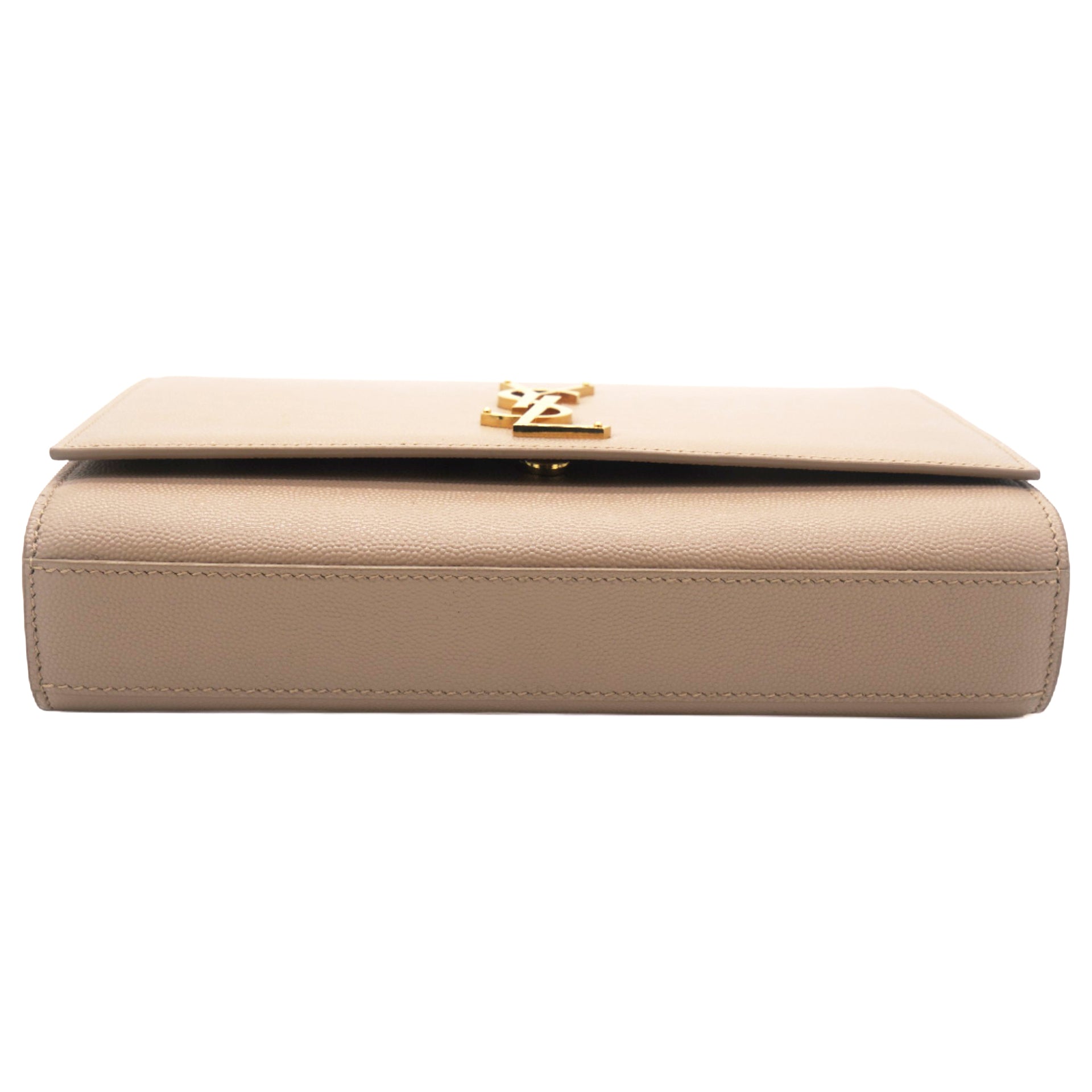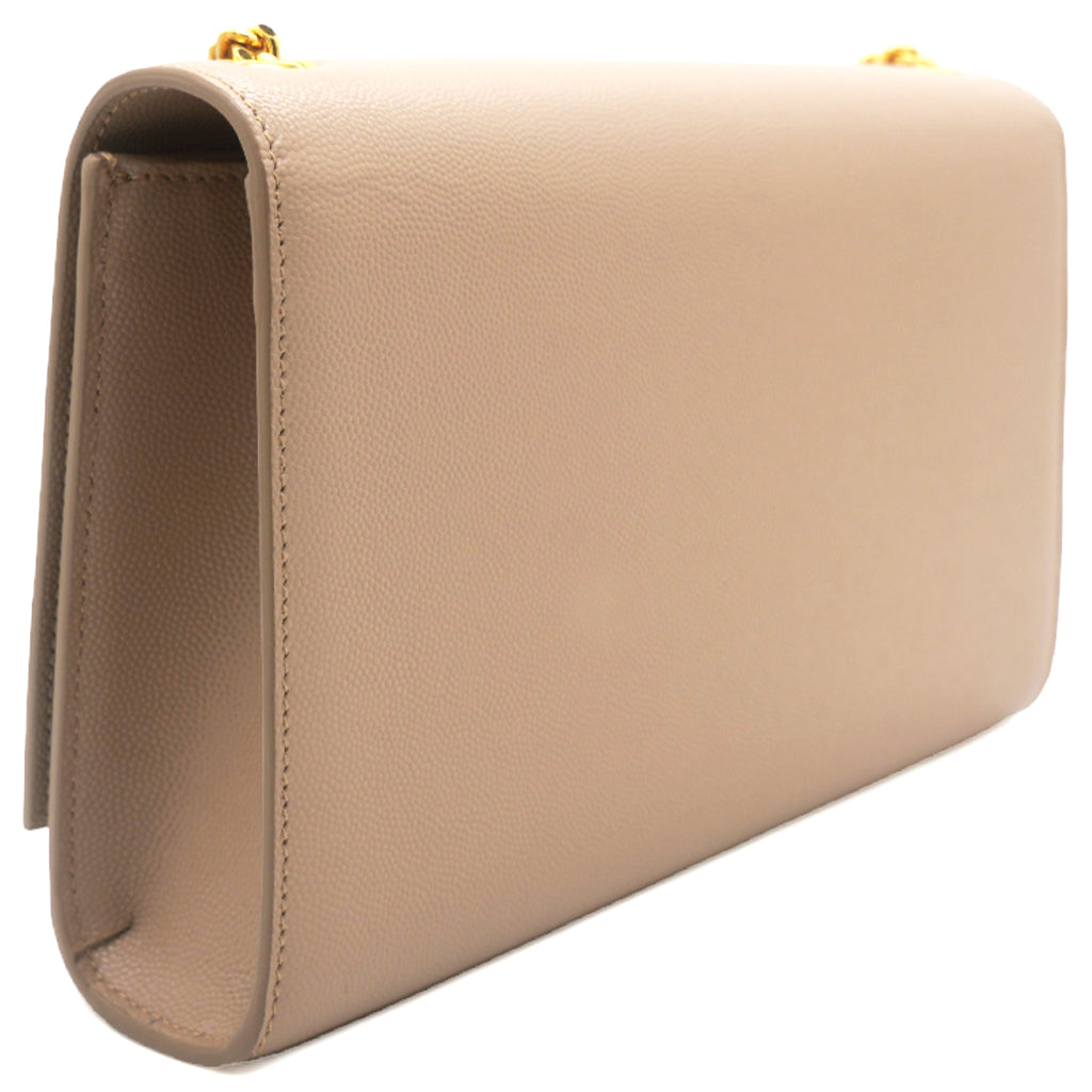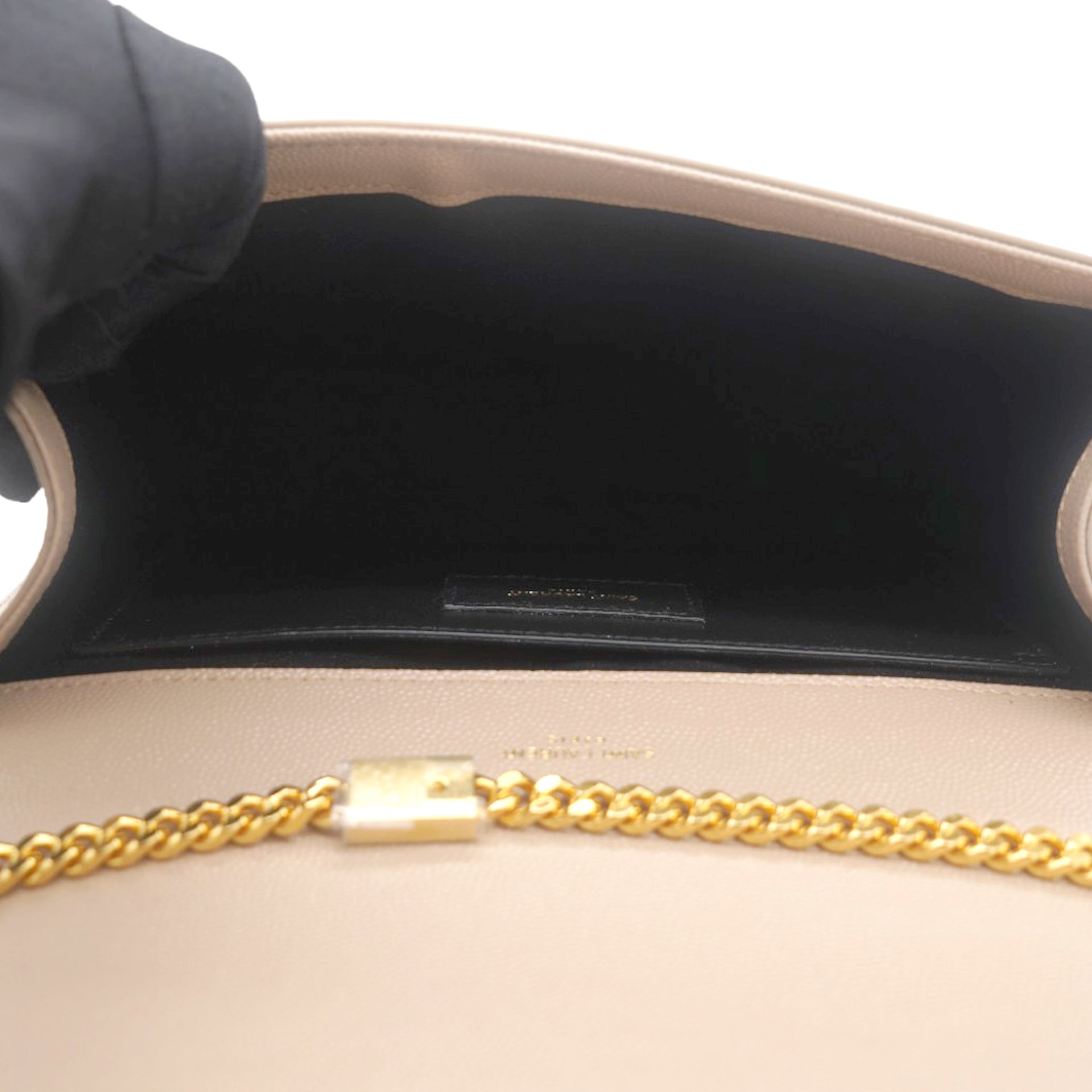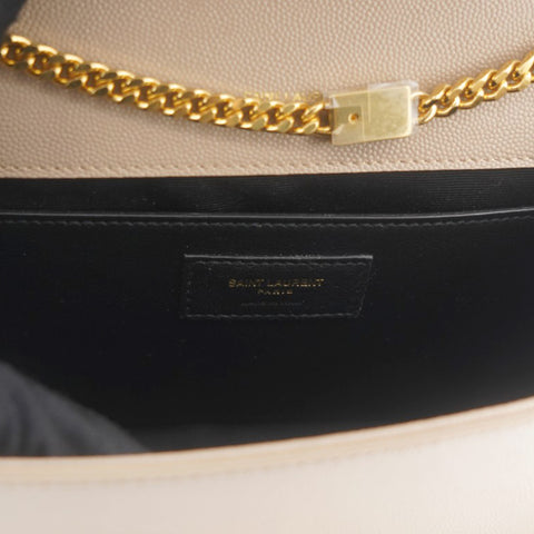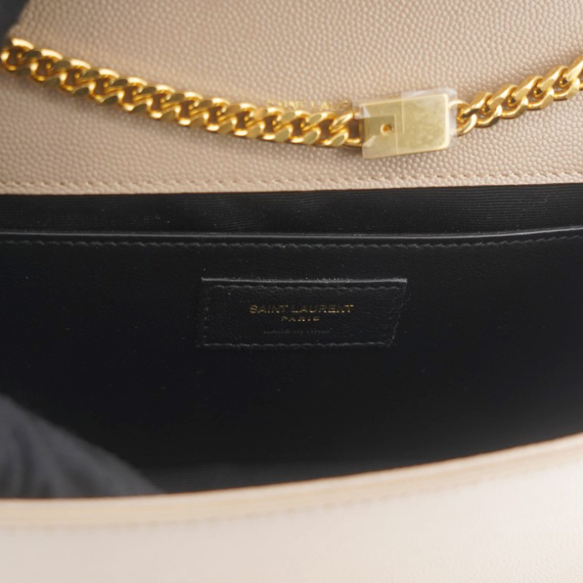 This stylish handbag is crafted of finely pebbled calfskin leather in beige. The shoulder bag features a gold chain link shoulder strap and a full facing flap with the classic silver YSL logo. The flap opens to a black fabric interior with a patch pocket.