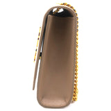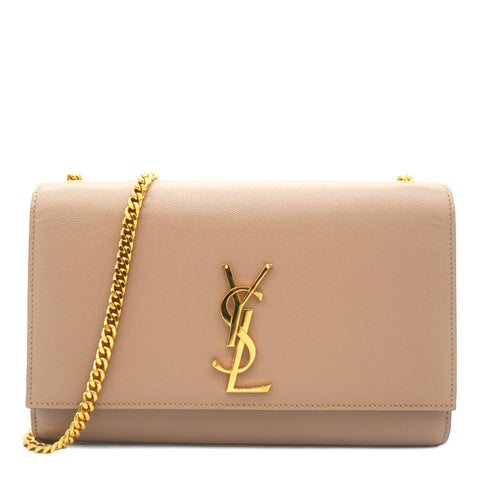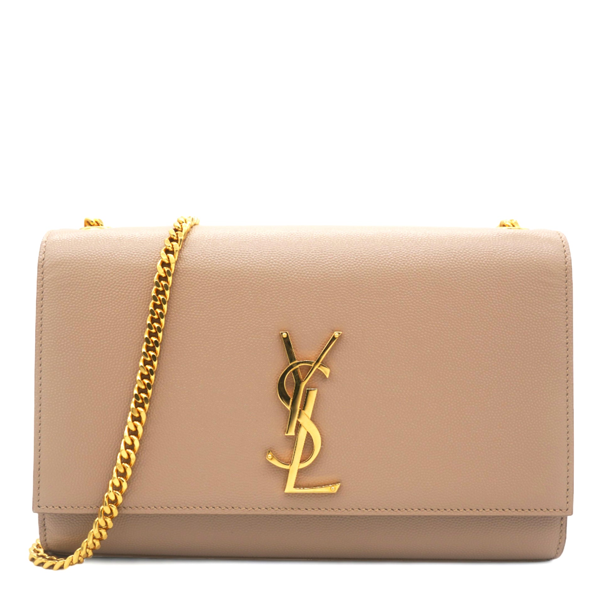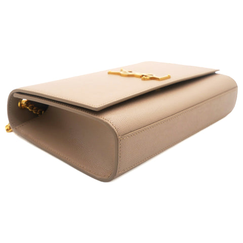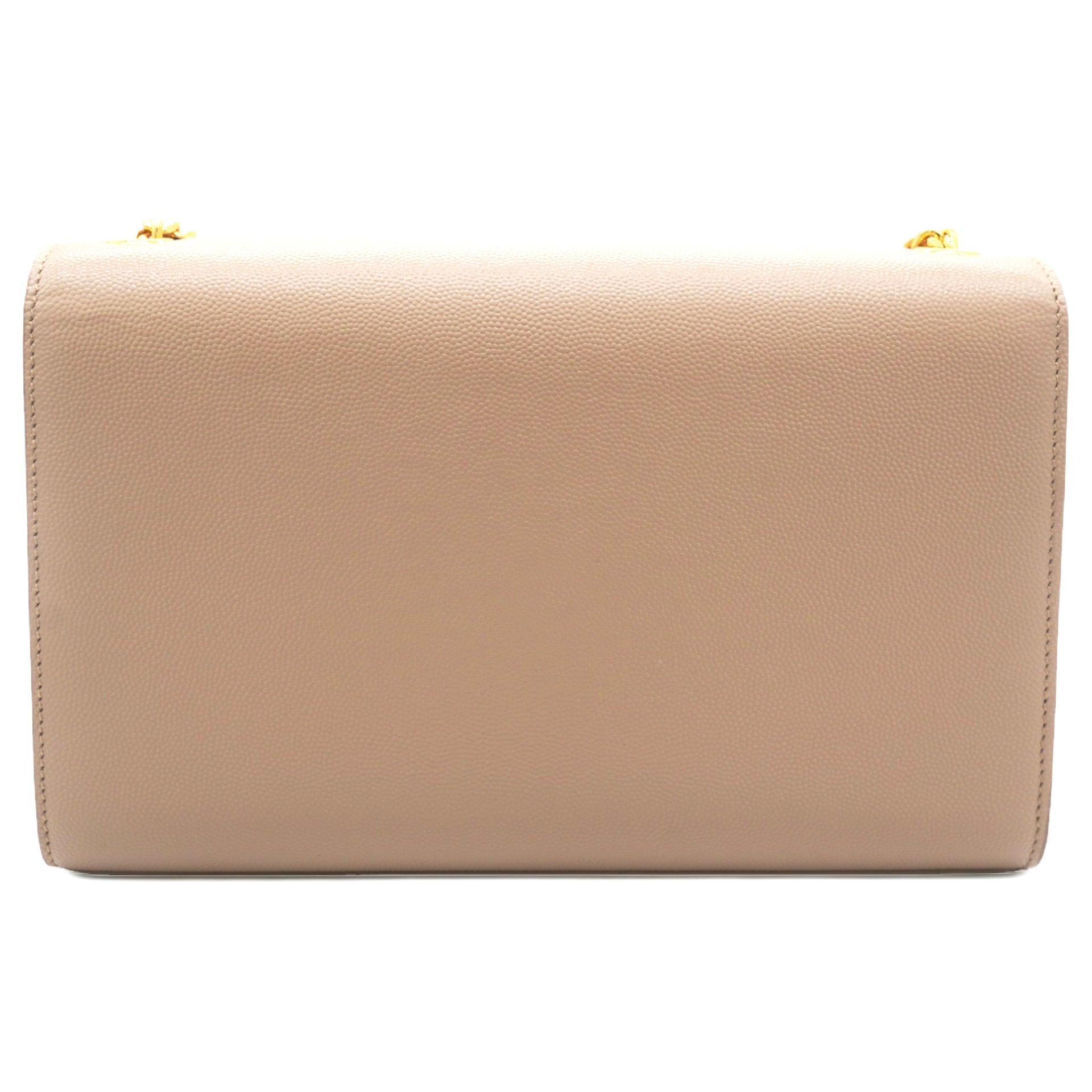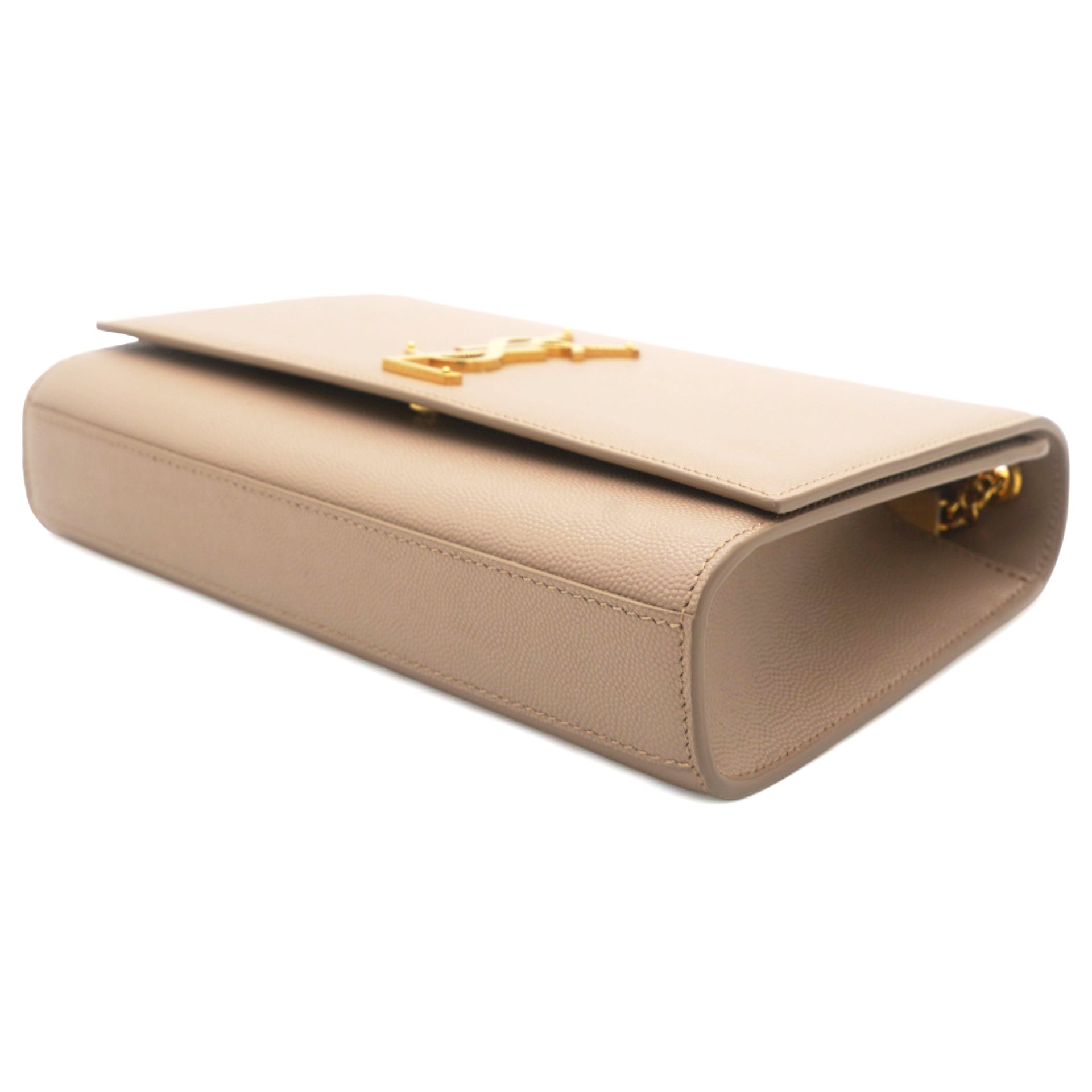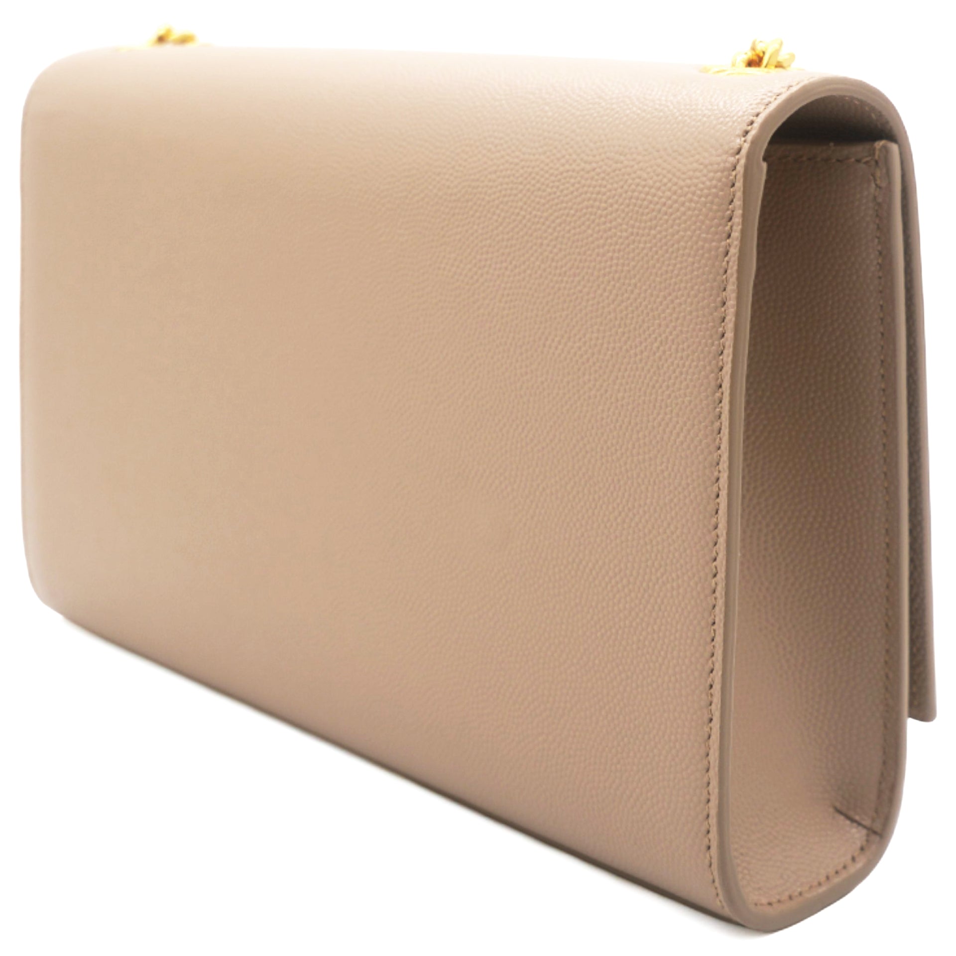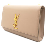 This stylish handbag is crafted of finely pebbled calfskin leather in beige. The shoulder bag features a gold chain link shoulder strap and a full facing flap with the classic silver YSL logo. The flap opens to a black fabric interior with a patch pocket.