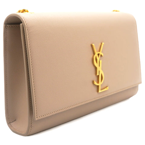 This stylish handbag is crafted of finely pebbled calfskin leather in beige. The shoulder bag features a gold chain link shoulder strap and a full facing flap with the classic silver YSL logo. The flap opens to a black fabric interior with a patch pocket.
