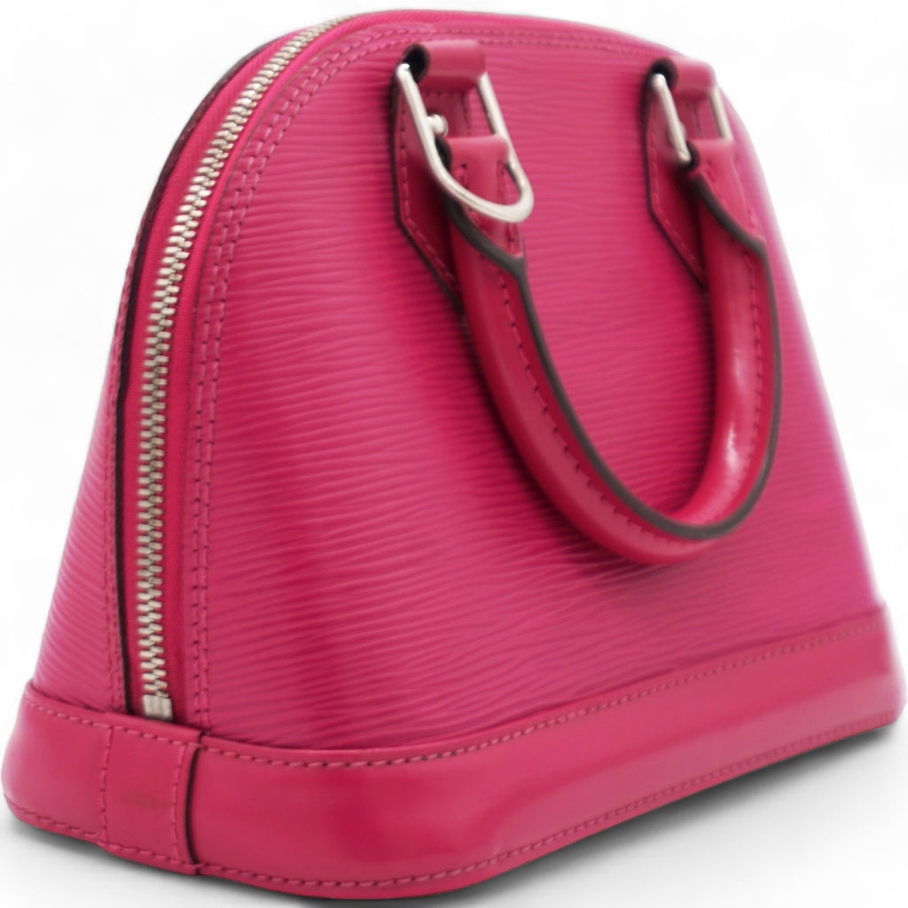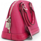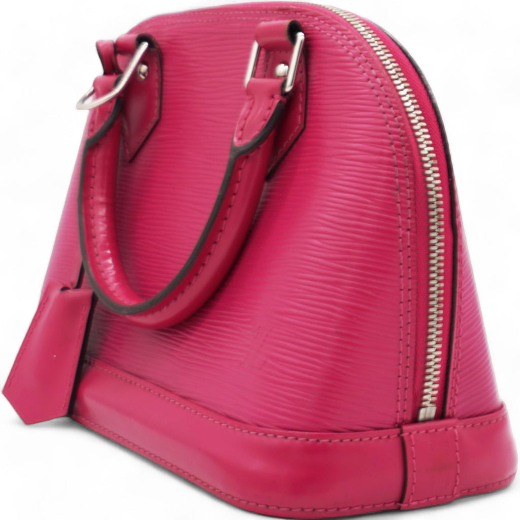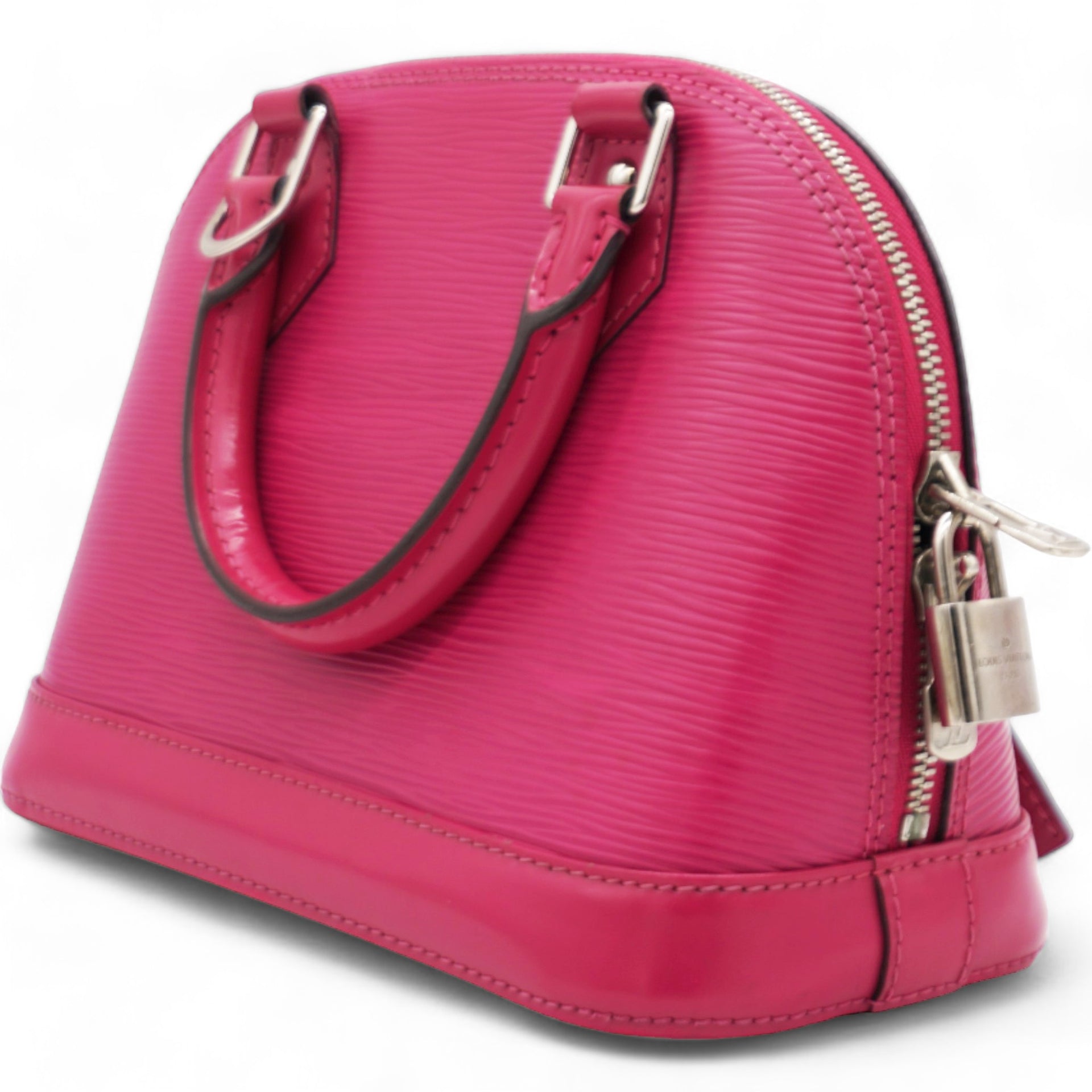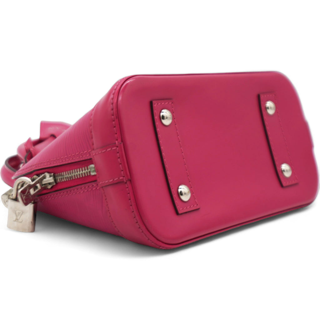 | This stylish tote is crafted of Louis Vuitton's signature textured epi leather in bright pink. In the mini version, this classic bag features rolled leather top handles, a long matching detachable leather cross body strap, and polished silver hardware. The zippered top opens to a matching pink alcantara fabric interior with a patch pocket. |