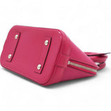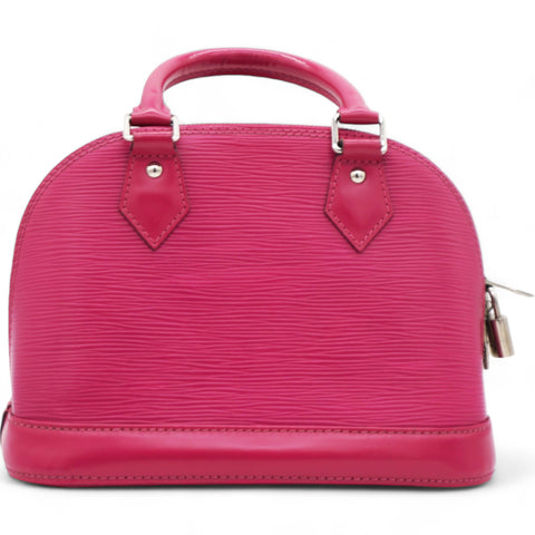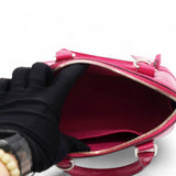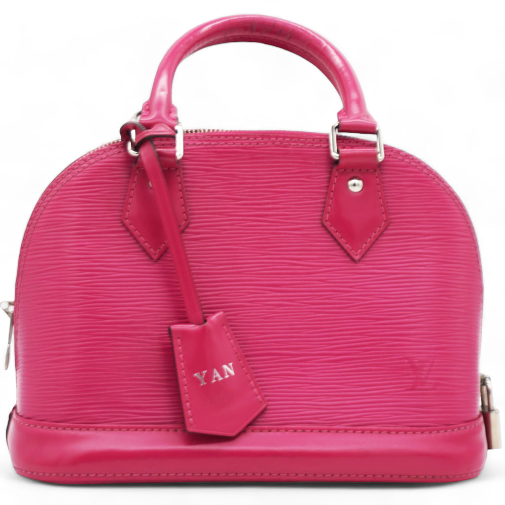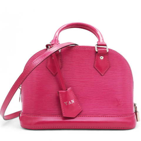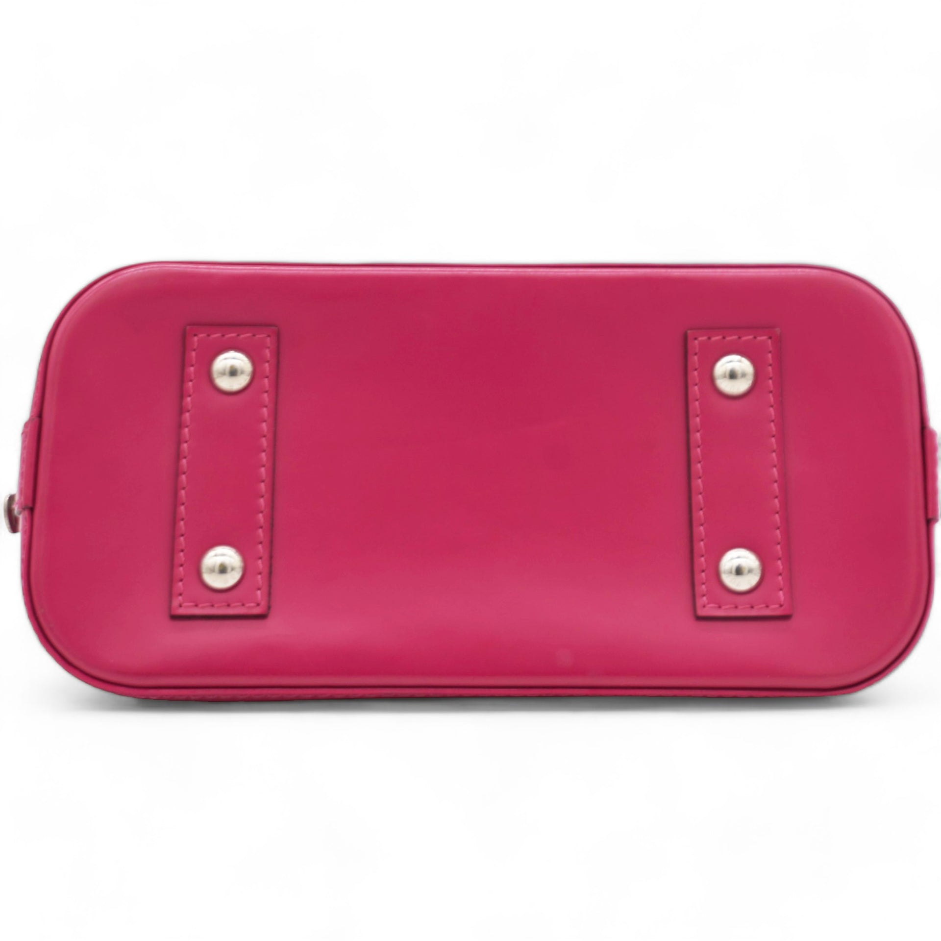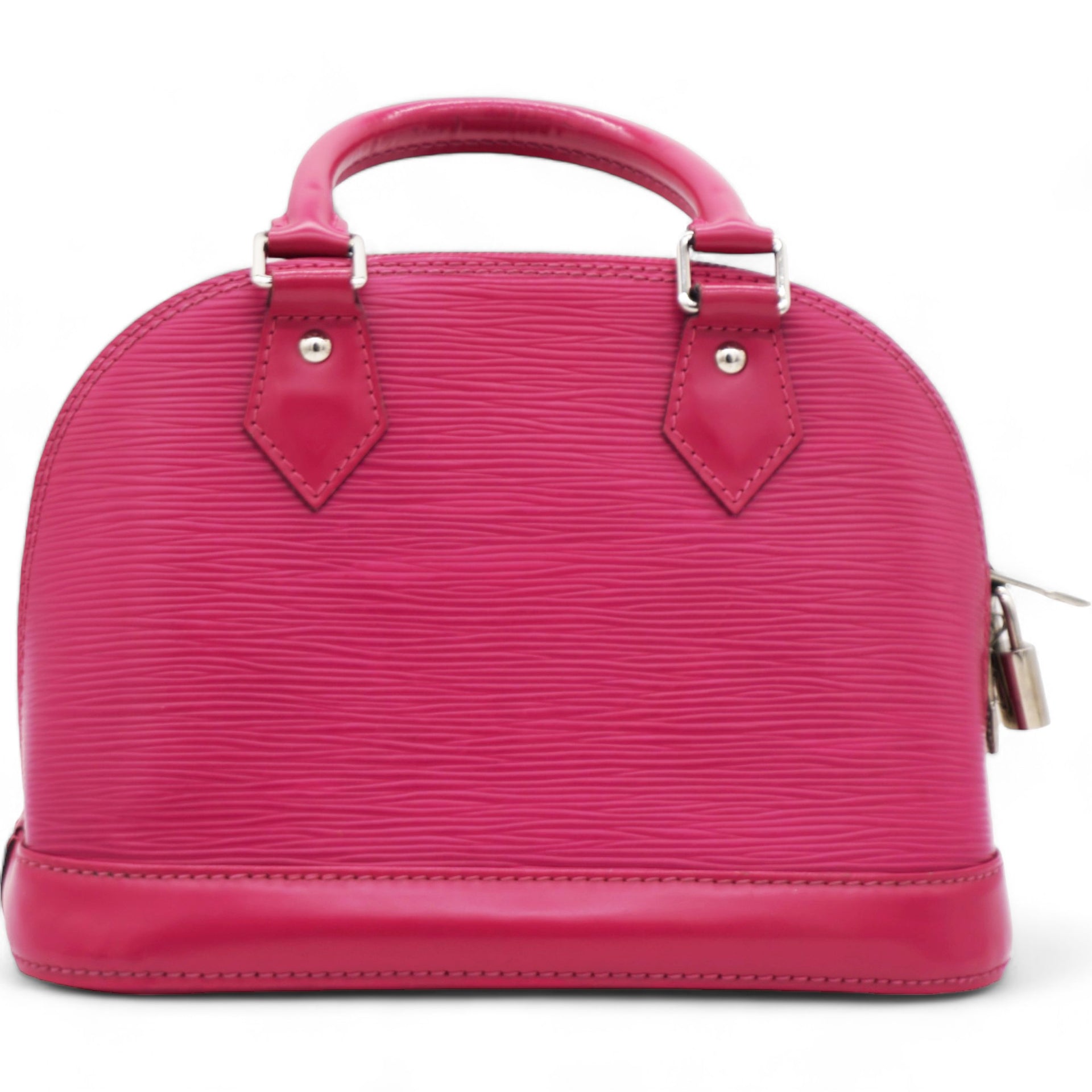 | This stylish tote is crafted of Louis Vuitton's signature textured epi leather in bright pink. In the mini version, this classic bag features rolled leather top handles, a long matching detachable leather cross body strap, and polished silver hardware. The zippered top opens to a matching pink alcantara fabric interior with a patch pocket. |