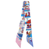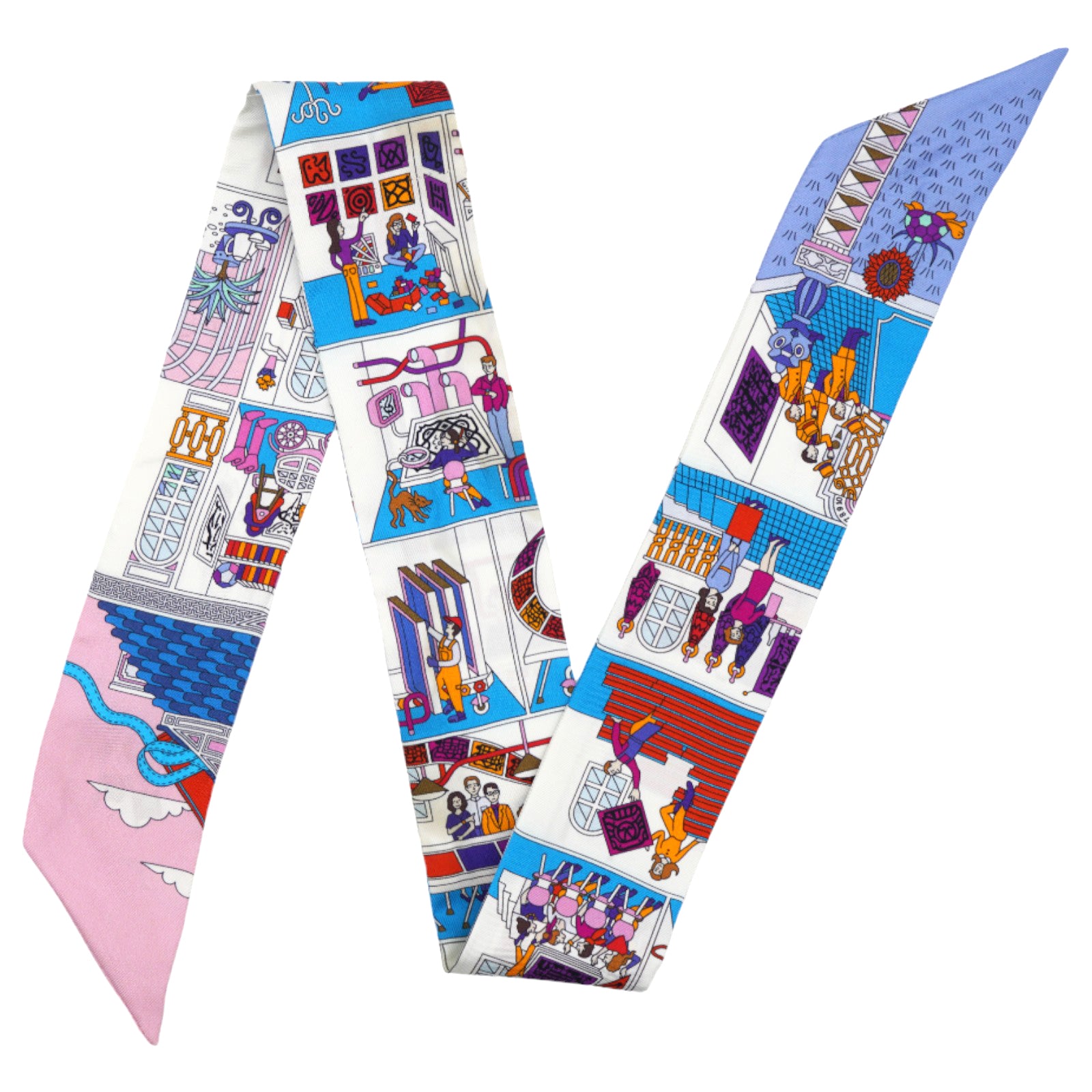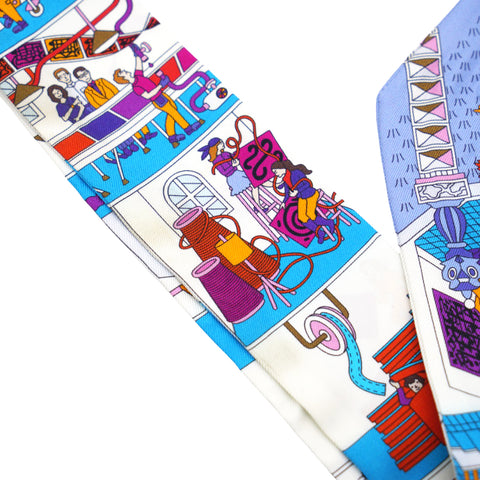 | This bold scarf is 100% silk and features people in a store setting on a white background at the iconic Hermes silk scarf factory. |