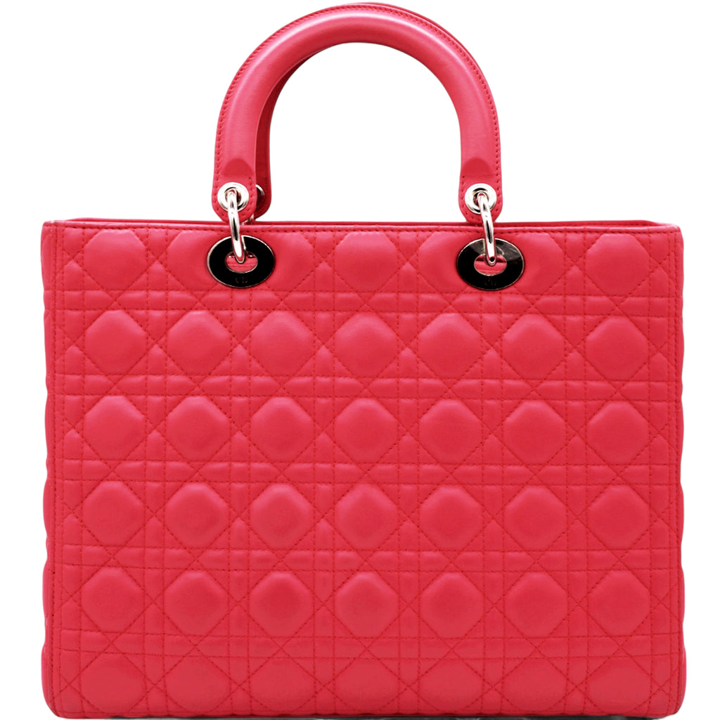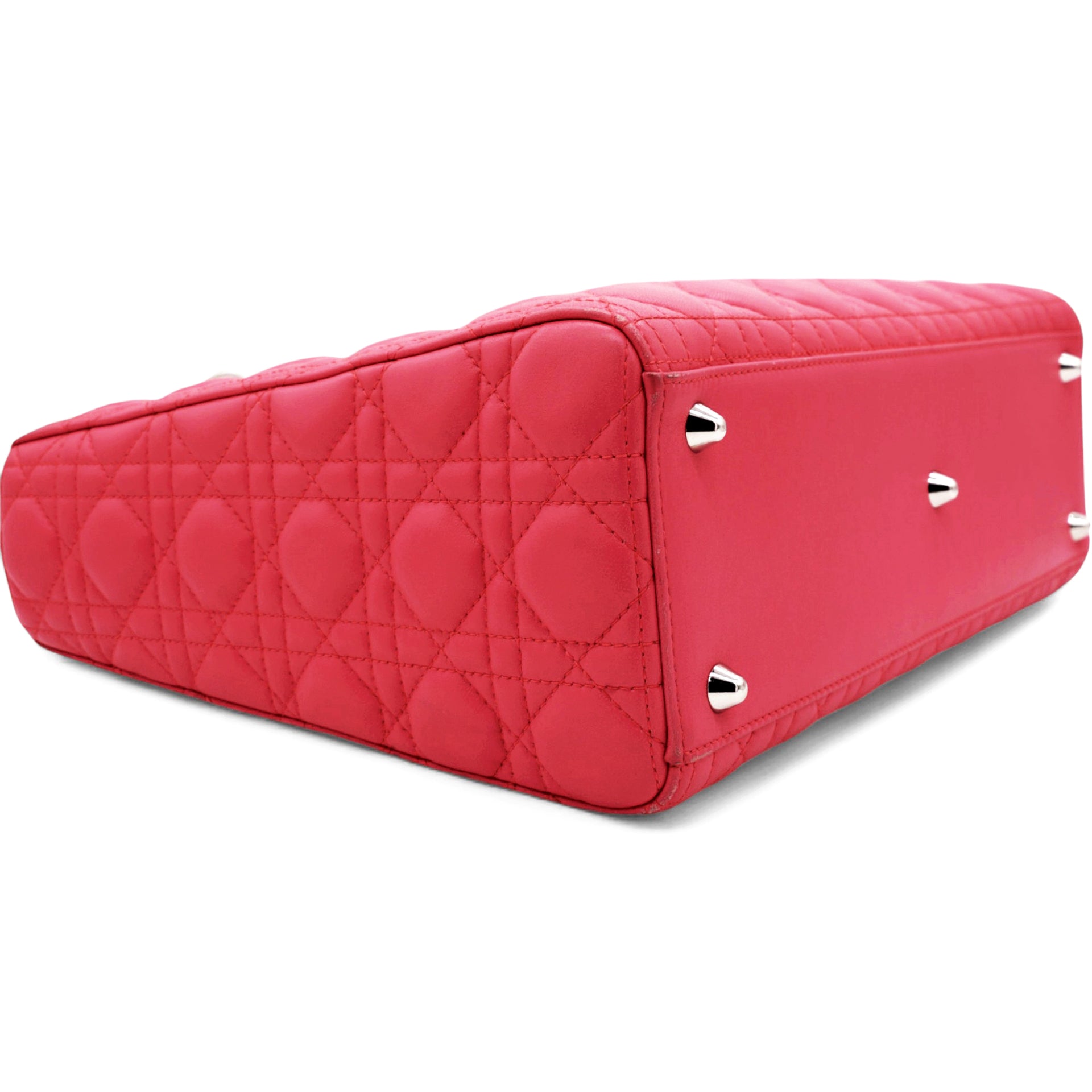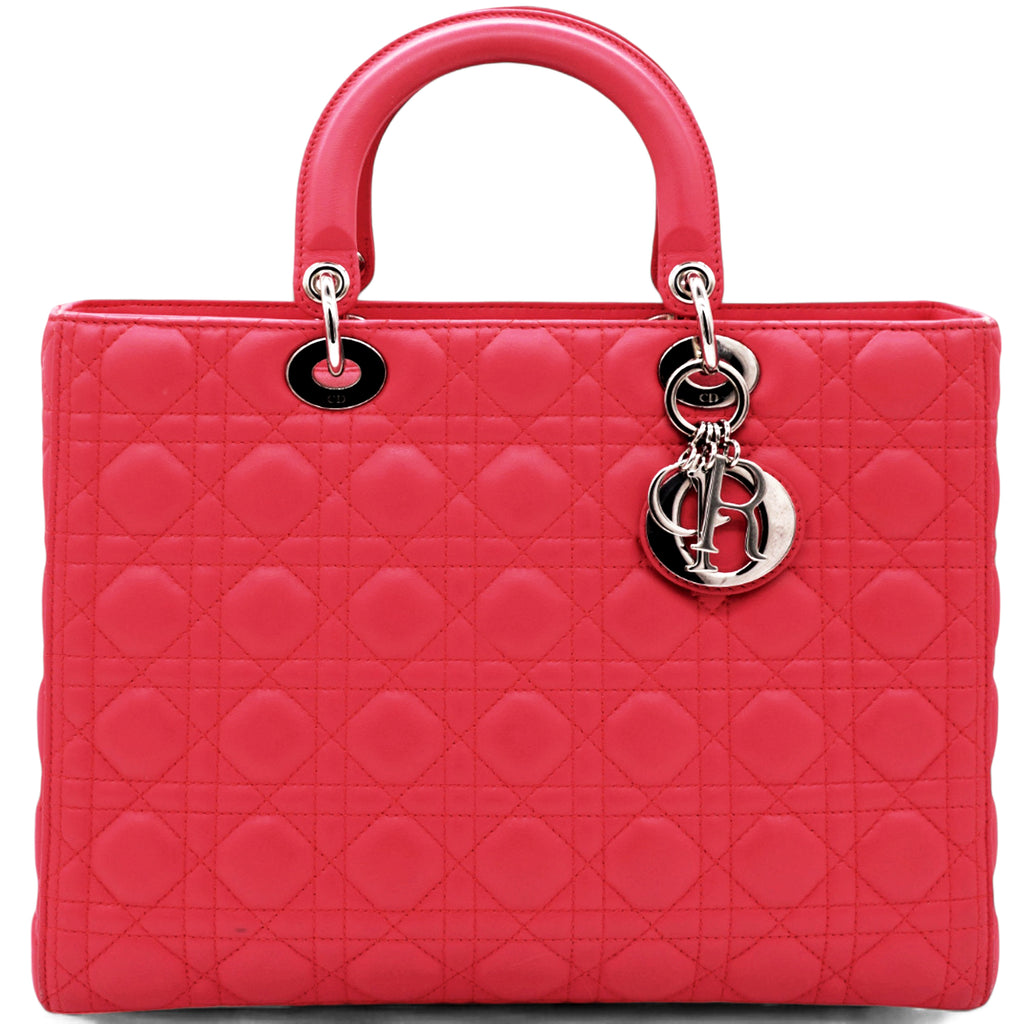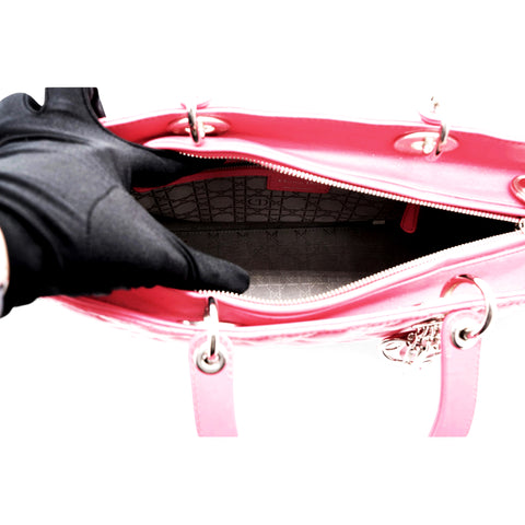 | This stylish tote is crafted of luxurious lambskin leather in dark pink. The bag features sturdy leather top handles, geometric quilting and gold hardware, including a hanging gold Dior initials logo charm. The top zipper opens to a grey Dior monogram fabric interior with a zipper pocket. |