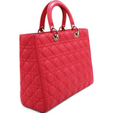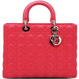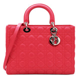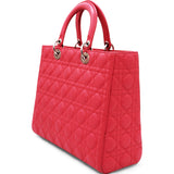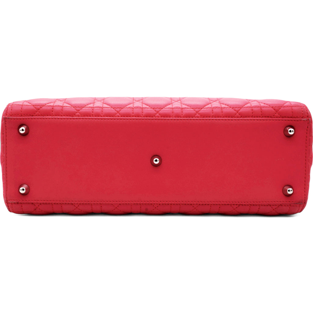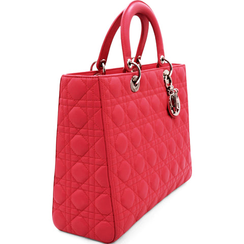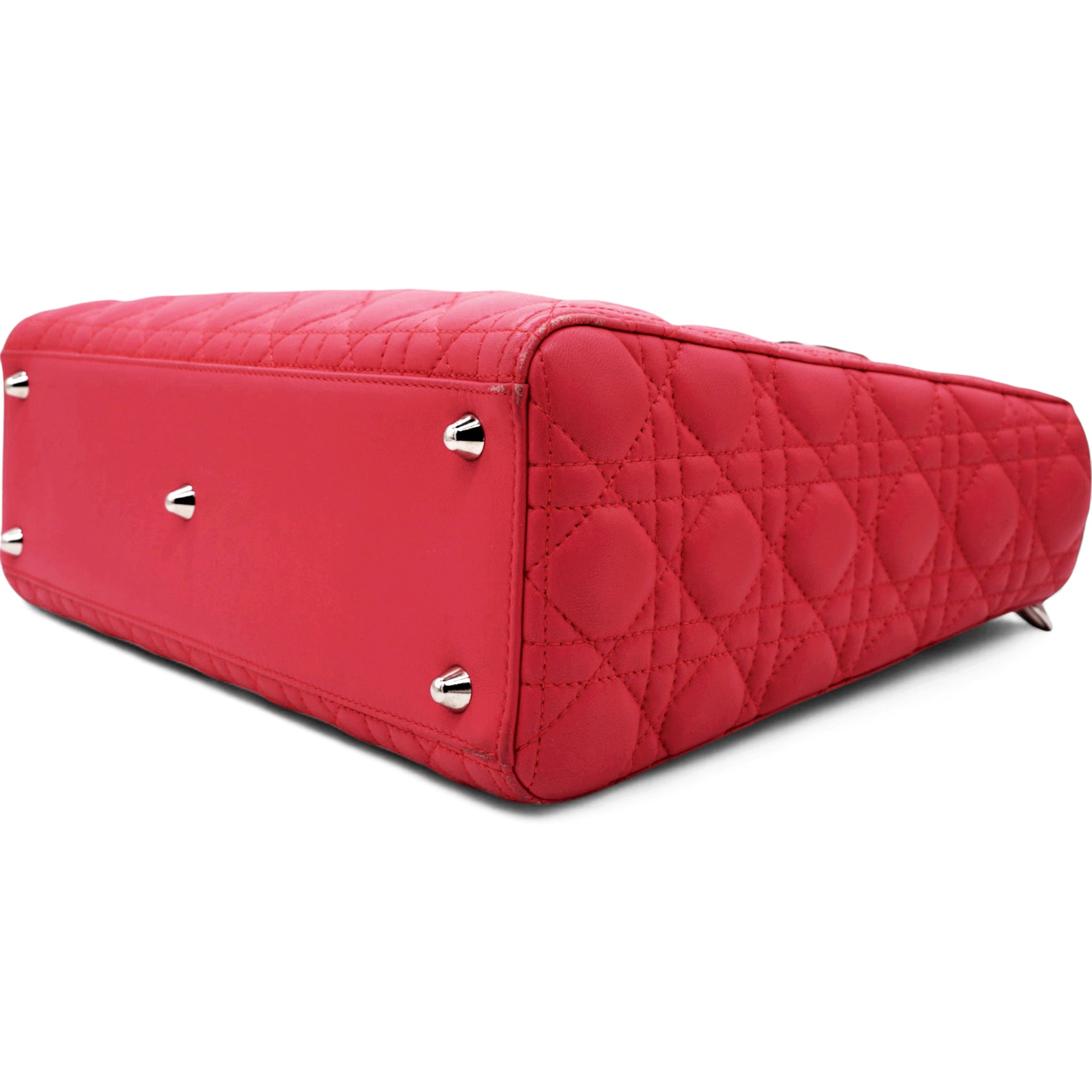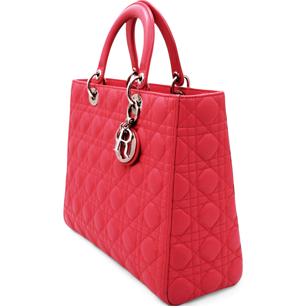 | This stylish tote is crafted of luxurious lambskin leather in dark pink. The bag features sturdy leather top handles, geometric quilting and gold hardware, including a hanging gold Dior initials logo charm. The top zipper opens to a grey Dior monogram fabric interior with a zipper pocket. |