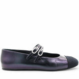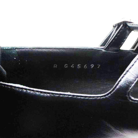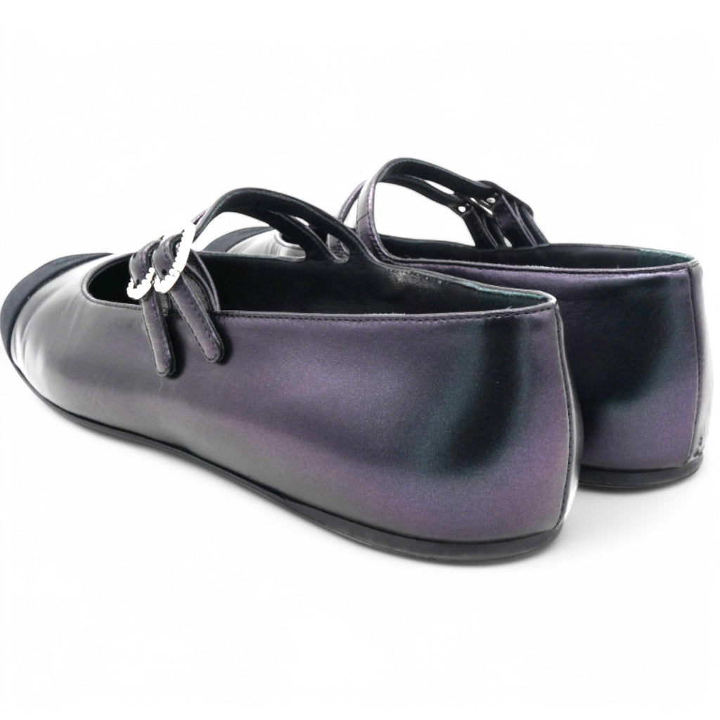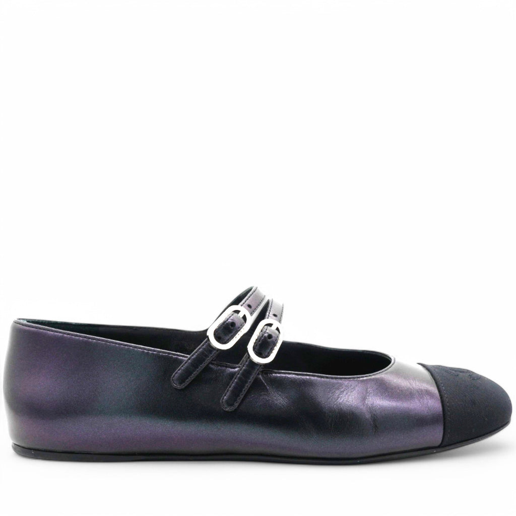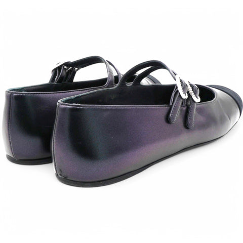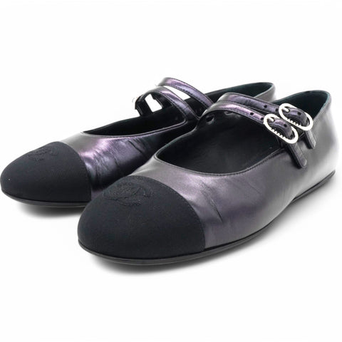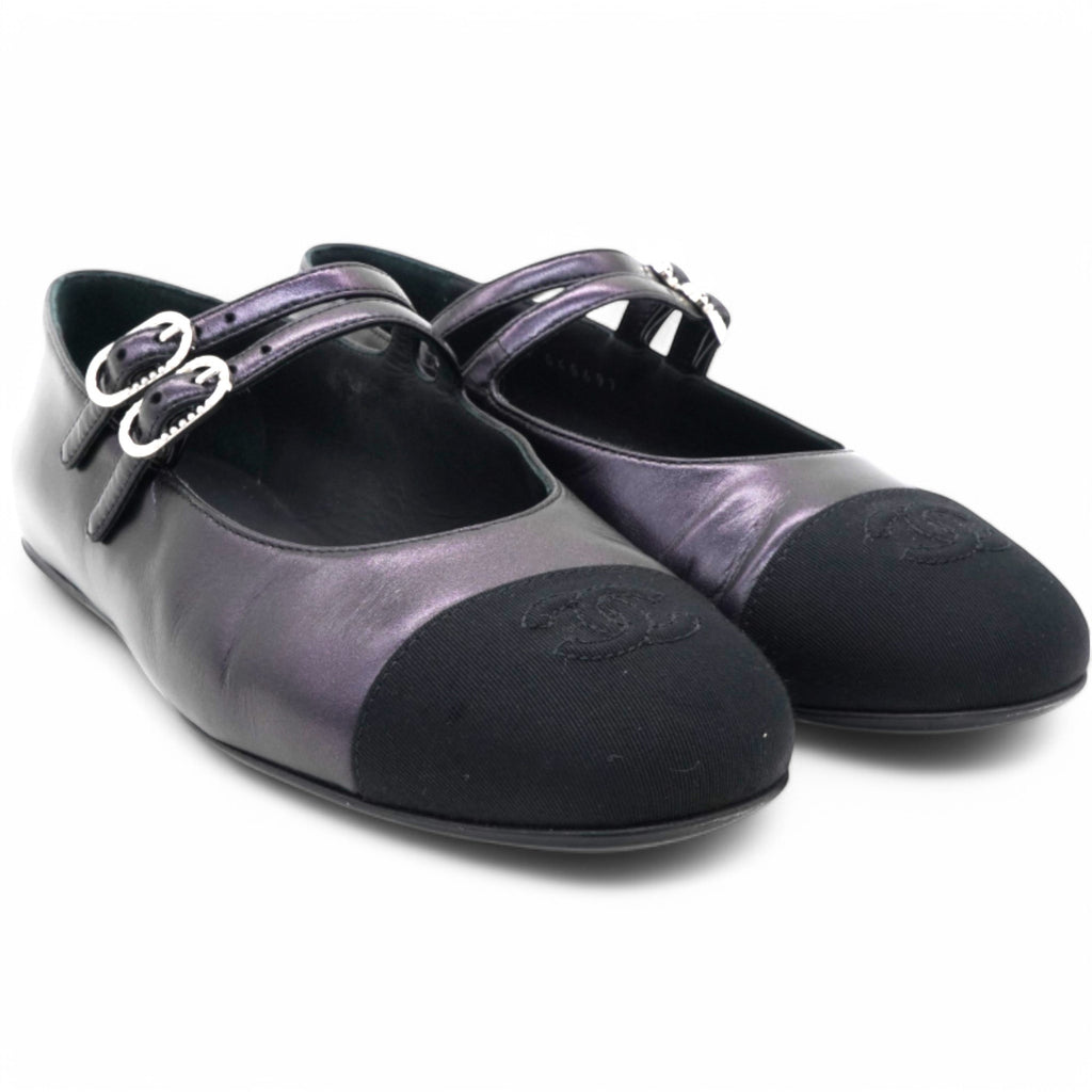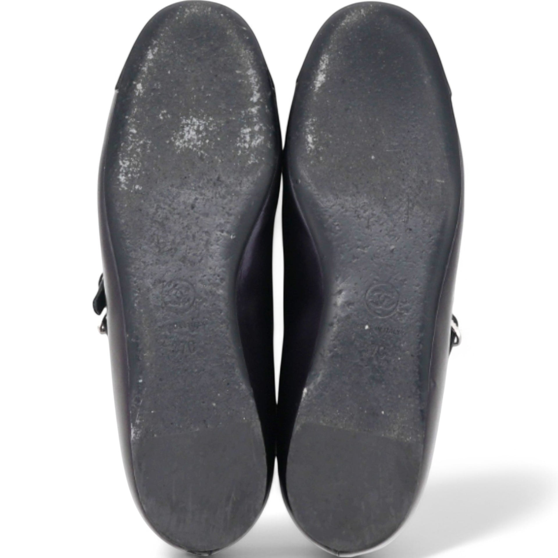 | These flats are crafted of black lambskin leather with grosgrain black CC cap toes and crossover straps with pearl-adorned silver buckles. |