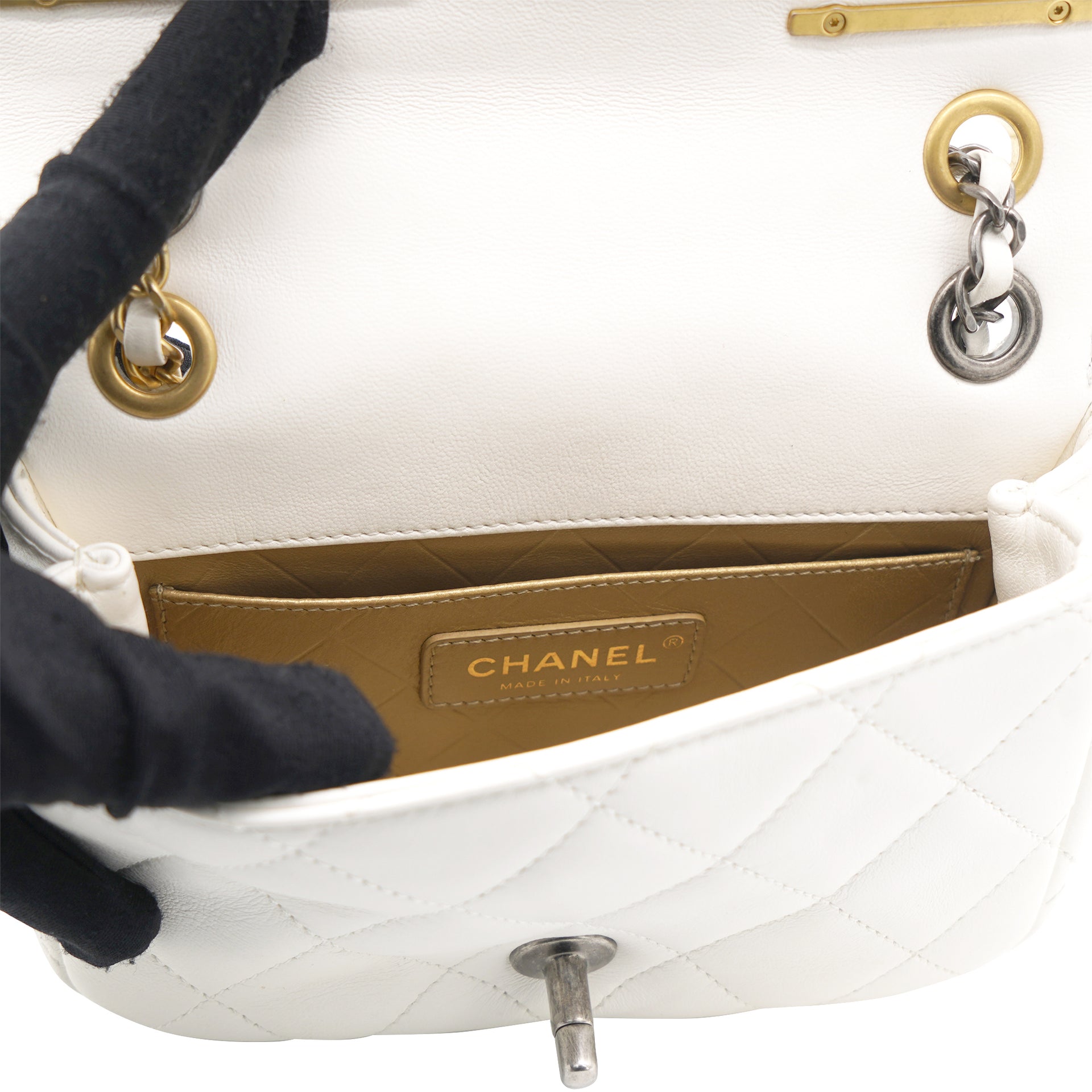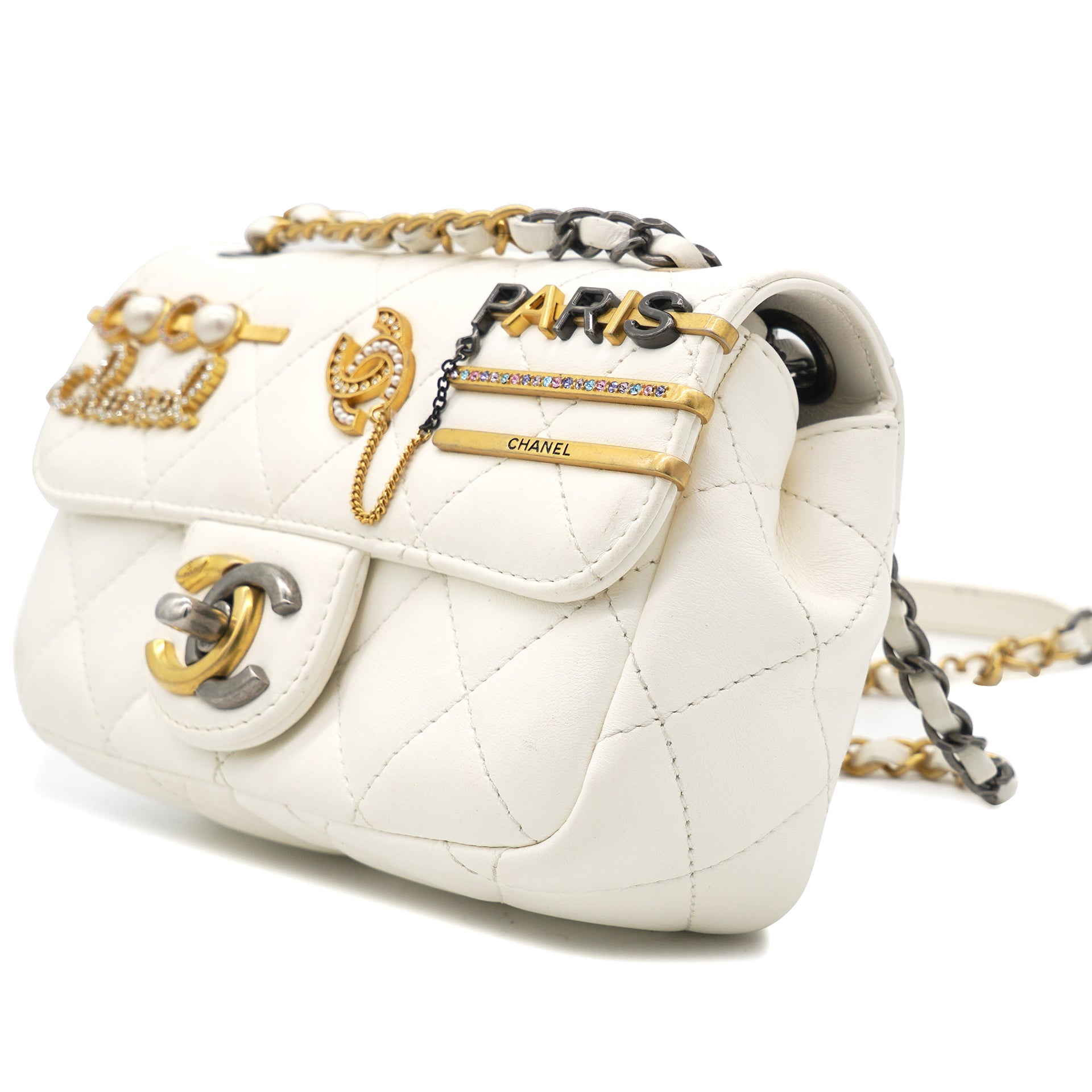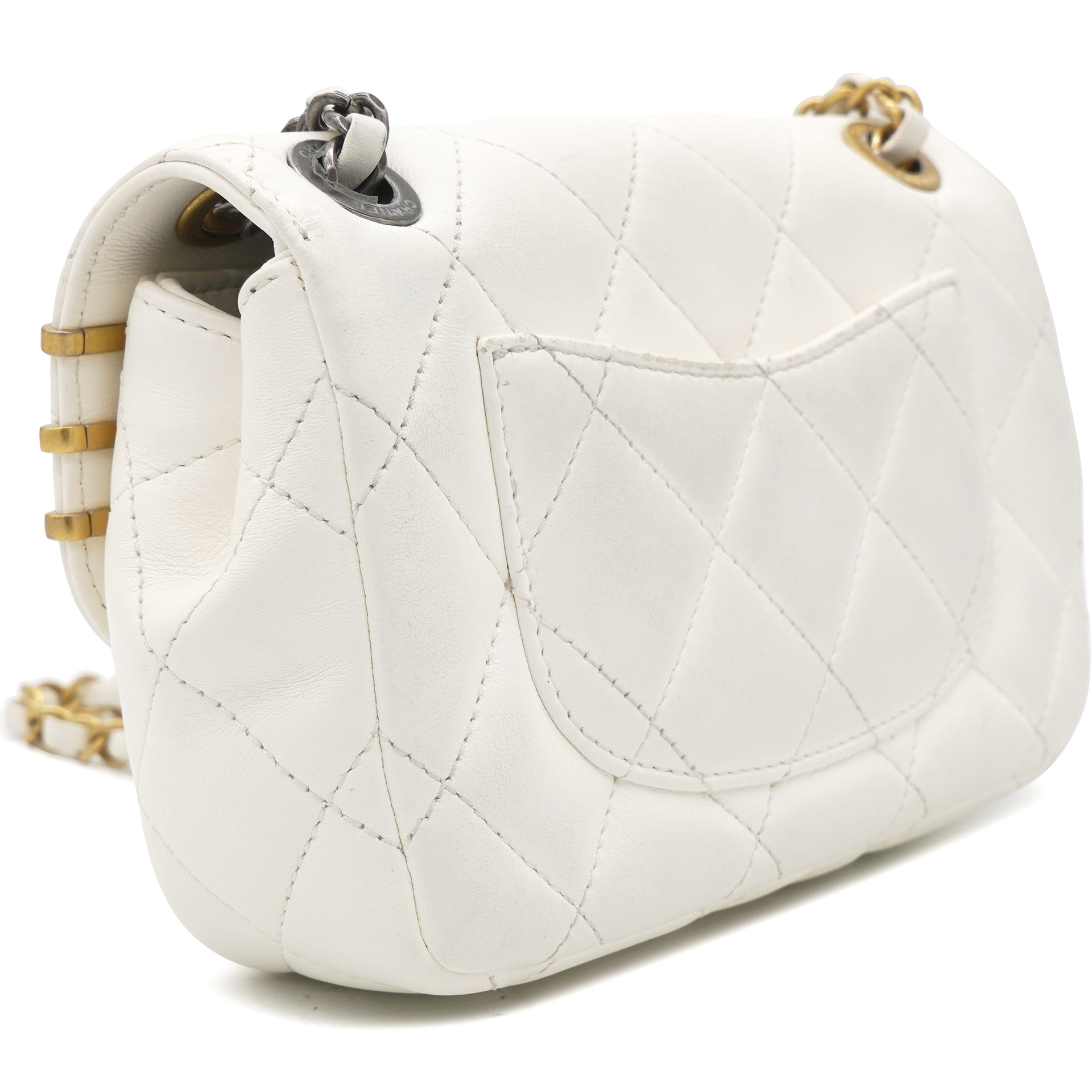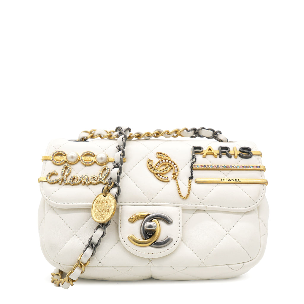This is an authentic CHANEL Lambskin Quilted Mini Coco Clips Flap in White. This chic bag is crafted of white lambskin leather with aged gold Chanel "clips" on the crossover flap. The bag features a leather-threaded aged gold and ruthenium chain shoulder strap and a matching CC turn lock. The front flap opens to gold leather interior with a patch pocket.