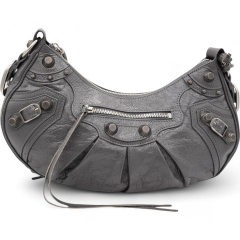 | Dark grey calf leather cracked texture adjustable shoulder strap metal eyelet detailing to the strap mirror tag stud and pleat detailing to the front decorative buckle detailing to the front main compartment internal logo patch full lining silver-tone hardware top zip fastening this piece comes complete with a protective dust bag. |