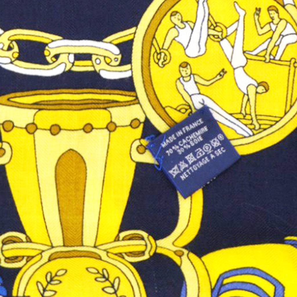 | This Les Trophees Shawl 140 from Hermes was designed by Pierre Marie and made in France with hand-rolled edges, using 70% cashmere and 30% silk. The shawl as a beautiful color palette in blues and golds, and depicts an ornate design with shelves packed with various sports trophies and mementos. This giant scarf is supple, light and easy to wear, and is the ideal companion for wrapping up on cold days. |