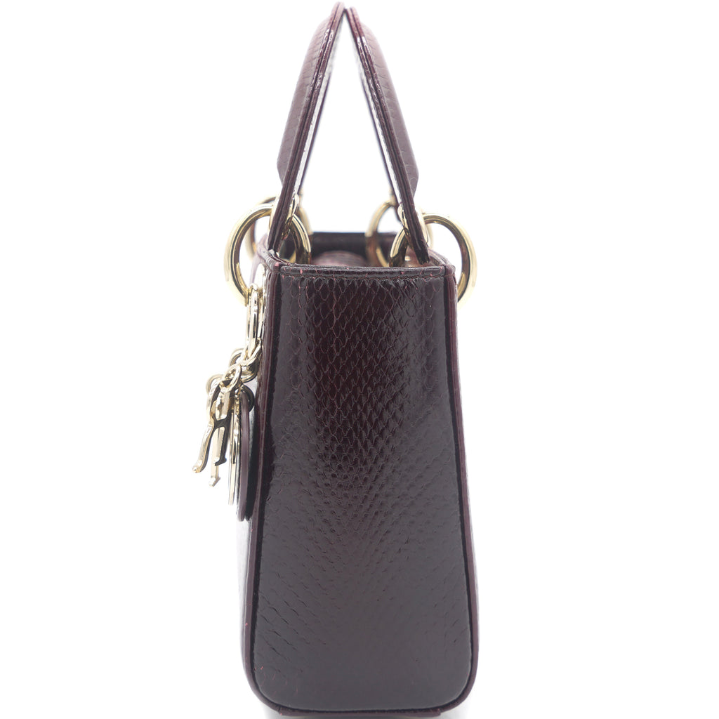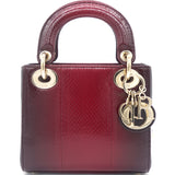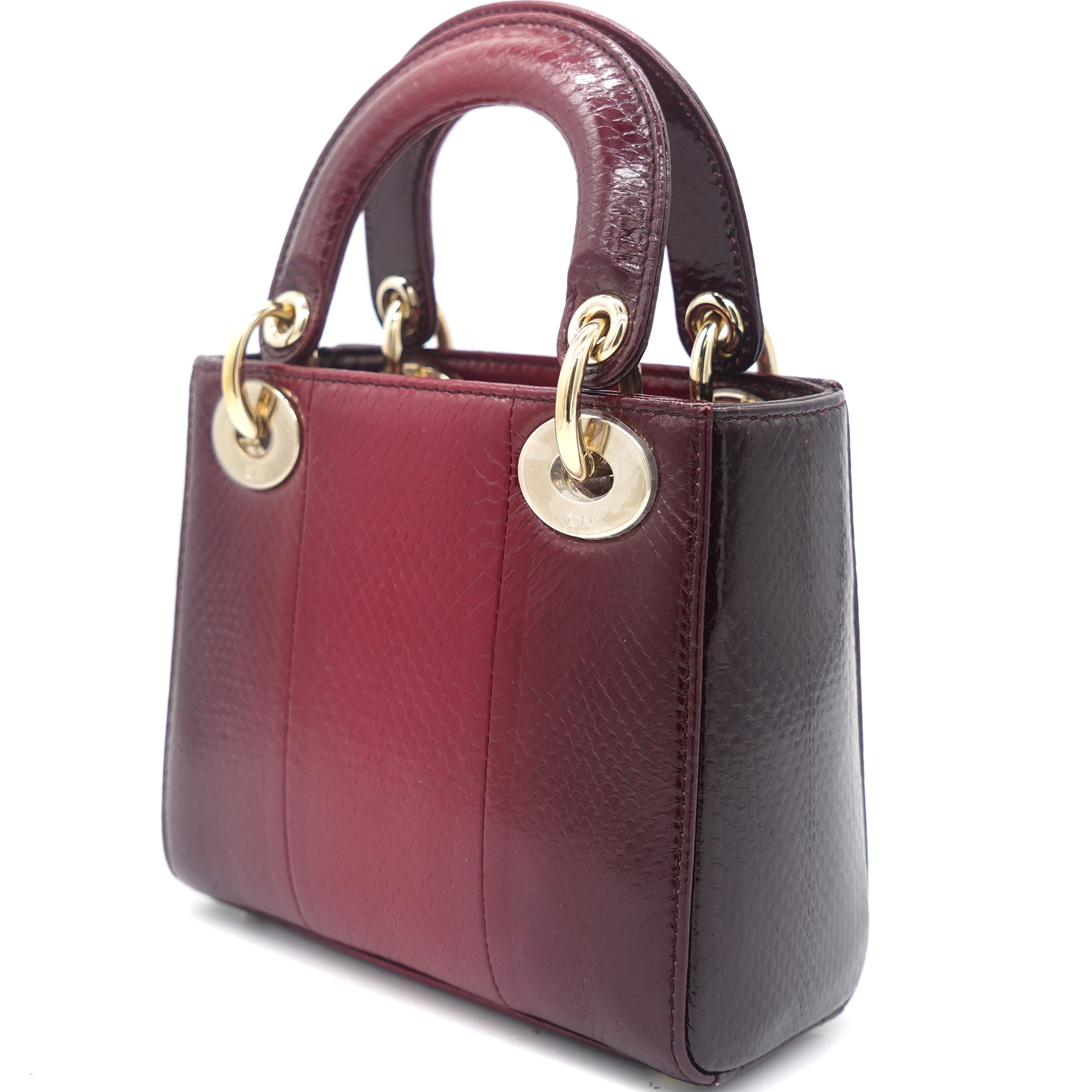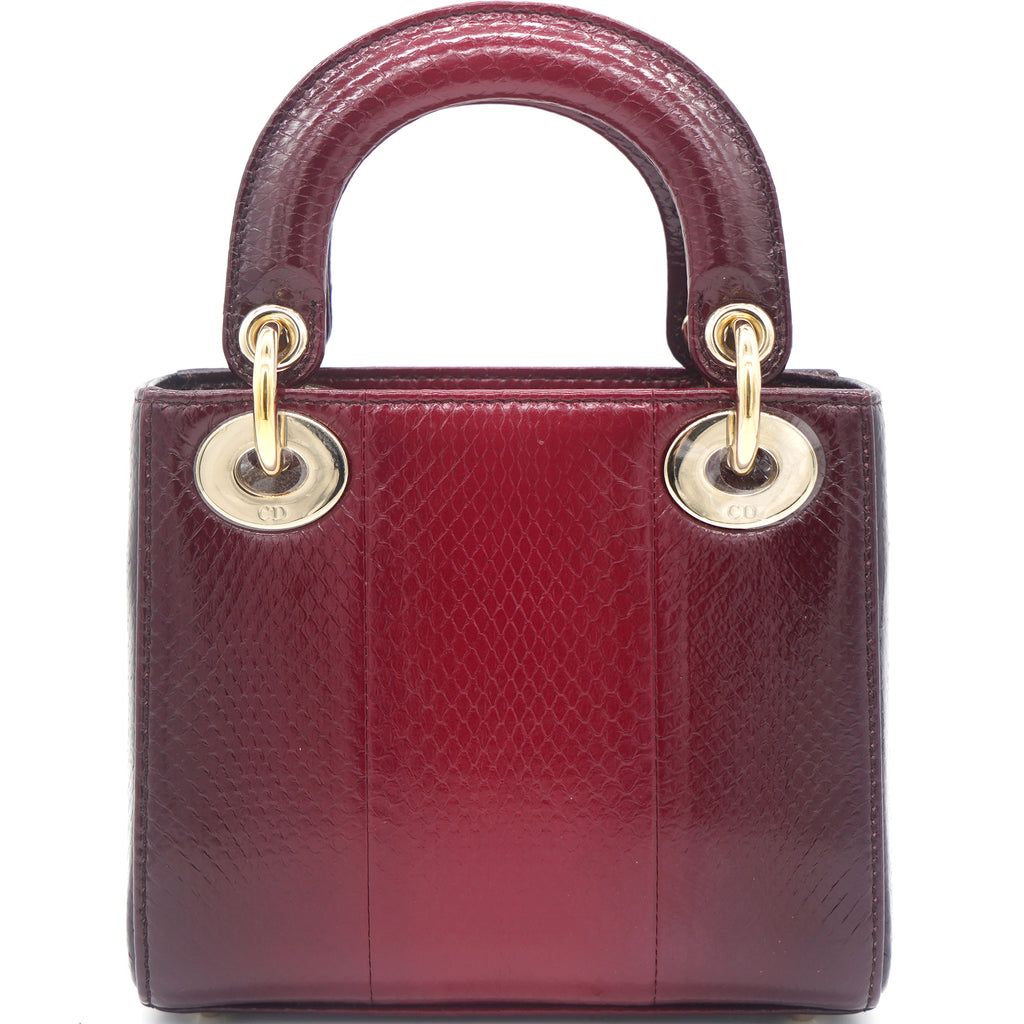 | This delightful tote is crafted of beautifully textured red python with matching leather top handles. The handbag features polished gold hardware including handle rings, large decorative eyelets, and hanging Dior initial charms. The bag has a suede leather interior with a zipper and flat pockets. |