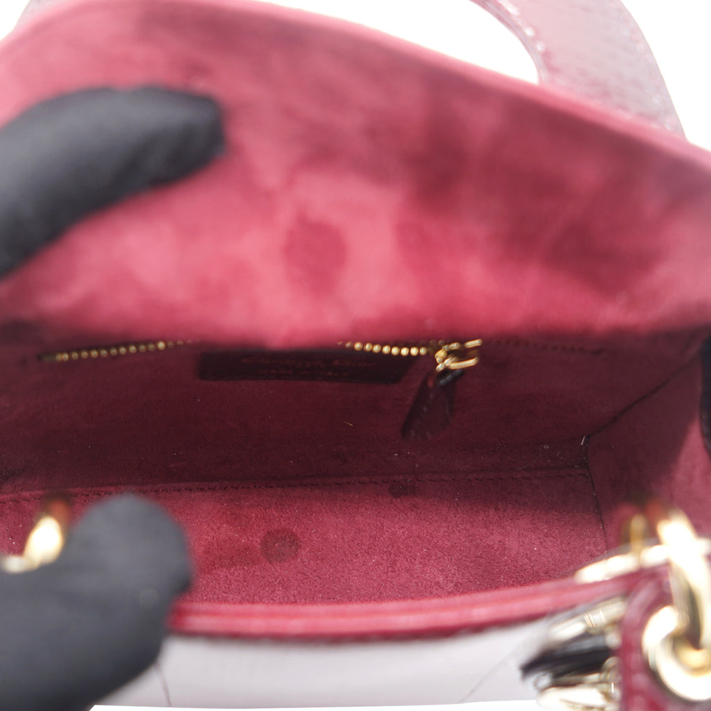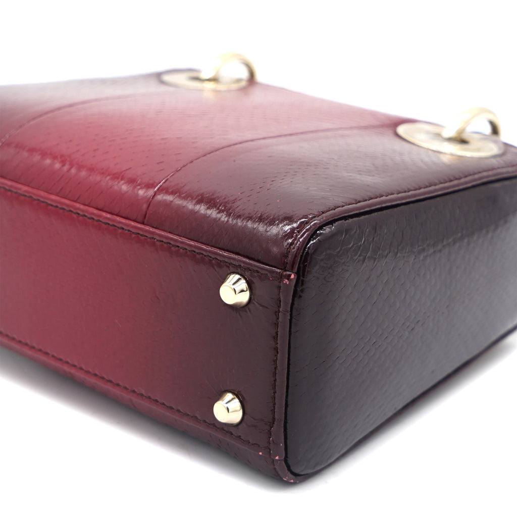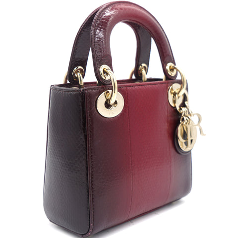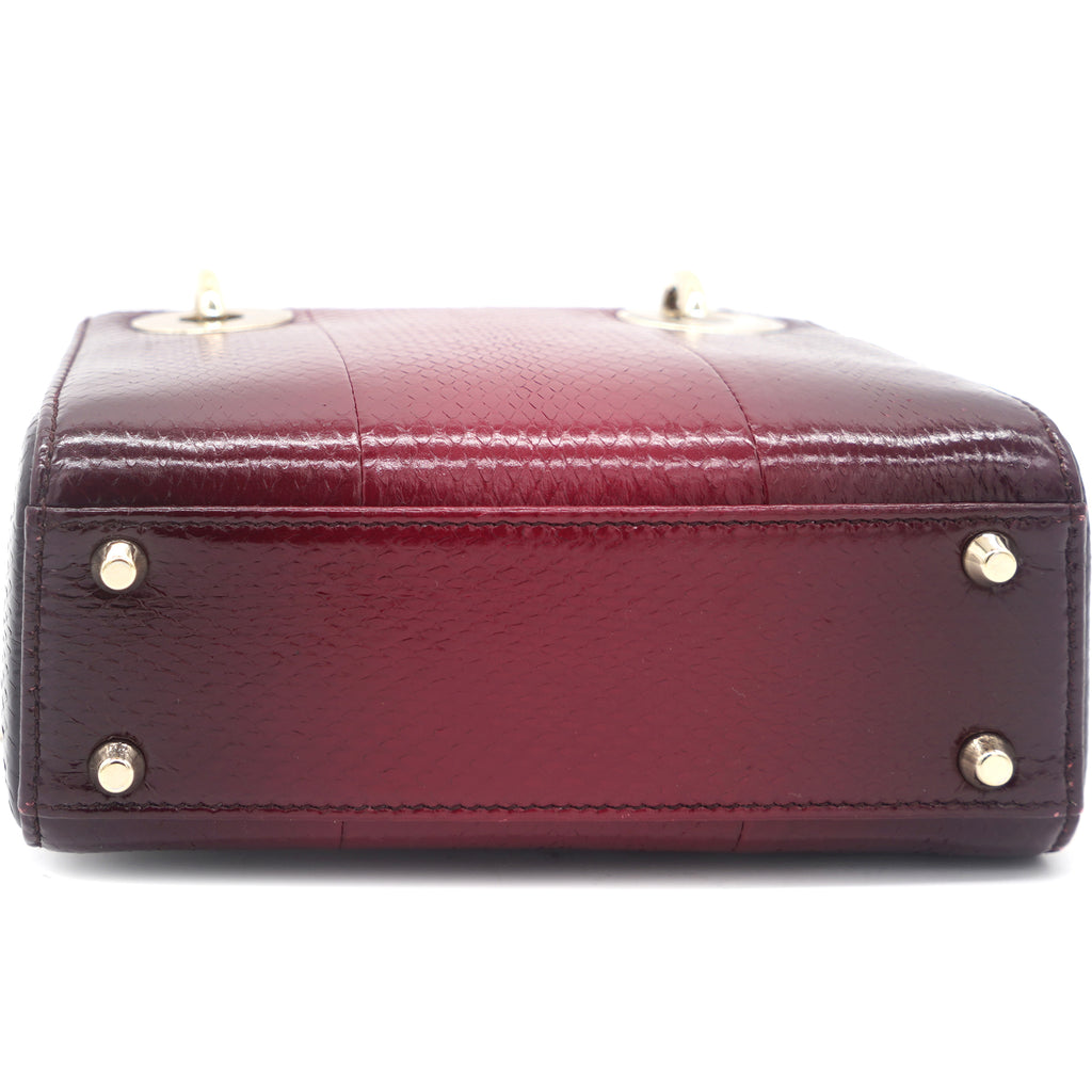 | This delightful tote is crafted of beautifully textured red python with matching leather top handles. The handbag features polished gold hardware including handle rings, large decorative eyelets, and hanging Dior initial charms. The bag has a suede leather interior with a zipper and flat pockets. |