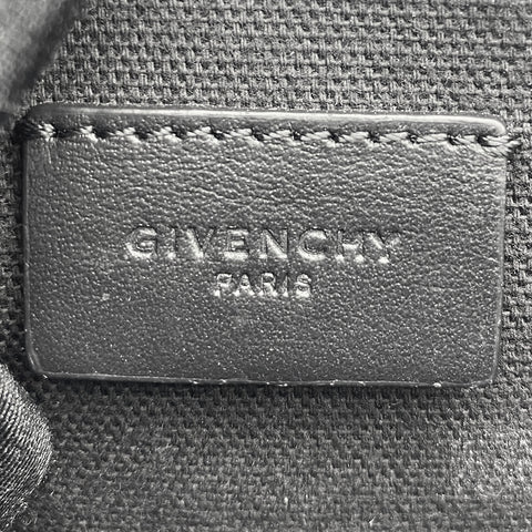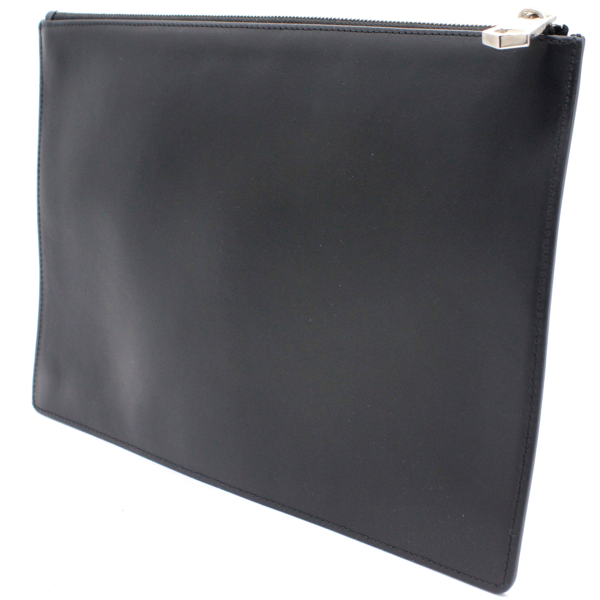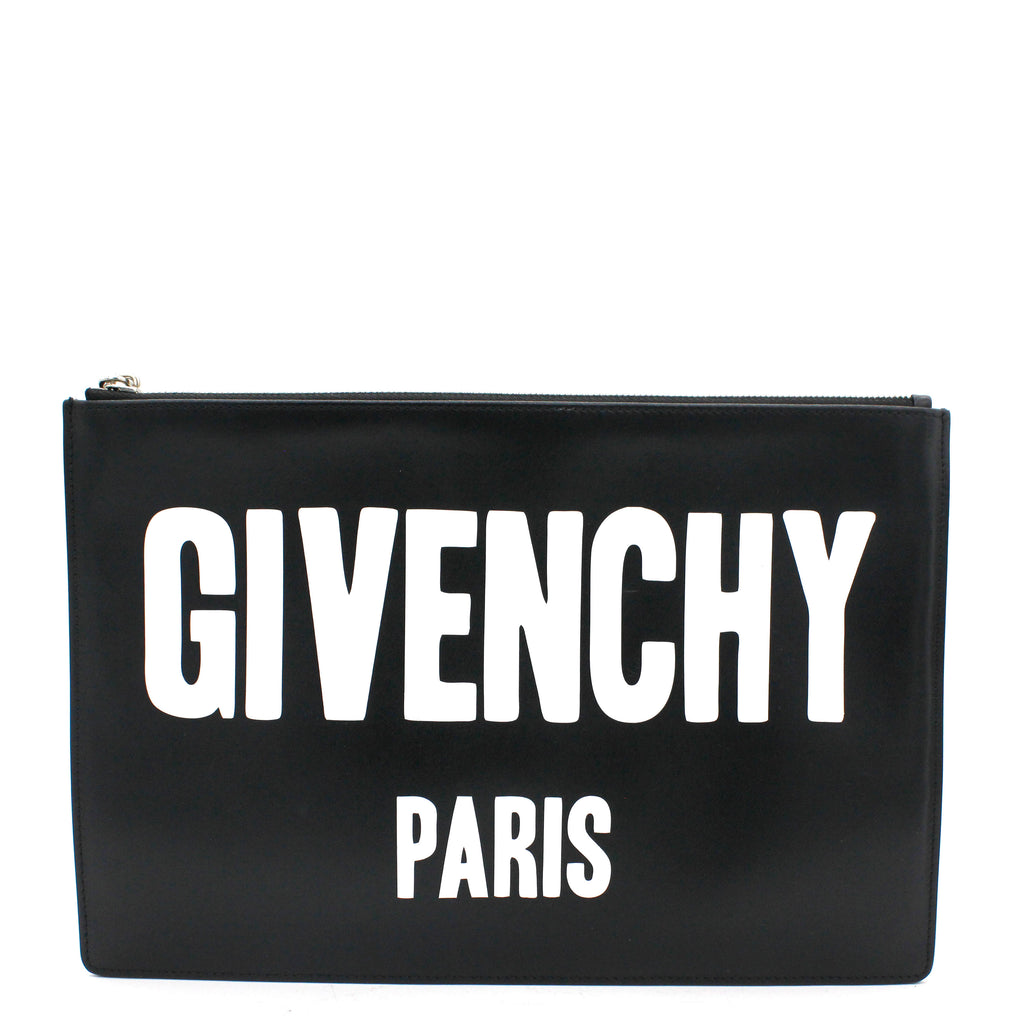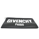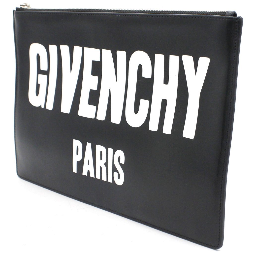 | Black and white logo printed leather Givenchy Dragon Printed clutch with silver-tone hardware, tonal woven lining, and zip closure at top. |