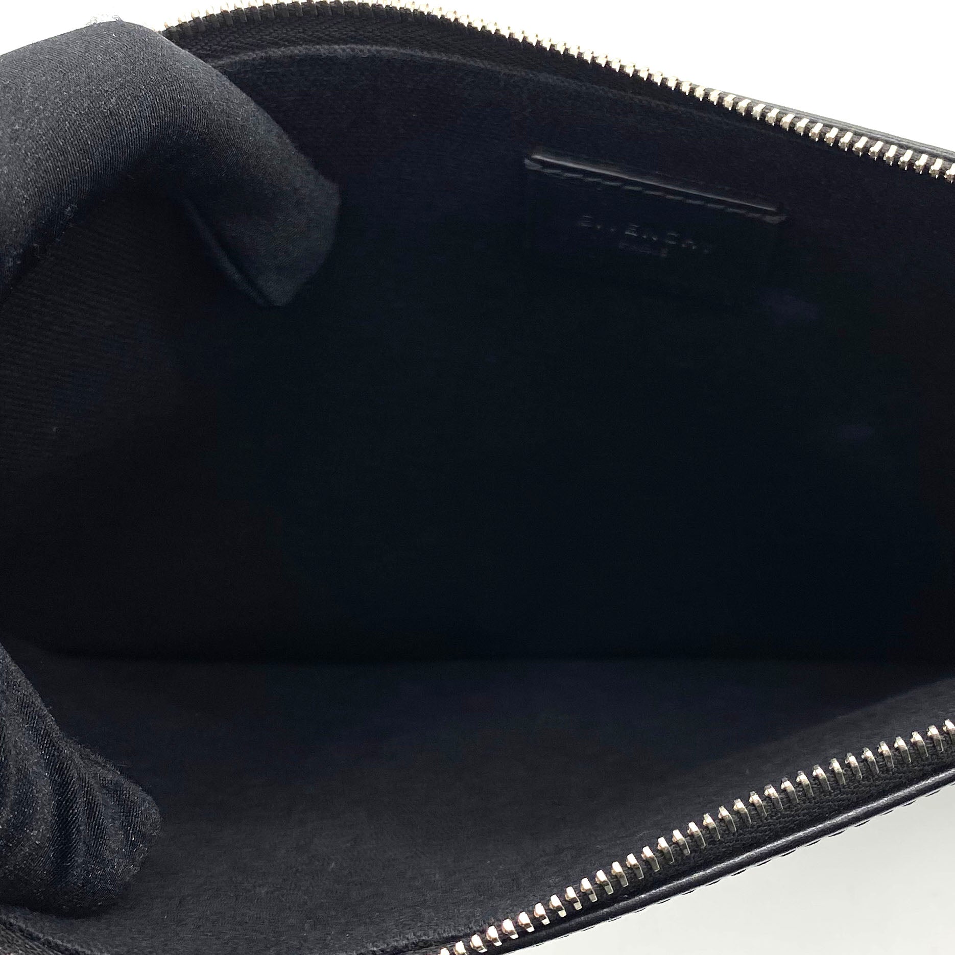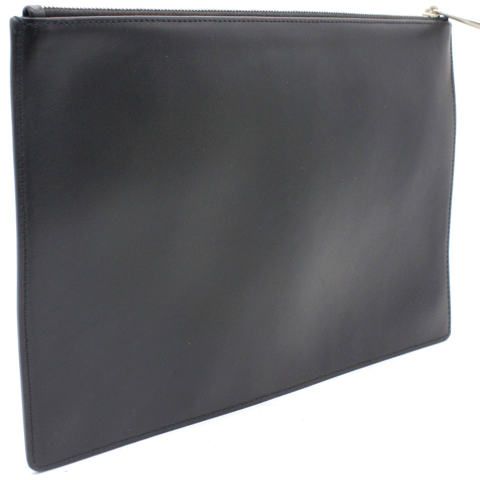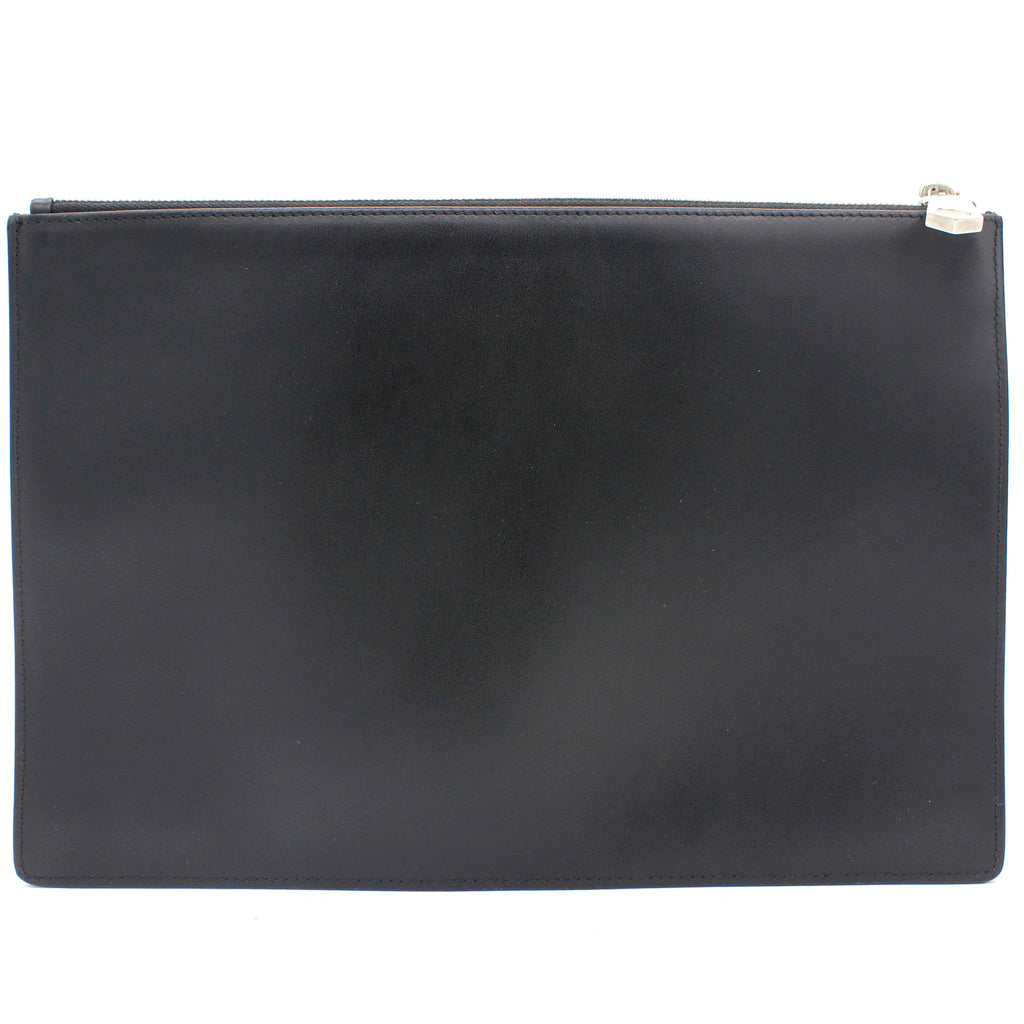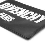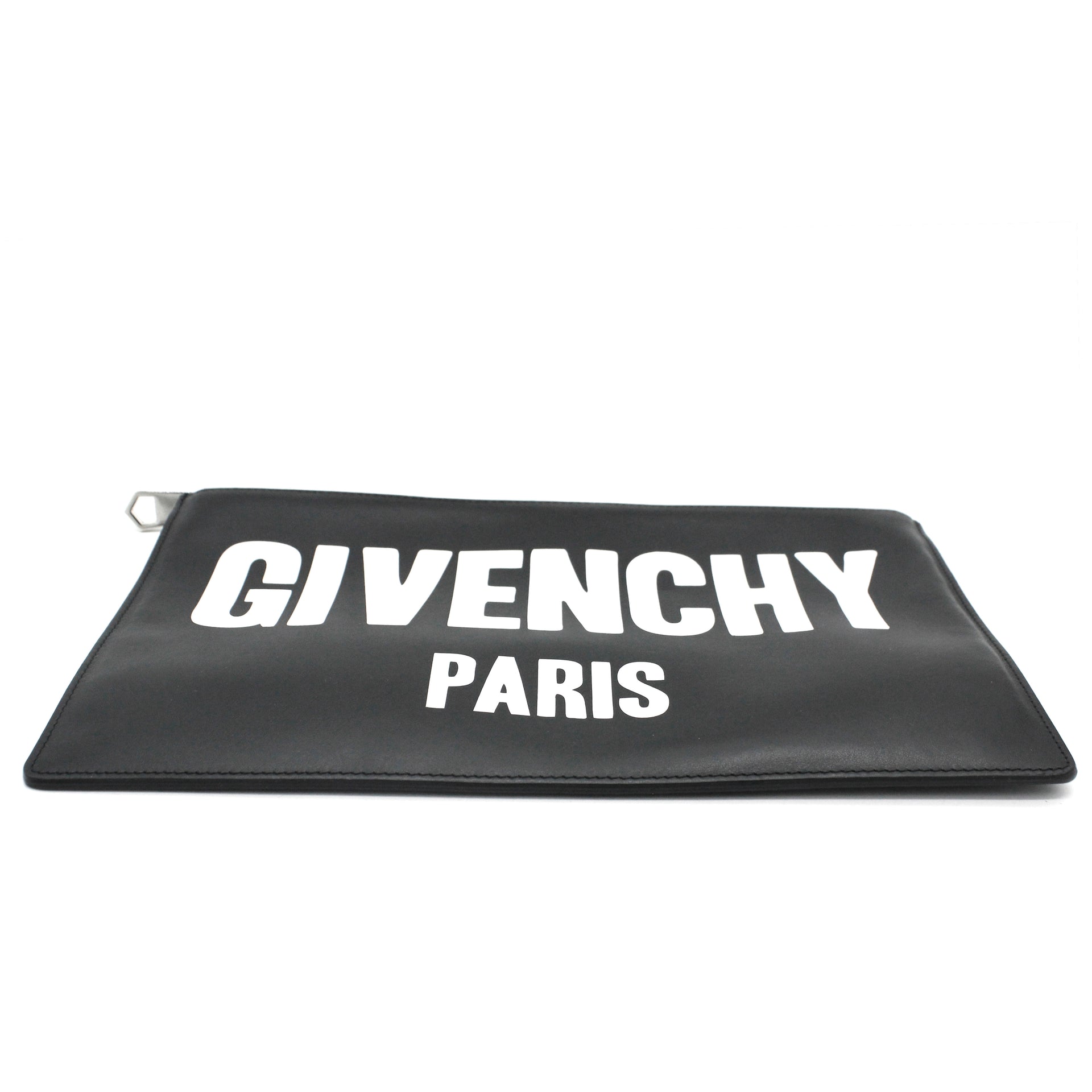 | Black and white logo printed leather Givenchy Dragon Printed clutch with silver-tone hardware, tonal woven lining, and zip closure at top. |
