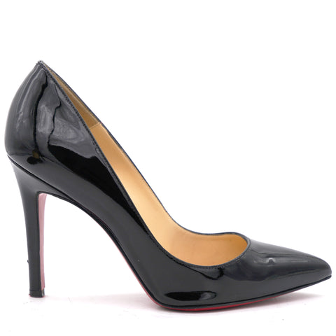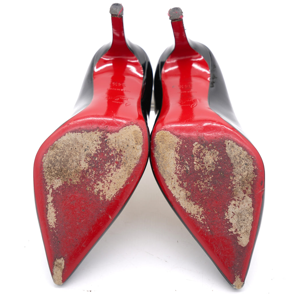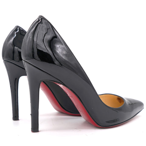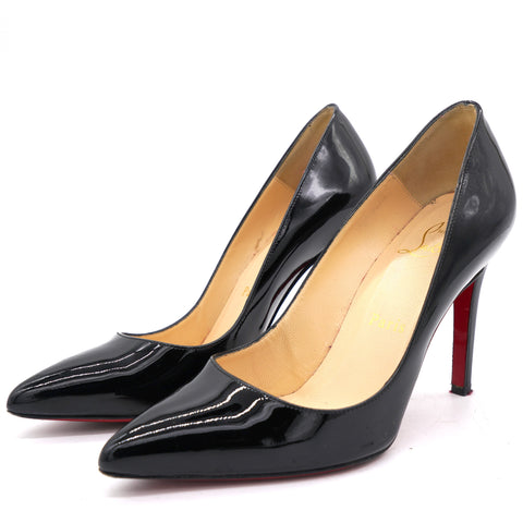 | Louboutins are designed to lift one's attitude and outfit. Let this pair lift yours as well by owning them today. Crafted from patent leather, these black pumps carry pointy toes and a sleek silhouette. Completed with stiletto heels and the signature red soles, these pumps will surely attract admiring glances. |
