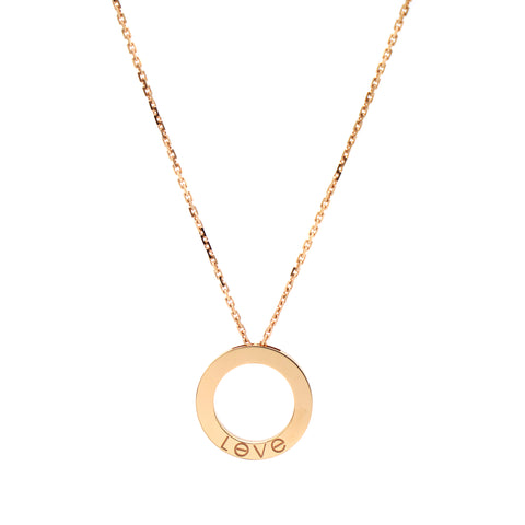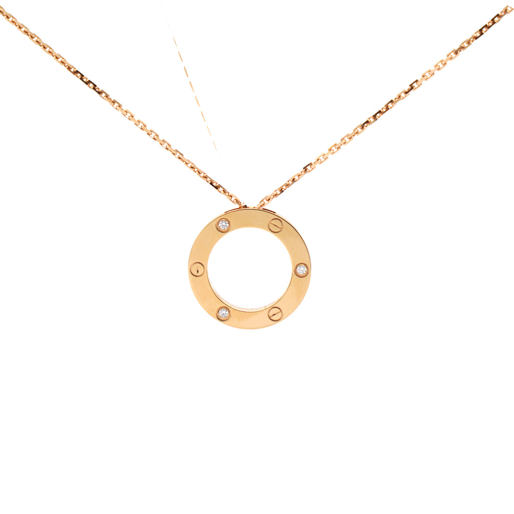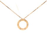 | One of the most loved designs from the house of Cartier, this stunning Love pendant is an icon of style and luxury. Constructed in 18k Rose gold, this necklace features screw details all around the surface as symbols of a sealed and secured bond adorned with 3 diamonds on the pendant. This necklace is sure to become your everyday essential. |