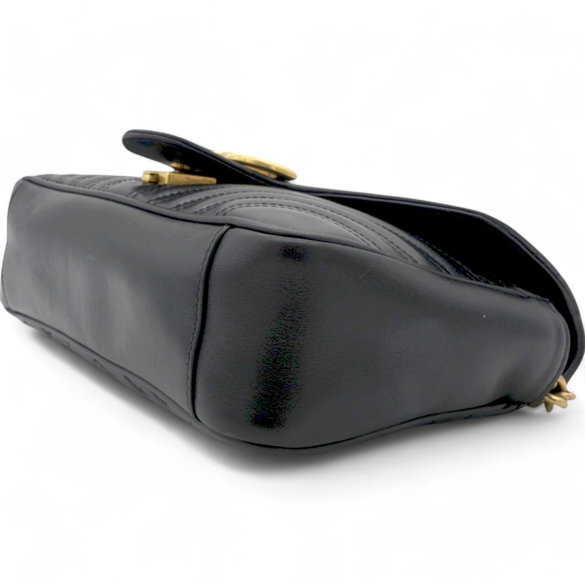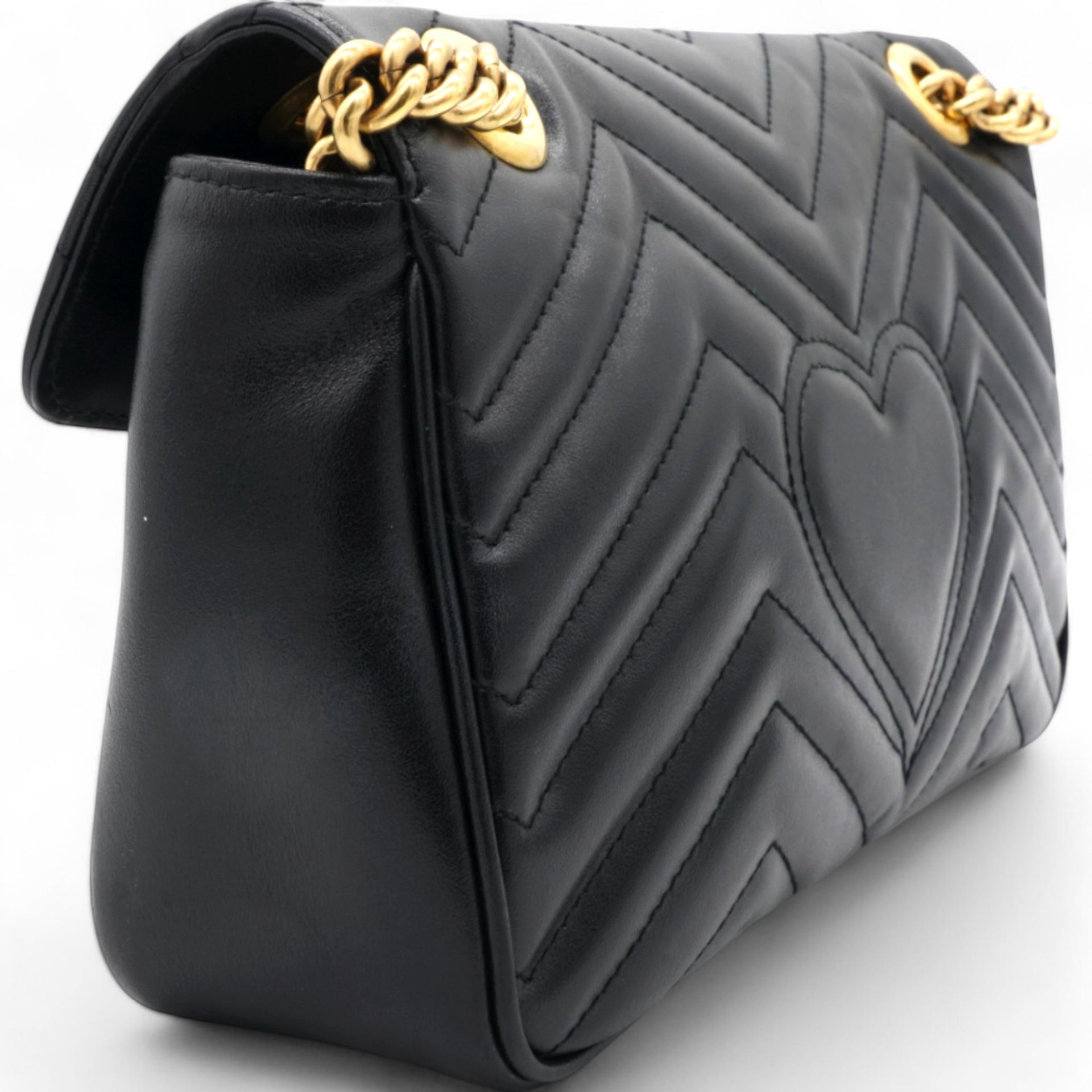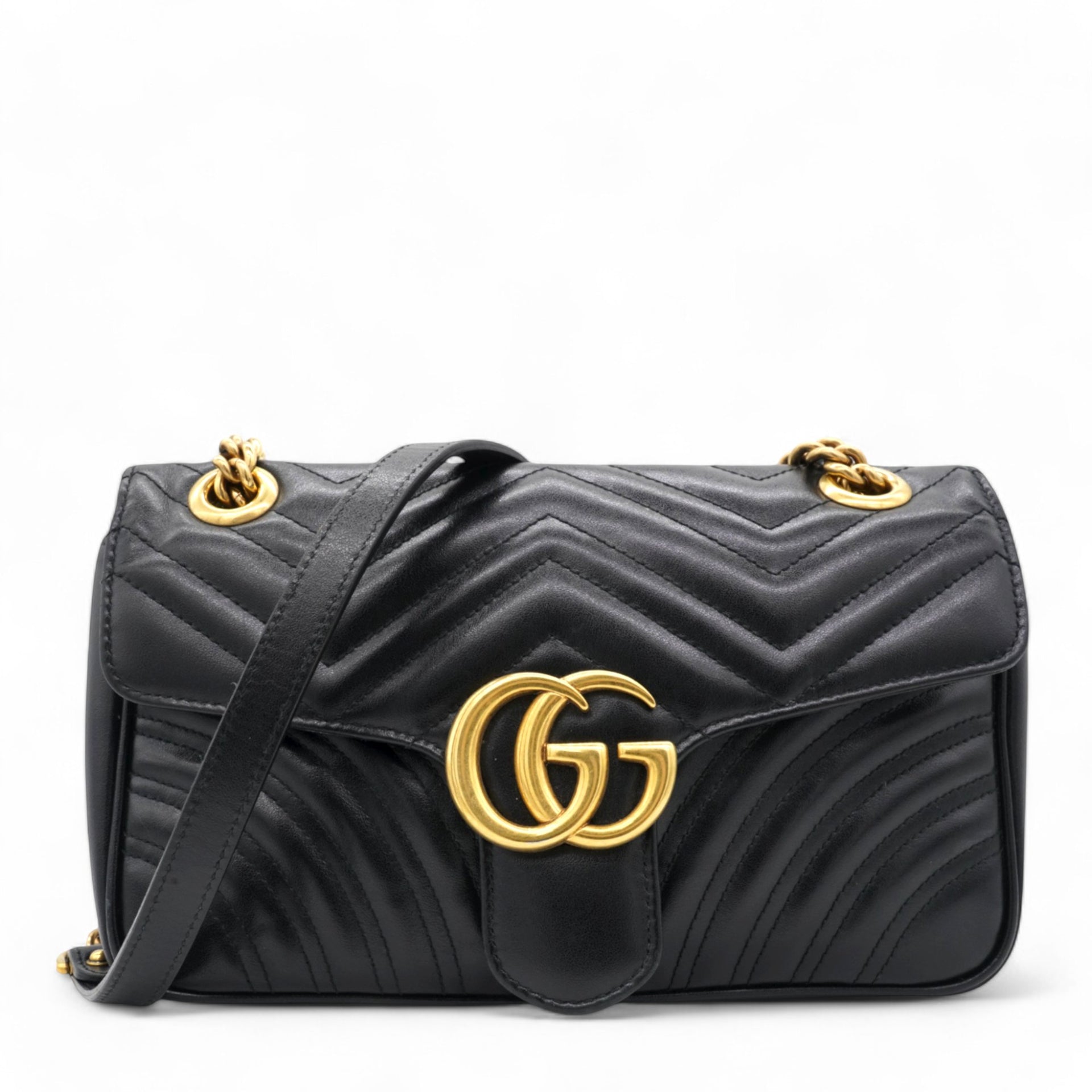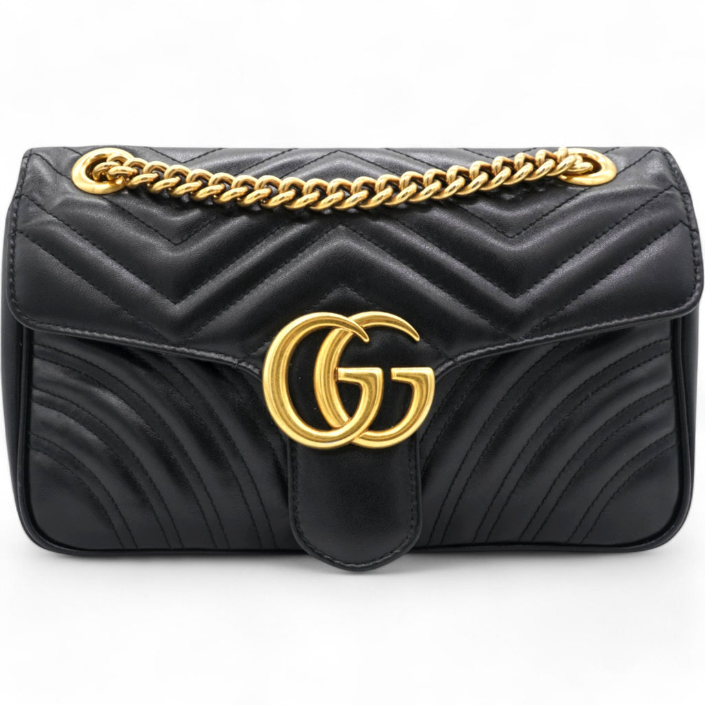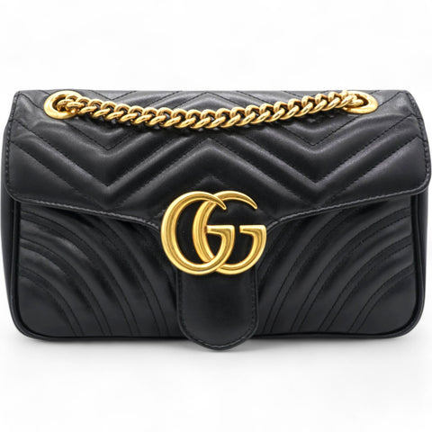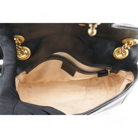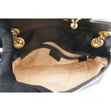 This shoulder bag is crafted of quilted calfskin leather in black. The bag features aged gold chainlink shoulder straps with black leather shoulder pads and an aged gold Gucci GG logo on the front. The crossover flap opens with a concealed press lock to a beige suede interior with zipper and flat pockets.