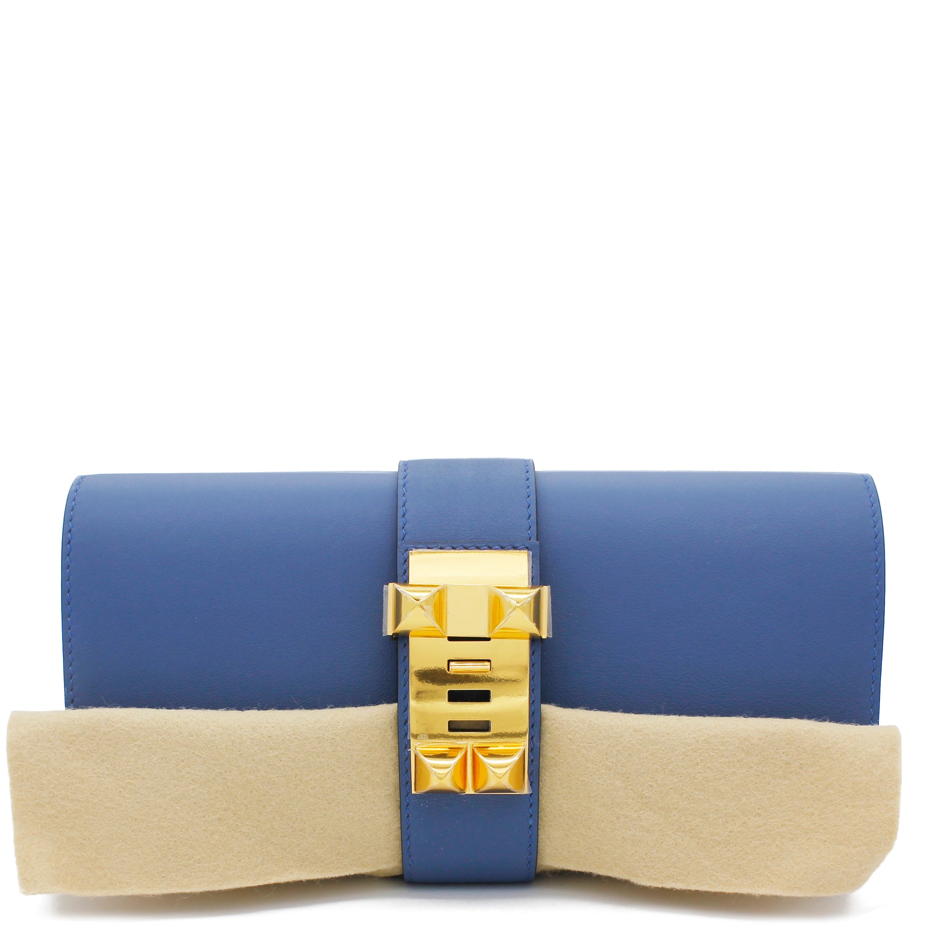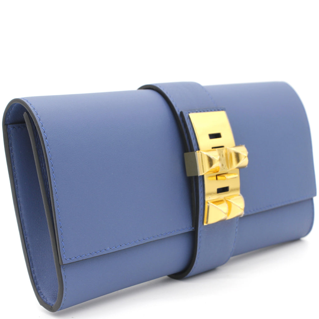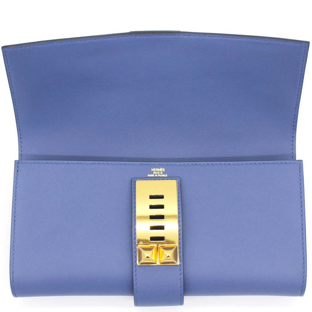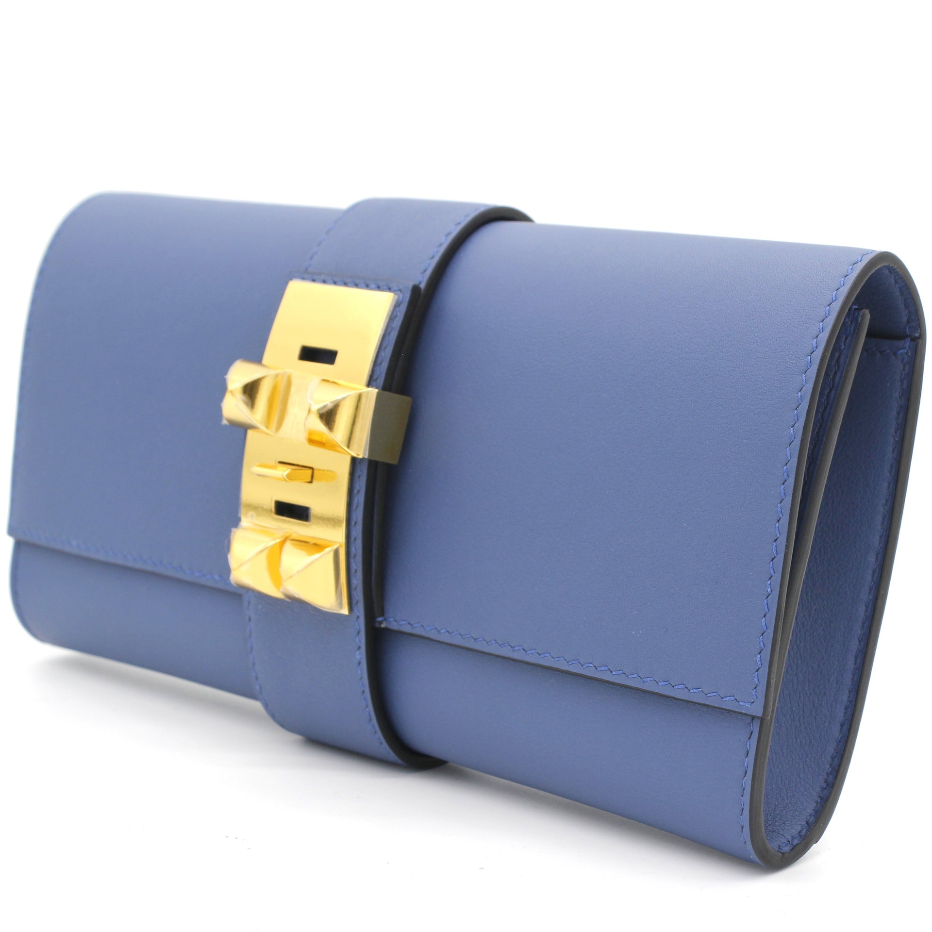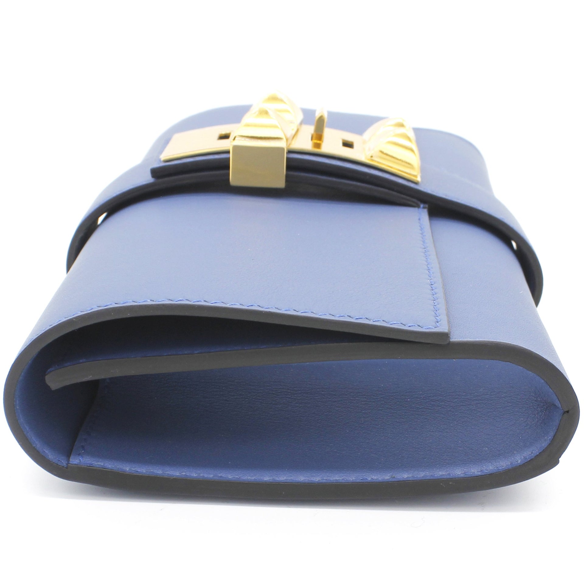| Blue leather Medor clutch from Hermès featuring a foldover top, a gold-tone buckle, a main internal compartment, an internal slip pocket and an internal logo stamp. |