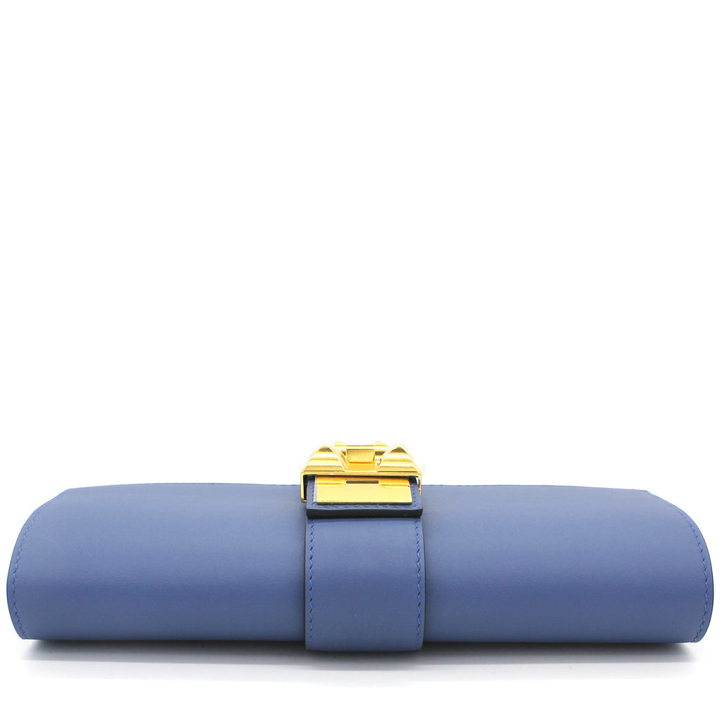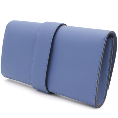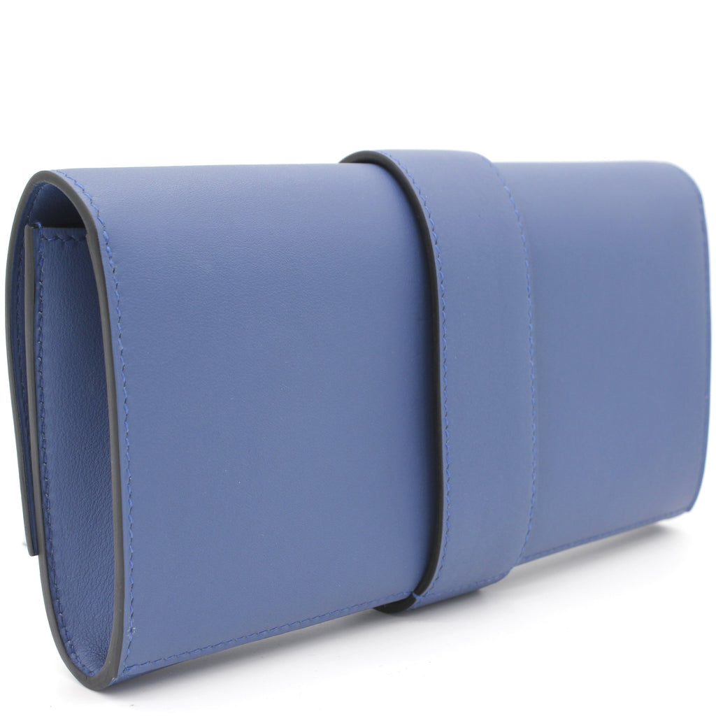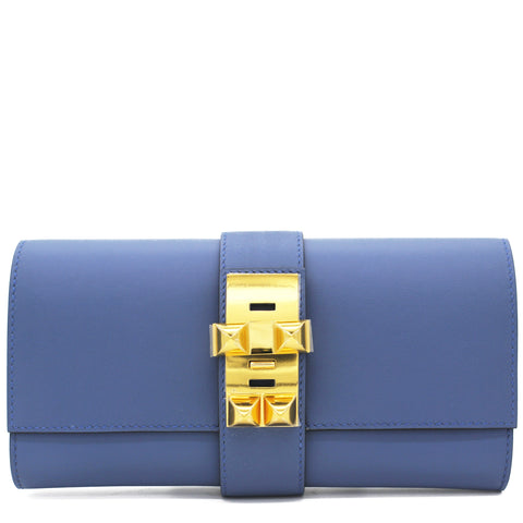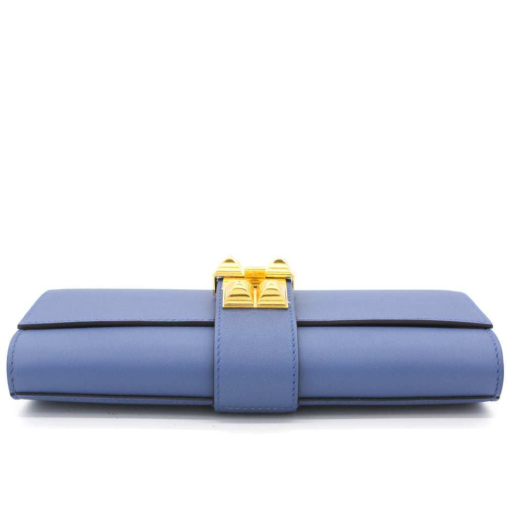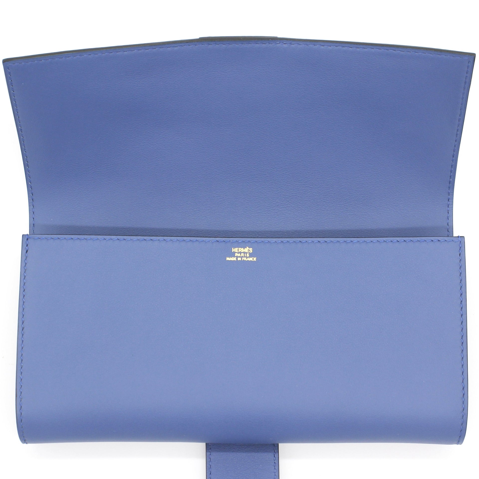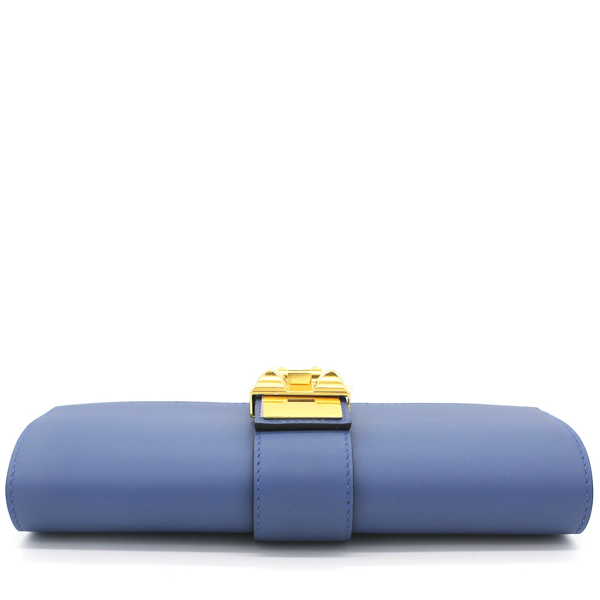 | Blue leather Medor clutch from Hermès featuring a foldover top, a gold-tone buckle, a main internal compartment, an internal slip pocket and an internal logo stamp. |