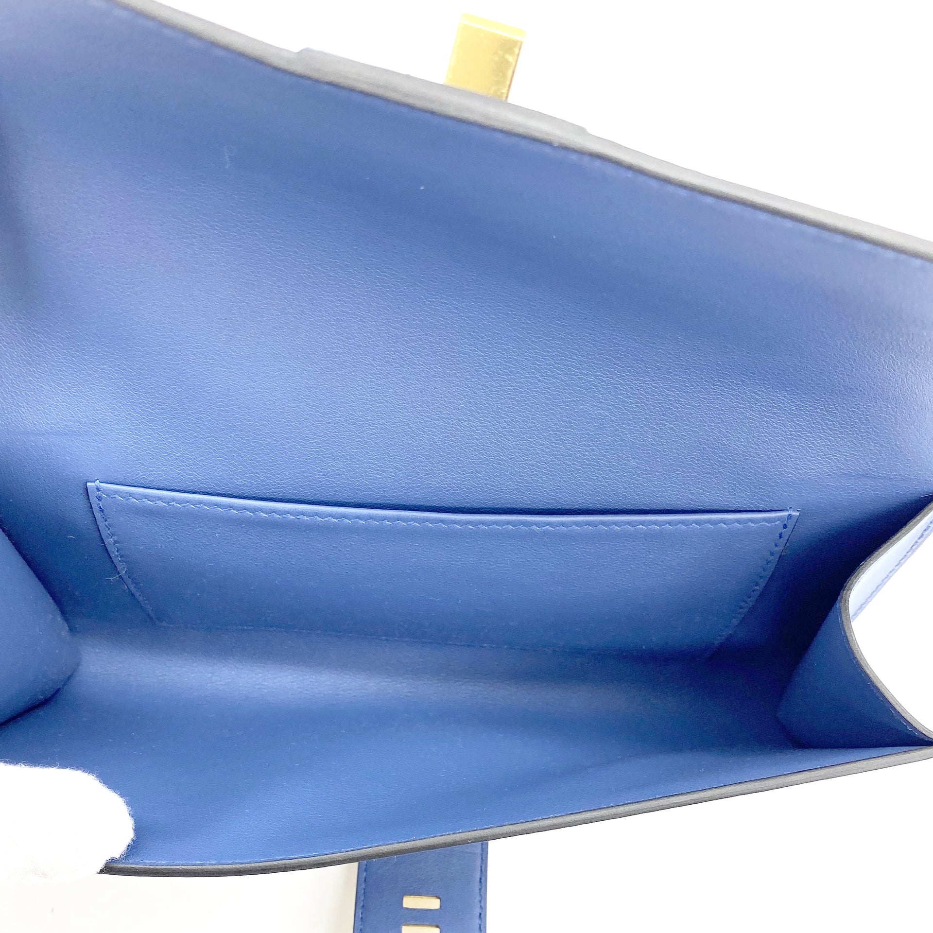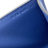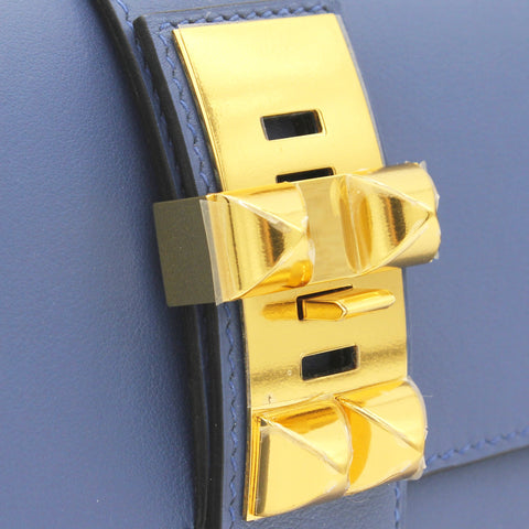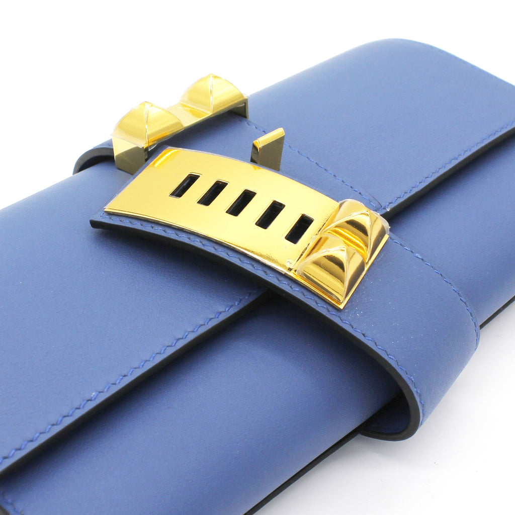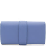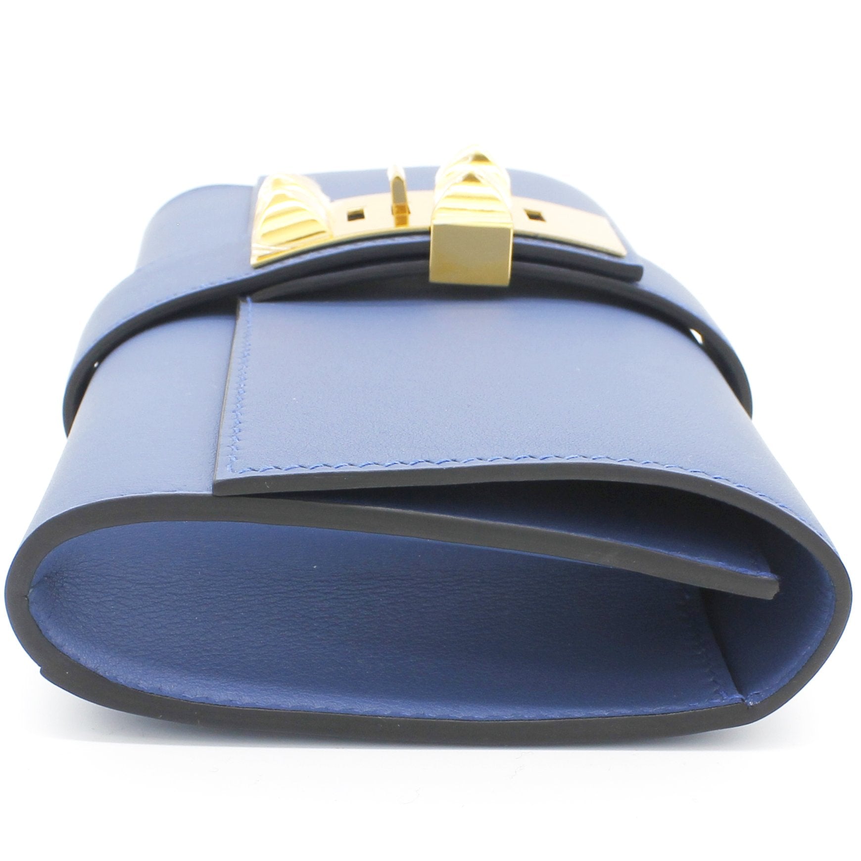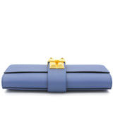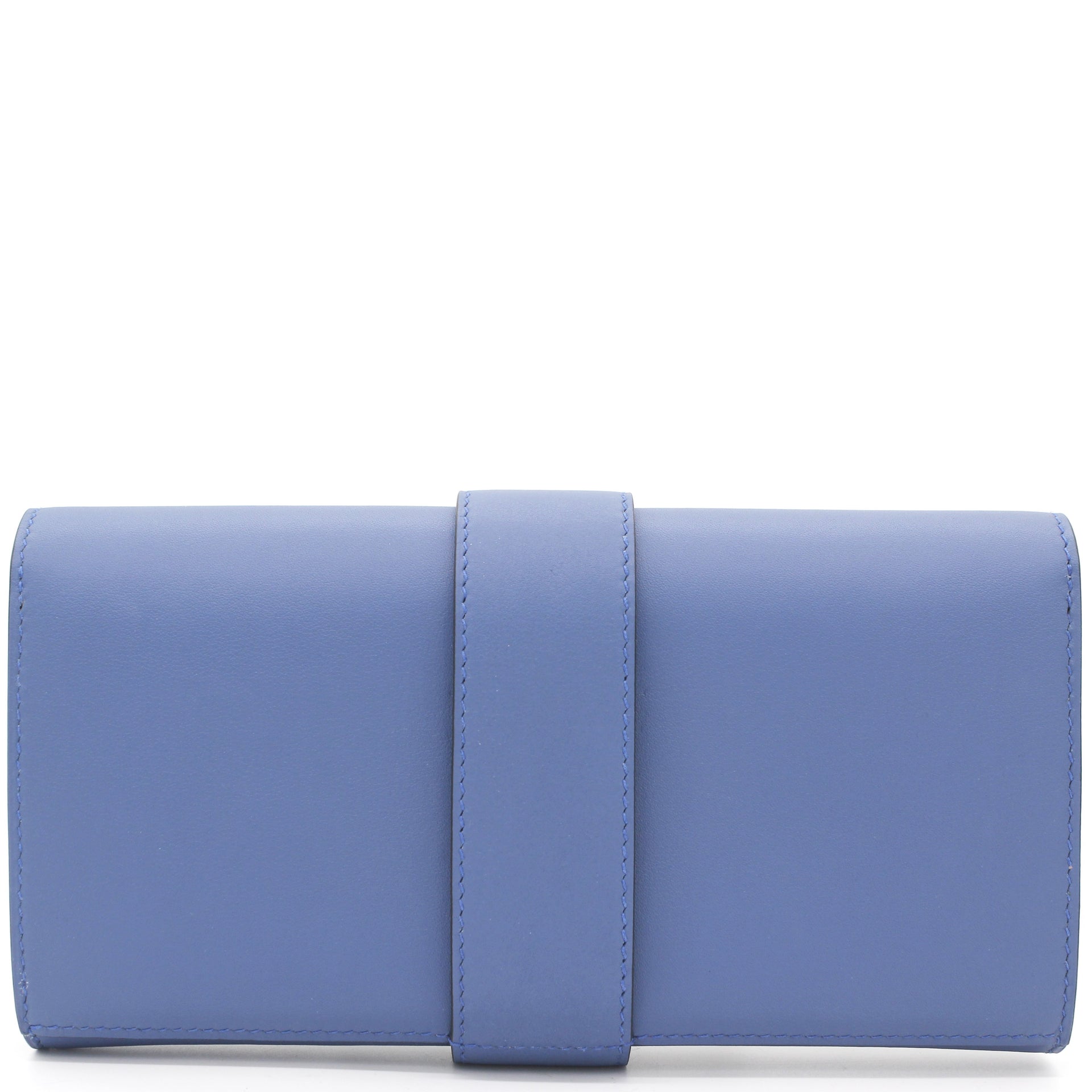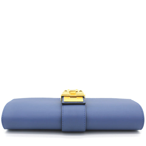 | Blue leather Medor clutch from Hermès featuring a foldover top, a gold-tone buckle, a main internal compartment, an internal slip pocket and an internal logo stamp. |