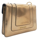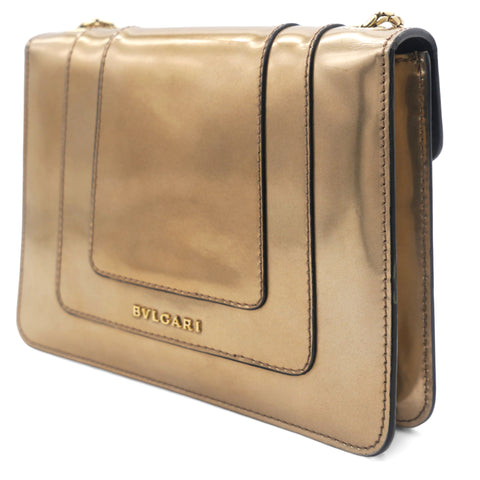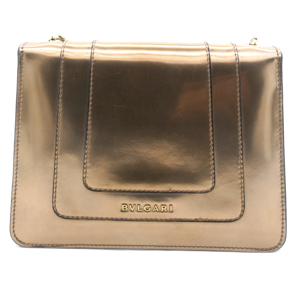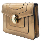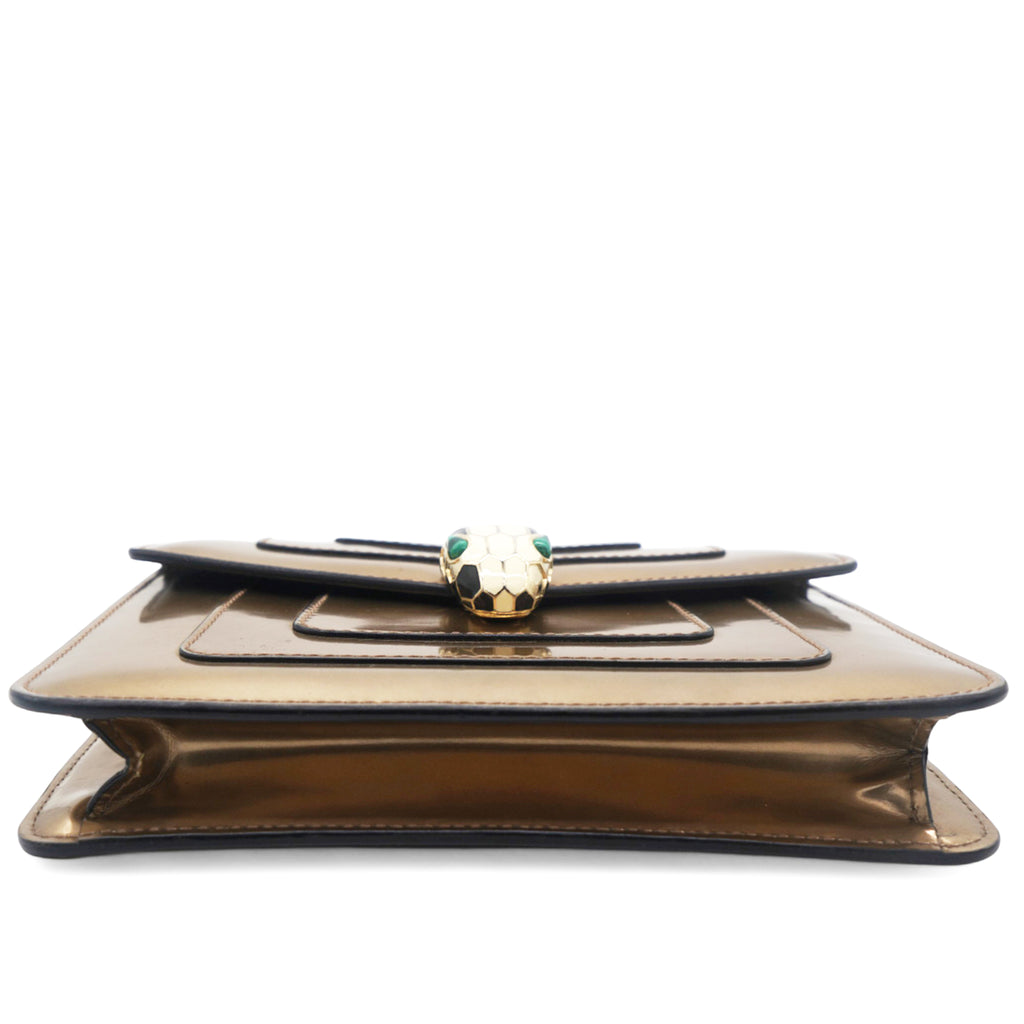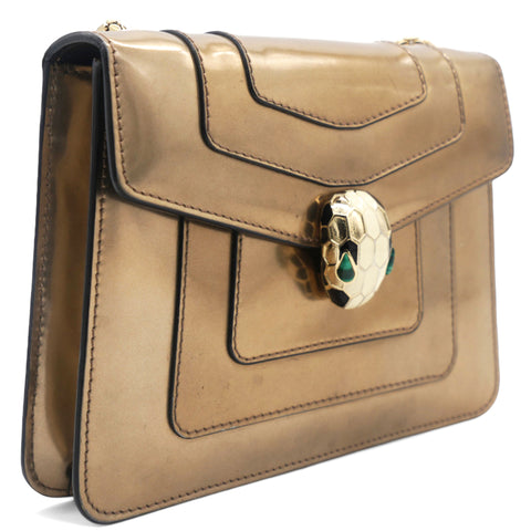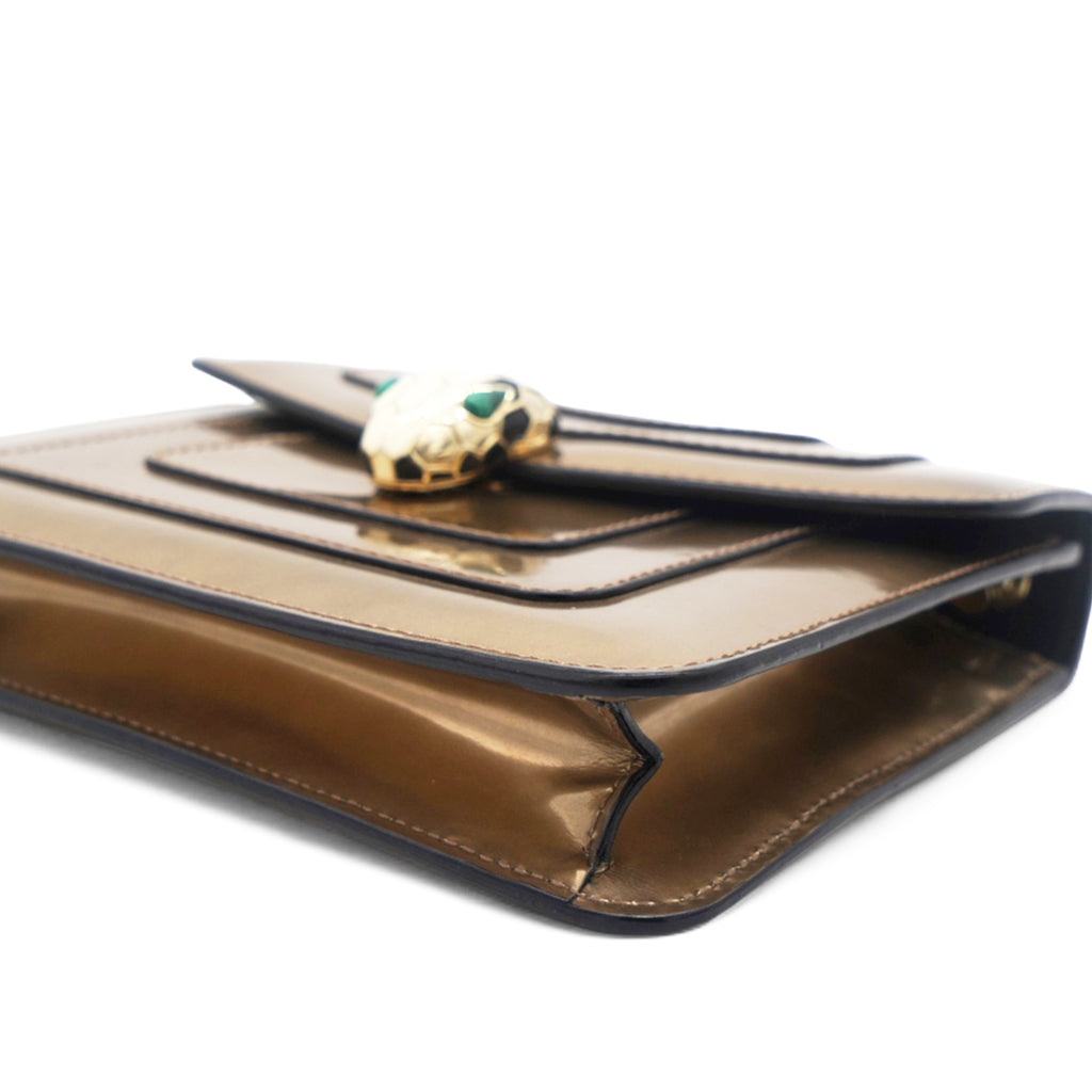 This is a BULGARI Metallic Calfskin Serpenti Forever Crossbody Bag in Bronze. This striking bag is crafted of calfskin leather in metallic bronze and features a front flap with an enameled snake head closure, gold hardware, and a chain shoulder strap. The flap opens to a black fabric interior with a small patch pocket.