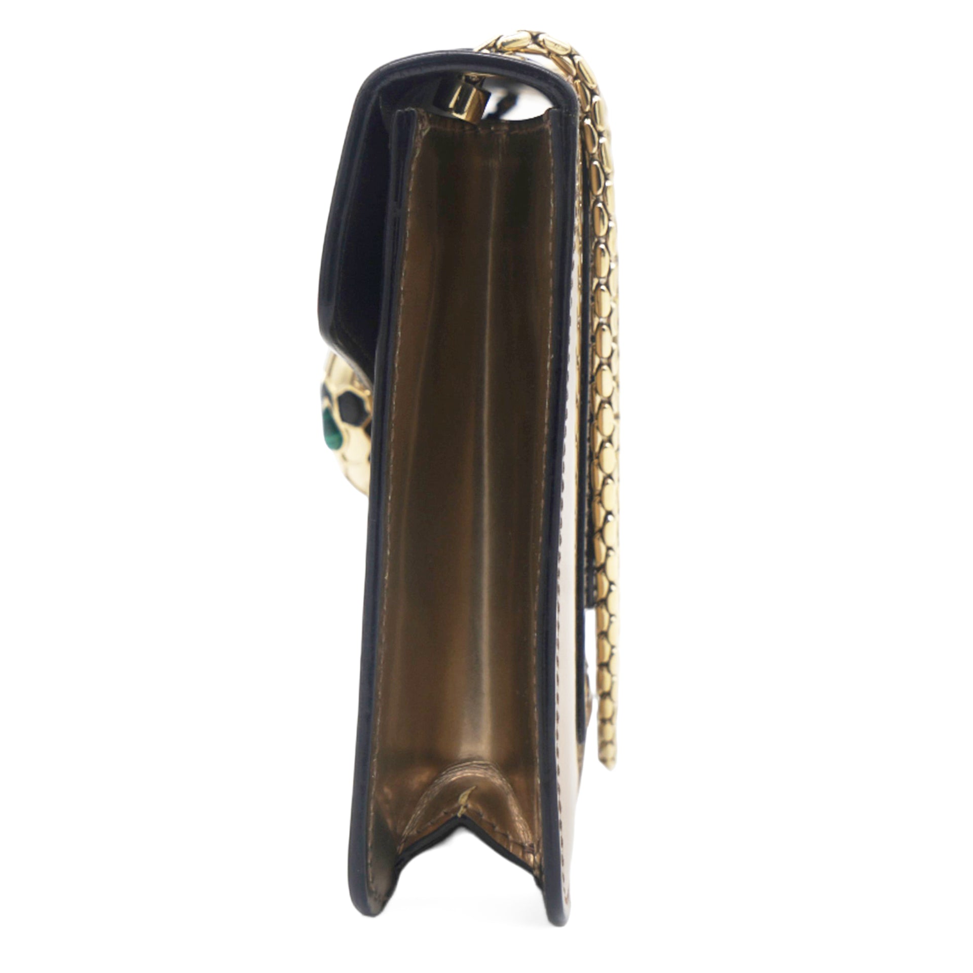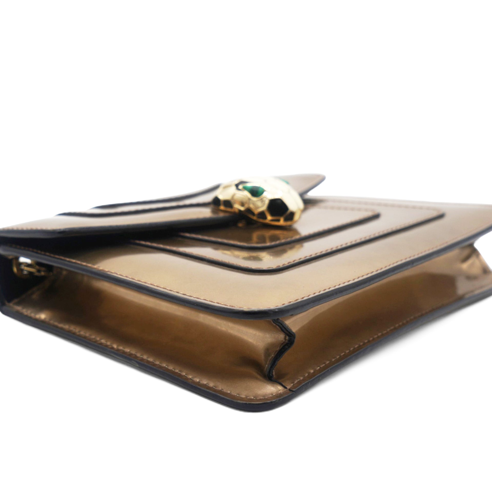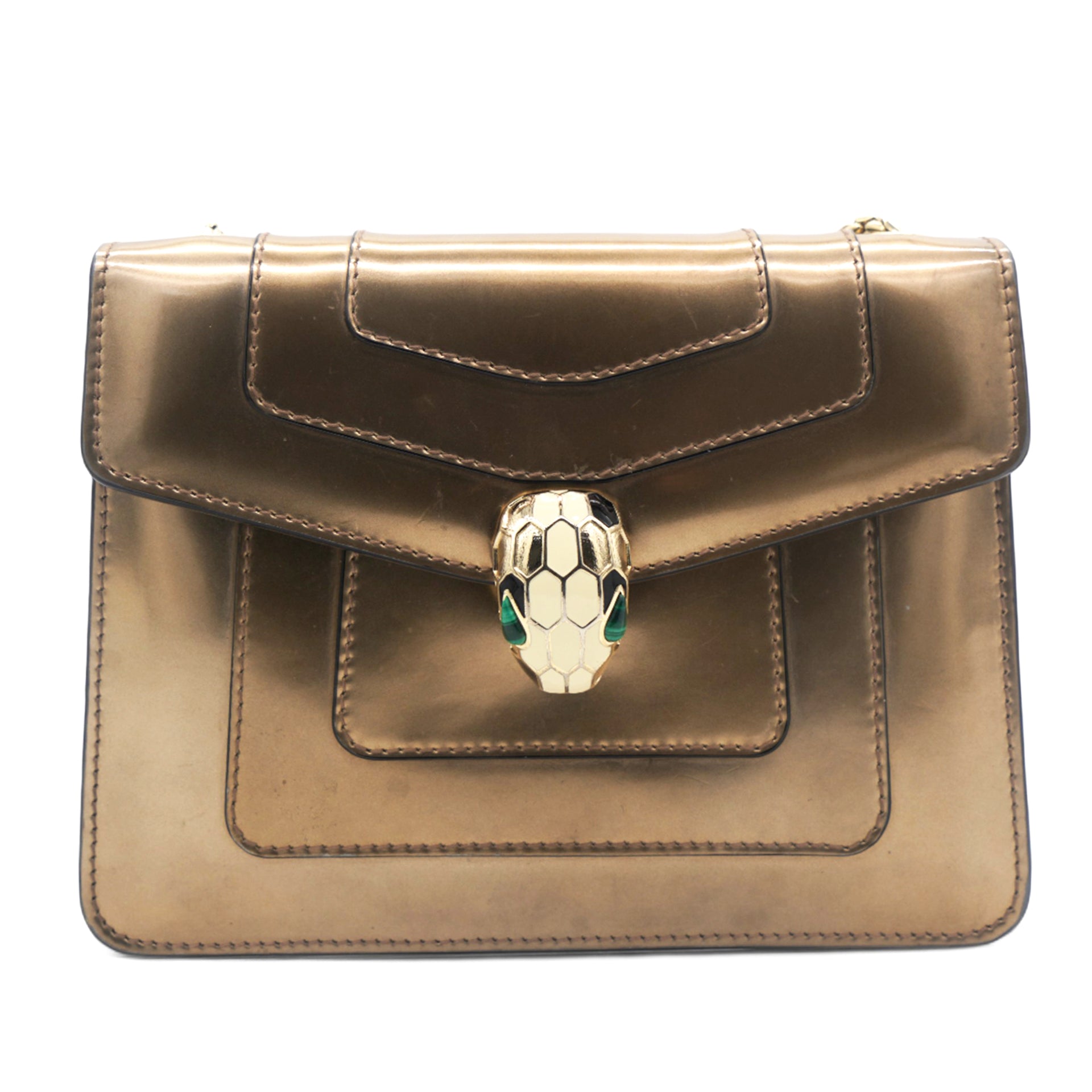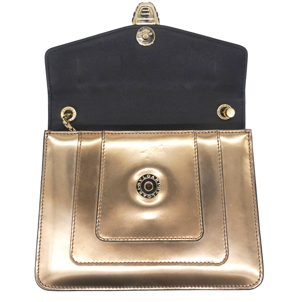 This is a BULGARI Metallic Calfskin Serpenti Forever Crossbody Bag in Bronze. This striking bag is crafted of calfskin leather in metallic bronze and features a front flap with an enameled snake head closure, gold hardware, and a chain shoulder strap. The flap opens to a black fabric interior with a small patch pocket.