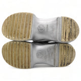 | These stylish sneakers are crafted of exquisite silver patent leather with white mesh fabric. They feature silver leather trim at the heel, and large white rubber soles. |