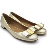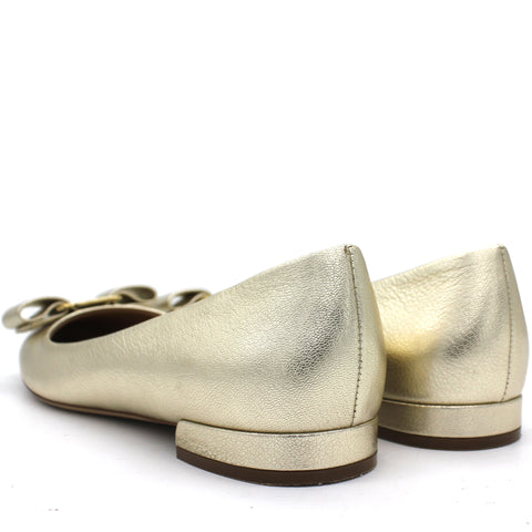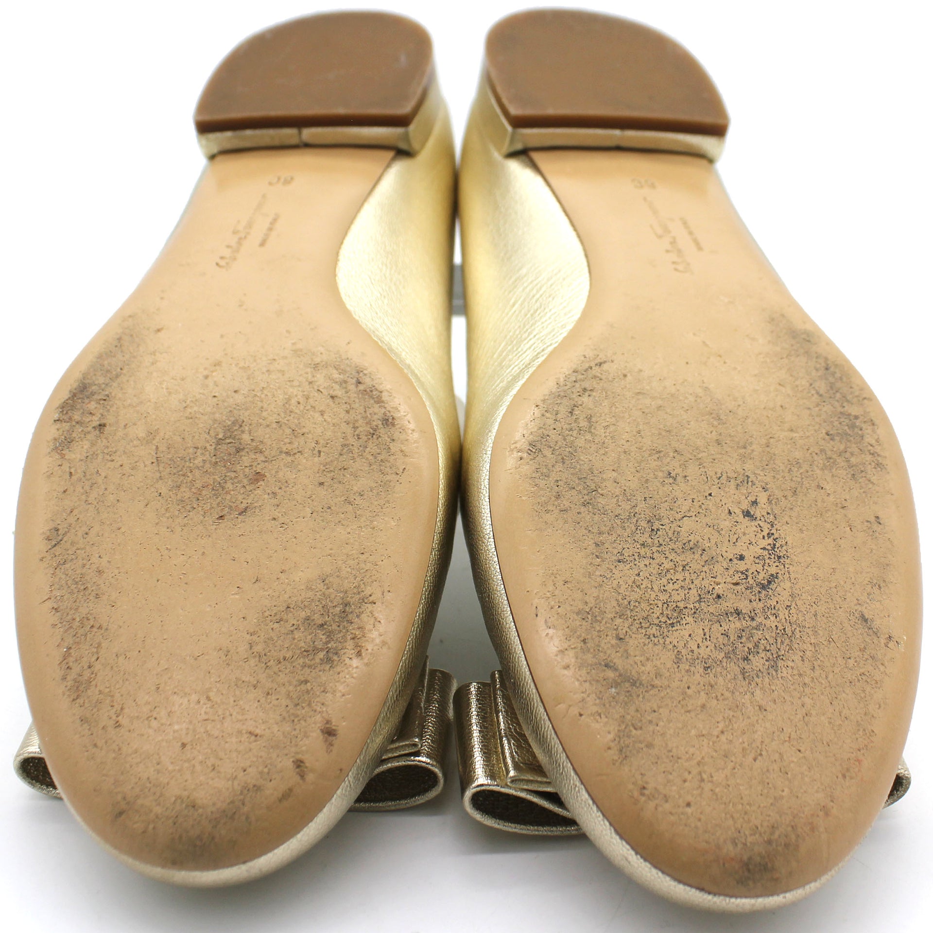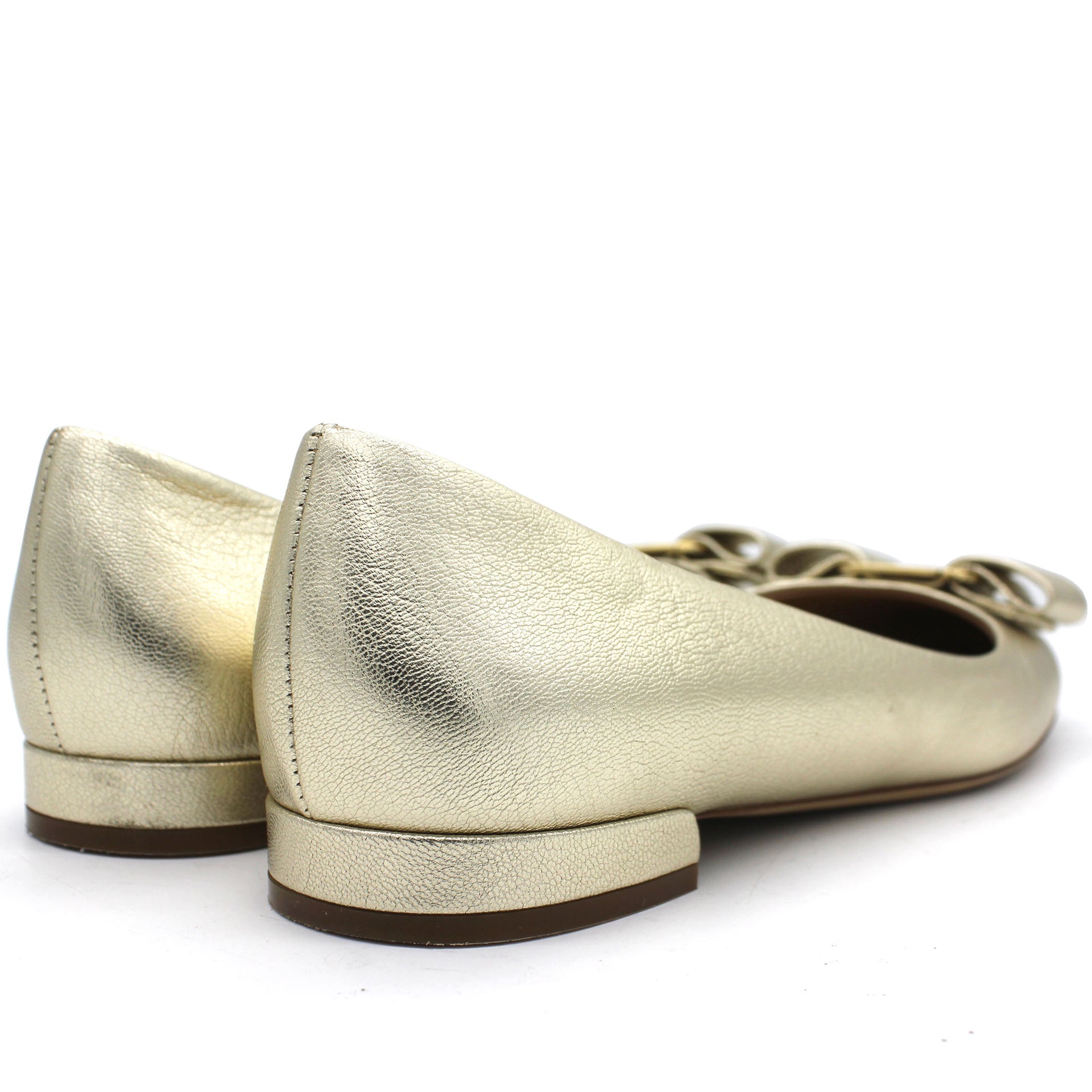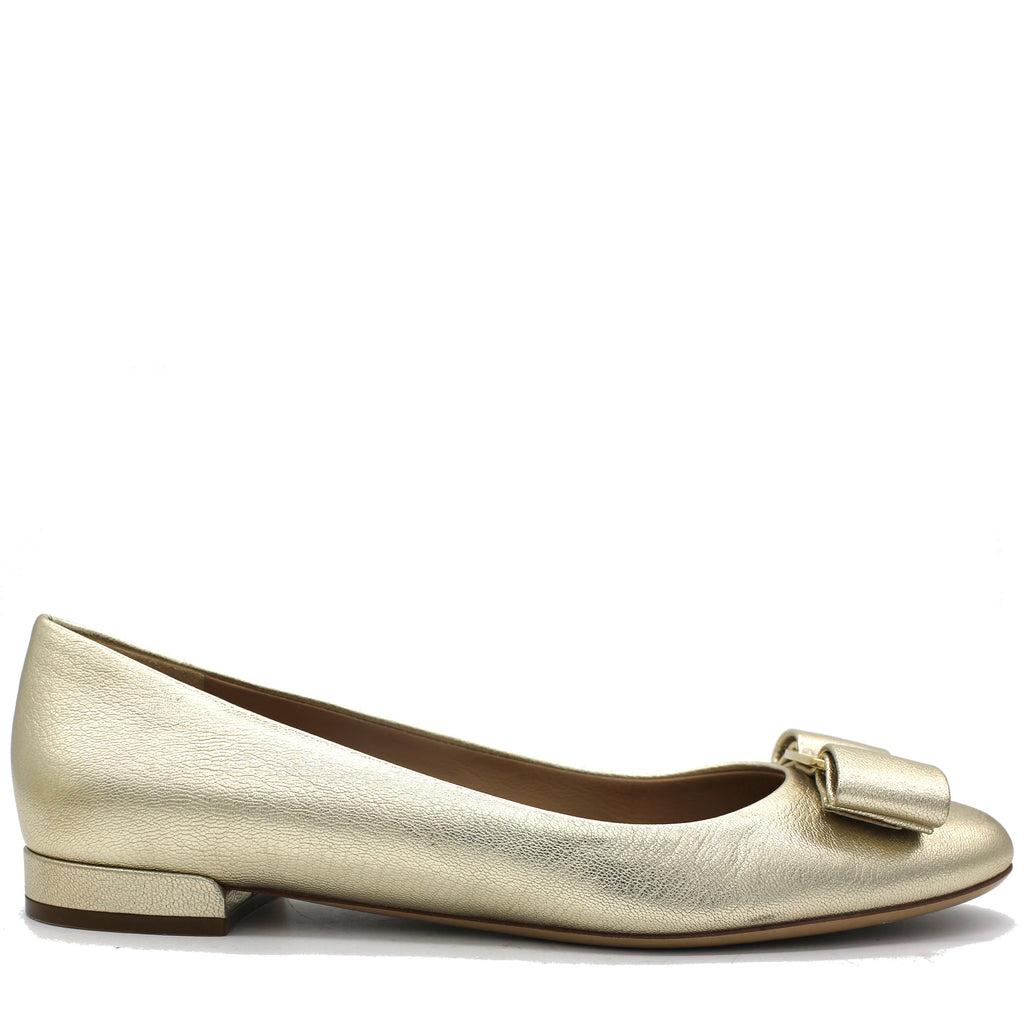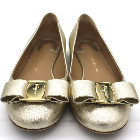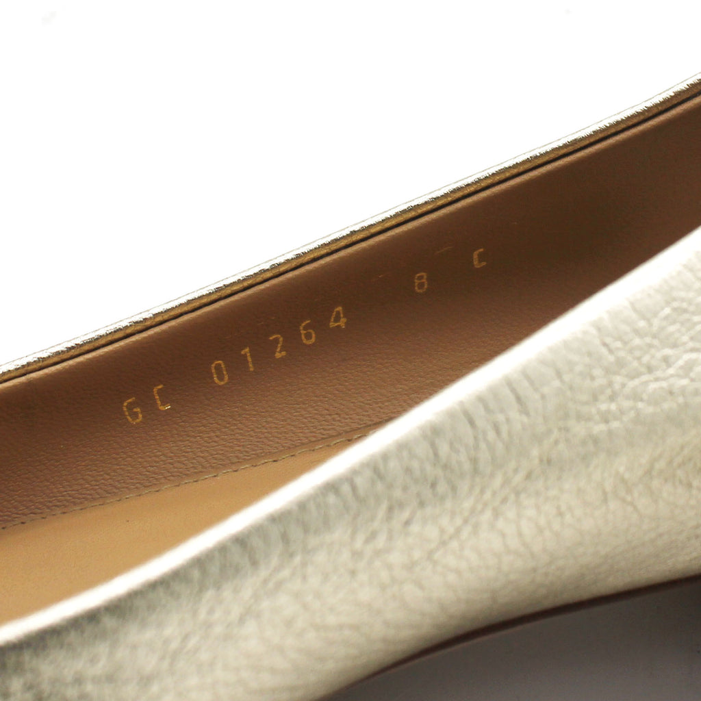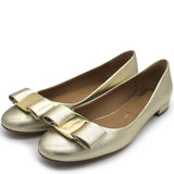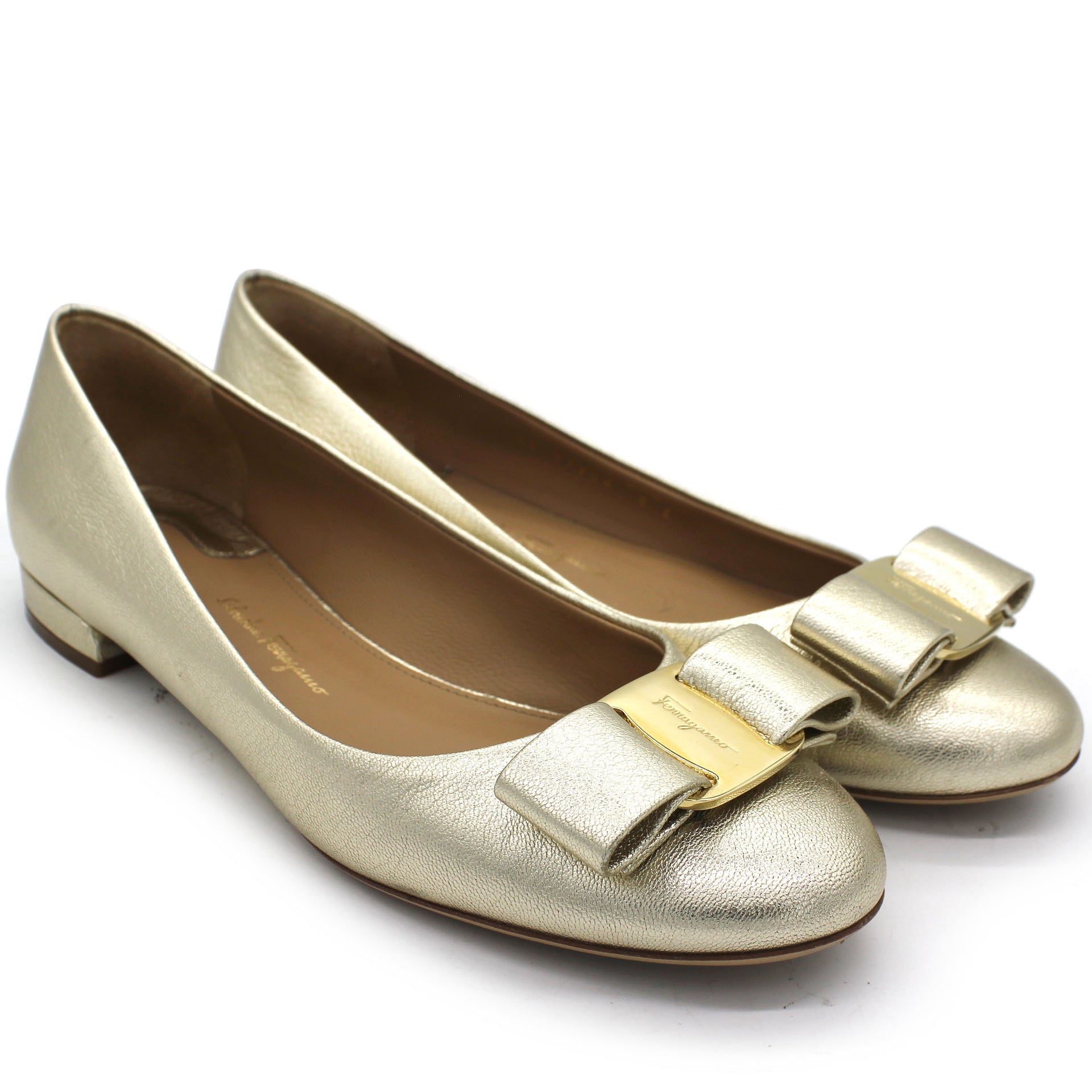 | Feel the admiring glances coming your way whenever you step out in this pair of gorgeous pumps from Salvatore Ferragamo. They've been crafted from metallic leather in a gold hue and styled with Vara bows on the uppers. The pumps carry almond toes and are beautifully balanced on 2 cm heels. |