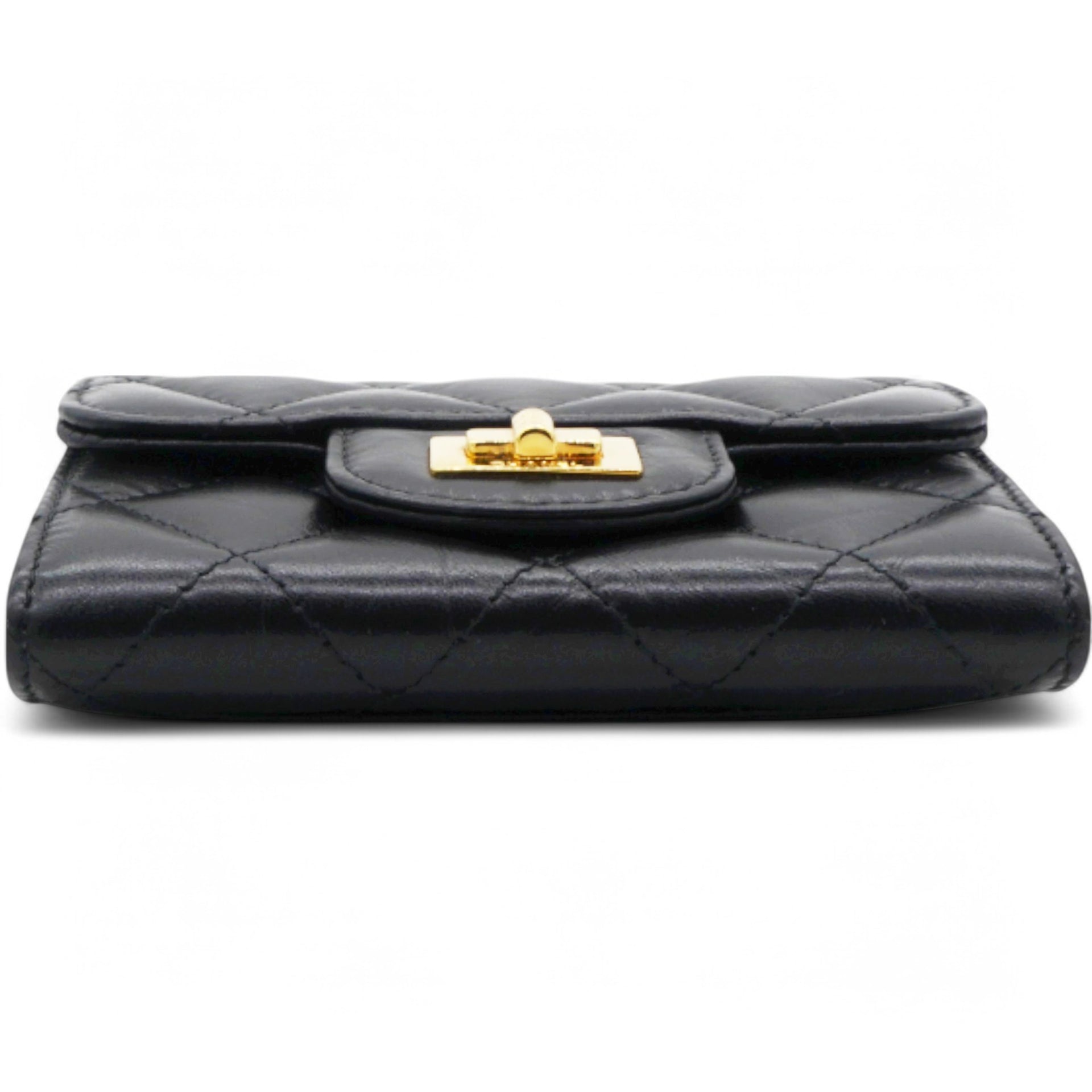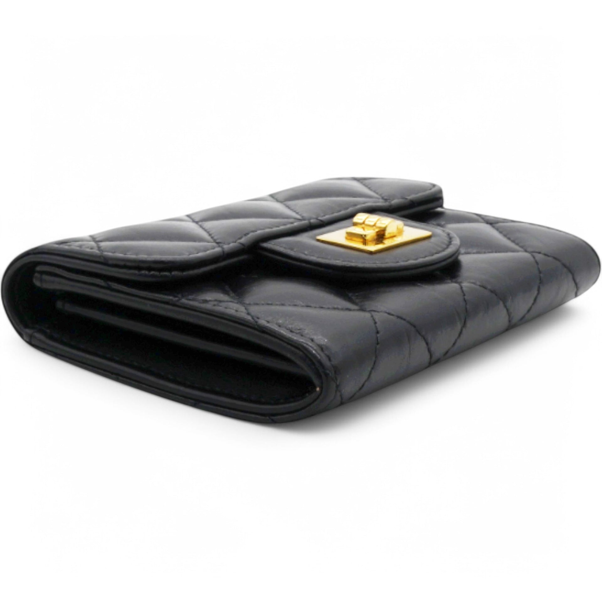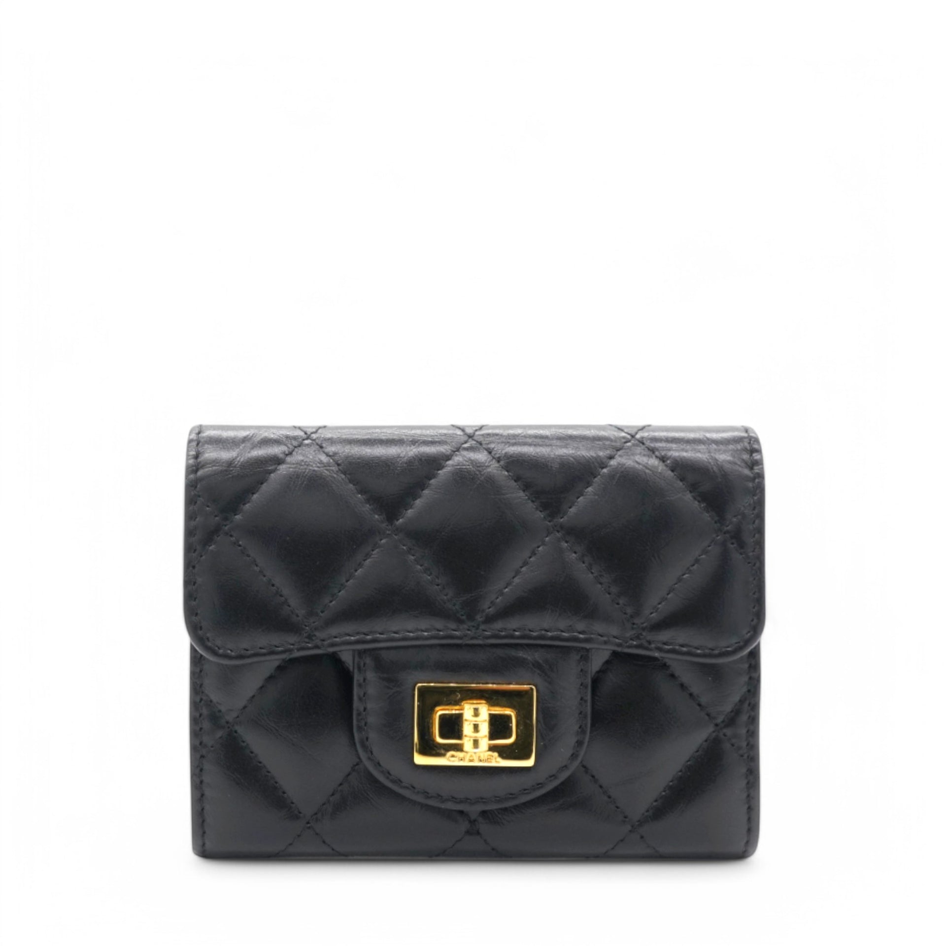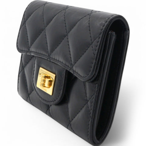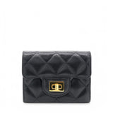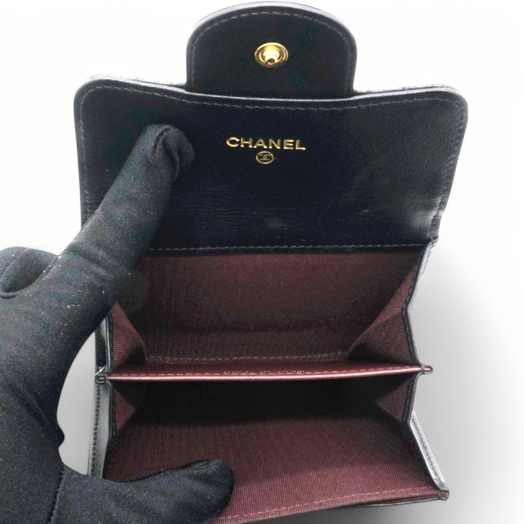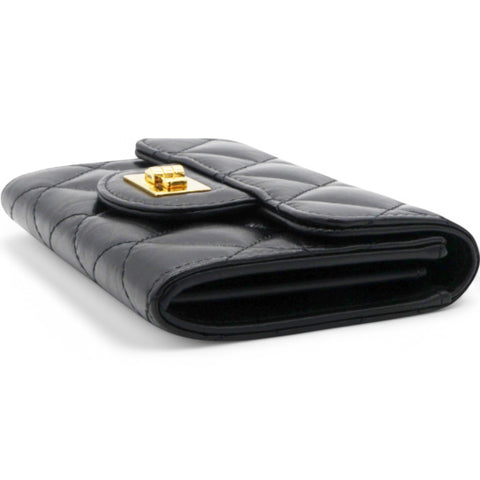 This stylish wallet is crafted of soft quilted calfskin leather in black and features a facing faux gold Mademoiselle turn lock. The wallet opens with a snap to a partitioned fabric interior.