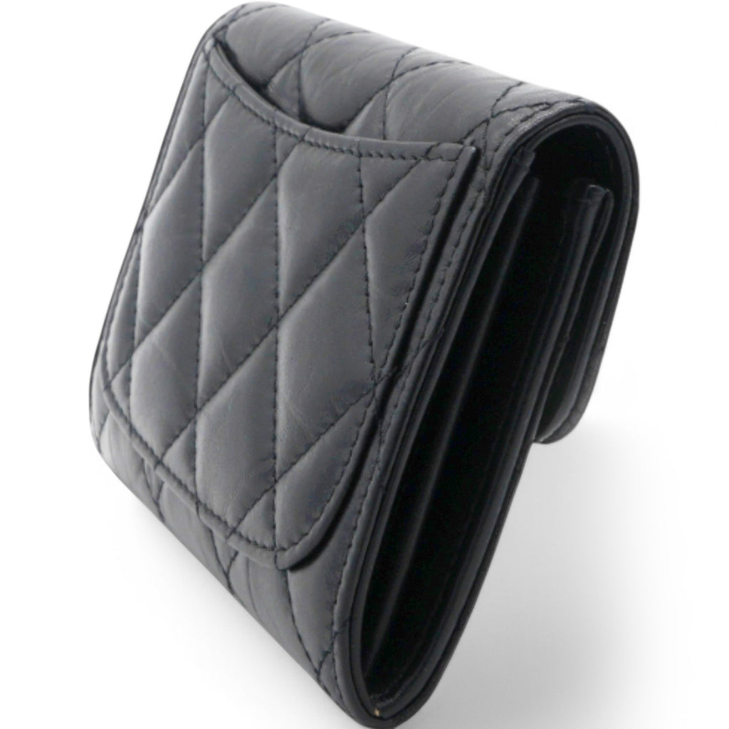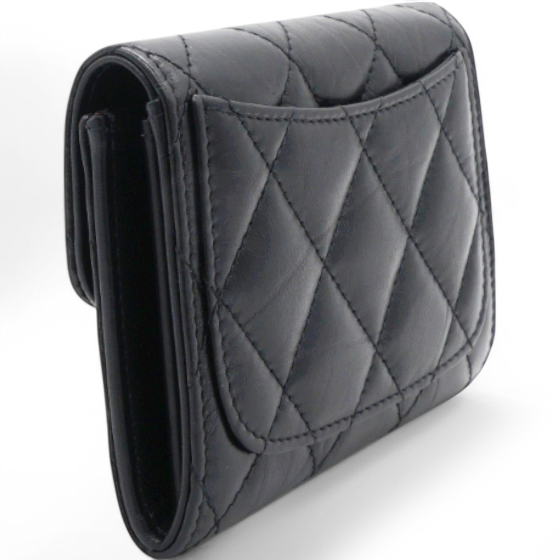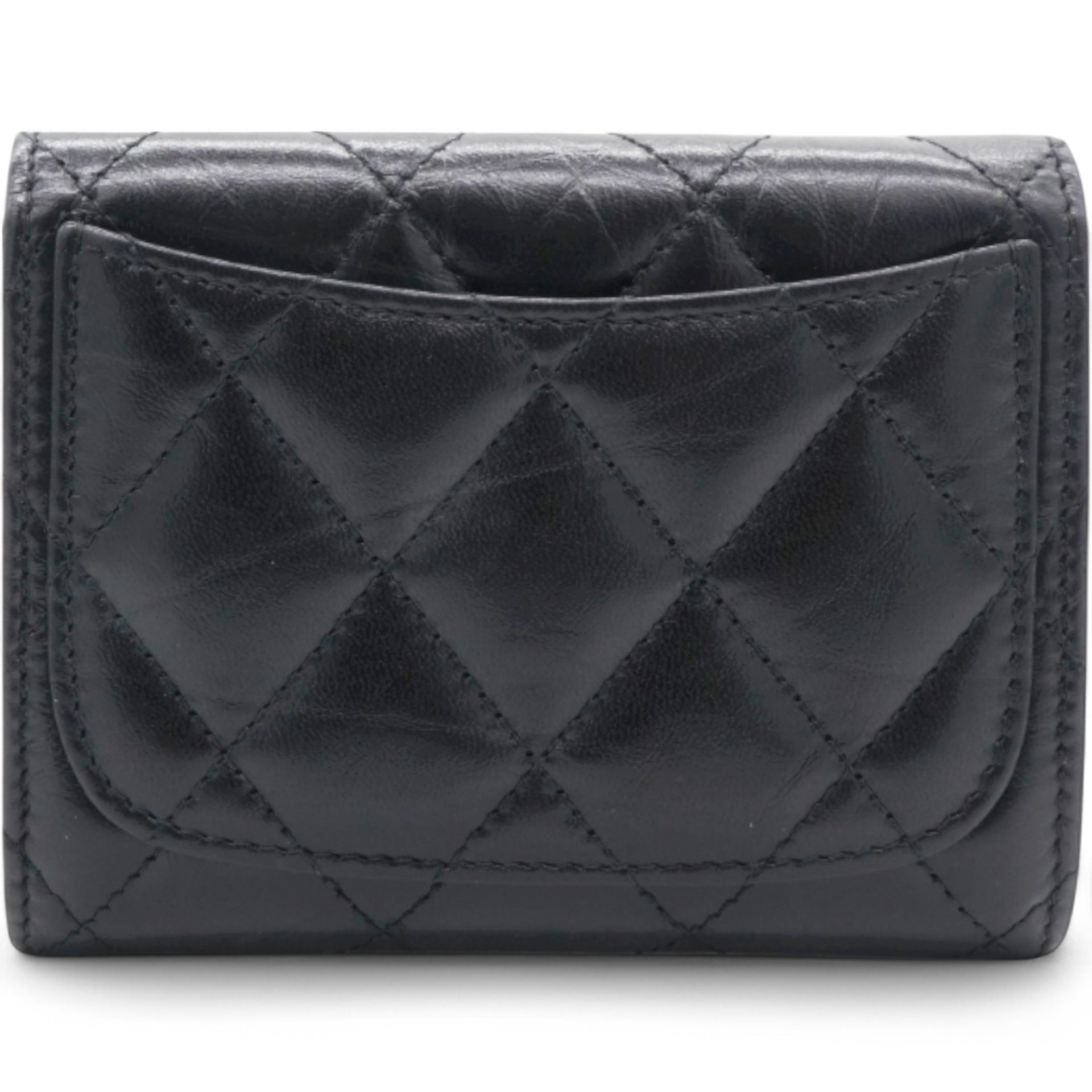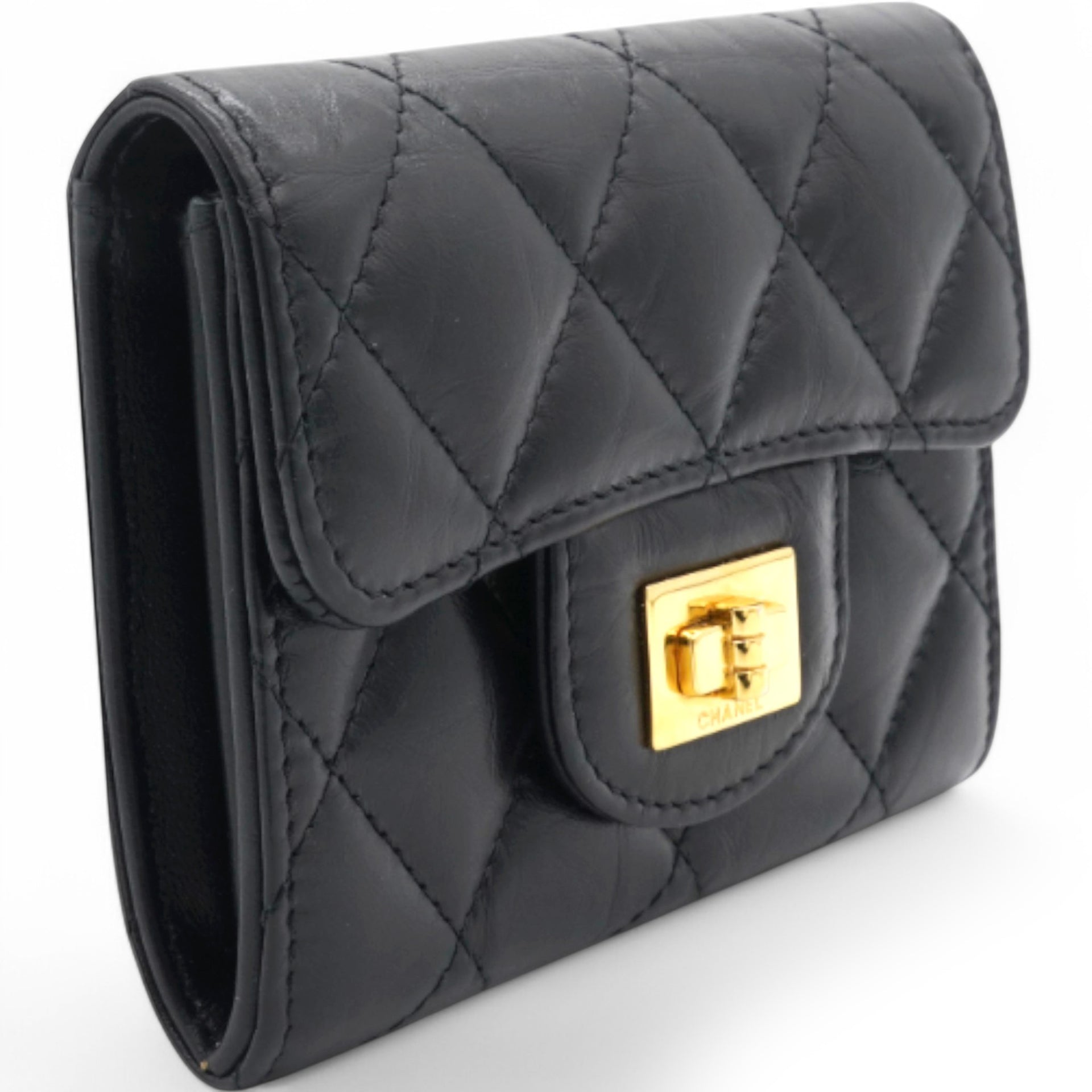 This stylish wallet is crafted of soft quilted calfskin leather in black and features a facing faux gold Mademoiselle turn lock. The wallet opens with a snap to a partitioned fabric interior.